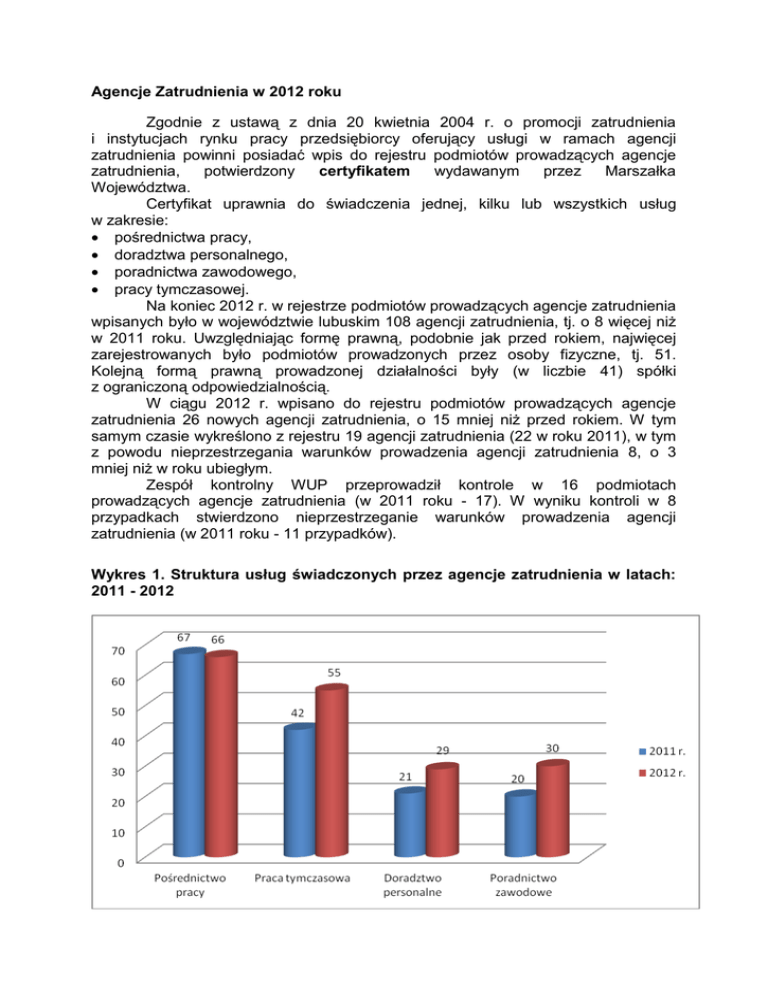 Agencje Zatrudnienia w 2012 roku Zgodnie z ustawą z dnia 20 kwietnia 2004 r. o promocji zatrudnienia i instytucjach rynku pracy przedsiębiorcy oferujący usługi w ramach agencji zatrudnienia powinni posiadać wpis do rejestru podmiotów prowadzących agencje zatrudnienia, potwierdzony certyfikatem wydawanym przez Marszałka Województwa. Certyfikat uprawnia do świadczenia jednej, kilku lub wszystkich usług w zakresie: pośrednictwa pracy, doradztwa personalnego, poradnictwa zawodowego, pracy tymczasowej. Na koniec 2012 r. w rejestrze podmiotów prowadzących agencje zatrudnienia wpisanych było w województwie lubuskim 108 agencji zatrudnienia, tj. o 8 więcej niż w 2011 roku. Uwzględniając formę prawną, podobnie jak przed rokiem, najwięcej zarejestrowanych było podmiotów prowadzonych przez osoby fizyczne, tj. 51. Kolejną formą prawną prowadzonej działalności były (w liczbie 41) spółki z ograniczoną odpowiedzialnością. W ciągu 2012 r. wpisano do rejestru podmiotów prowadzących agencje zatrudnienia 26 nowych agencji zatrudnienia, o 15 mniej niż przed rokiem. W tym samym czasie wykreślono z rejestru 19 agencji zatrudnienia (22 w roku 2011), w tym z powodu nieprzestrzegania warunków prowadzenia agencji zatrudnienia 8, o 3 mniej niż w roku ubiegłym. Zespół kontrolny WUP przeprowadził kontrole w 16 podmiotach prowadzących agencje zatrudnienia (w 2011 roku - 17). W wyniku kontroli w 8 przypadkach stwierdzono nieprzestrzeganie warunków prowadzenia agencji zatrudnienia (w 2011 roku - 11 przypadków). Wykres 1. Struktura usług świadczonych przez agencje zatrudnienia w latach: 2011 - 2012 W 2012 r. agencje zatrudnienia świadczące usługę pośrednictwa pracy na terenie Rzeczypospolitej Polskiej wpisały do prowadzonej przez siebie ewidencji 6007 osób poszukujących zatrudnienia lub innej pracy zarobkowej, tj. o 3362 osoby (o 127%) więcej niż przed rokiem. Większą grupę (podobnie jak przed rokiem) stanowili mężczyźni. Do ewidencji poszukujących zatrudnienia lub innej pracy zarobkowej wpisano 2953 kobiety, o 132,2% więcej niż przed rokiem. Za pośrednictwem podmiotów świadczących usługę pośrednictwa pracy na terenie RP, posiadających siedzibę w województwie lubuskim, w 2012 roku 200 osób podjęło zatrudnienie lub inną pracę zarobkową, tj. o 172 osoby (o 46,2%) mniej niż rok temu. Wśród podejmujących pracę 42% stanowiły kobiety, rok wcześniej było ich 49,7%. Podobnie jak przed rokiem najliczniejszą grupę zatrudnionych stanowiły osoby między 25 a 50 rokiem życia, tj. 60%. Osoby młode w wieku do 25 roku życia stanowiły 20% ogółu zatrudnionych. Osoby będące powyżej 50 roku życia również stanowiły 20% podejmujących za pośrednictwem agencji, zatrudnienie lub inną pracę zarobkową na terenie RP. Osoby, które podjęły pracę na podstawie stosunku pracy stanowiły 72,5% ogółu zatrudnionych w wyniku pośrednictwa agencji zatrudnienia, rok wcześniej grupa ta stanowiła 57,5%. Wśród tej populacji najliczniejszą grupę stanowiły, podobnie jak przed rokiem, osoby będące między 25 a 50 rokiem życia. O 46,2% osób mniej niż przed rokiem podjęło zatrudnienie lub inną pracę zarobkową. O 32,2% mniej niż w 2011 roku podjęło zatrudnienie na podstawie stosunku pracy. Najwięcej osób znalazło zatrudnienie na terenie Polski w następujących grupach elementarnych zawodów: pracownicy przy pracach prostych gdzie indziej niesklasyfikowani – 18, operatorzy maszyn do produkcji wyrobów papierniczych – 17 osób, pomoce i sprzątaczki biurowe, hotelowe i pokrewne – 17 osób, sprzedawcy sklepowi (ekspedienci) – 11 osób, spawacze i pokrewni – 9 osób. W 2012 roku agencje pośrednictwa pracy skierowały do pracy za granicą u pracodawców zagranicznych 624 osoby - o 479 osób mniej niż przed rokiem. W populacji tej liczniejszą grupę stanowiły kobiety, tj. 53,4% ogółu zatrudnionych za granicą (w 2011 roku była przewaga mężczyzn – stanowili 57,1%). W omawianym roku najwięcej osób podjęło pracę za granicą u pracodawców zagranicznych w okresie od 3 miesięcy do 12 miesięcy – 341 osób. Rok wcześniej najwięcej osób podjęło pracę również w takim okresie i było ich 661. W 2012 roku najmniej osób zostało skierowanych do pracy za granicą na okres powyżej 1 roku – 46 osób (w 2011 roku – 105 osób). Najwięcej osób znalazło zatrudnienie za granicą jako robotnicy pomocniczy przy pracach polowych – 313 osób, pracownicy domowej opieki osobistej – 139 osób. W roku 2011 najliczniejszą grupę stanowiły osoby zatrudnione za granicą w charakterze pakowaczy – 421 osób. Kraje do których agencje zatrudnienia w 2012 roku kierowały osoby do pracy to: Austria – 118 osób, Niderlandy – 356 osób, Niemcy – 140 osób, Wielka Brytania – 10 osób. W roku 2011 także najwięcej osób podjęło zatrudnienie w Niderlandach – 827 osób; w Austrii – 95 osób, Niemczech – 10 osób. W 2012 r. 125 pracodawców skorzystało z usług agencji doradztwa personalnego, tj. o 13 mniej niż przed rokiem. Liczba pracodawców korzystających z doradztwa personalnego w zakresie poszczególnych usług: 1) prowadzenia analizy zatrudnienia u pracodawców, określania kwalifikacji pracowników i ich predyspozycji oraz innych cech niezbędnych do wykonywania określonej pracy – 16 (w 2011 r. – 10), 2) wskazywania źródeł i metod pozyskiwania kandydatów na określone stanowiska pracy – 12 (w 2011 r. – 15), 3) weryfikacji kandydatów pod względem oczekiwanych kwalifikacji i predyspozycji – 97 (w 2011 r. – 113). Agencje zatrudnienia świadczyły usługi poradnictwa zawodowego w zakresie: 1) pomocy w wyborze odpowiedniego zawodu i miejsca zatrudnienia – 4234 osoby – o 322% więcej niż przed rokiem (w 2011 roku – 1003 osoby). Wśród nich przeważały osoby w grupie wiekowej do 25 roku życia (przed rokiem osoby między 25 a 50 rokiem życia), 2) informacji niezbędnyc