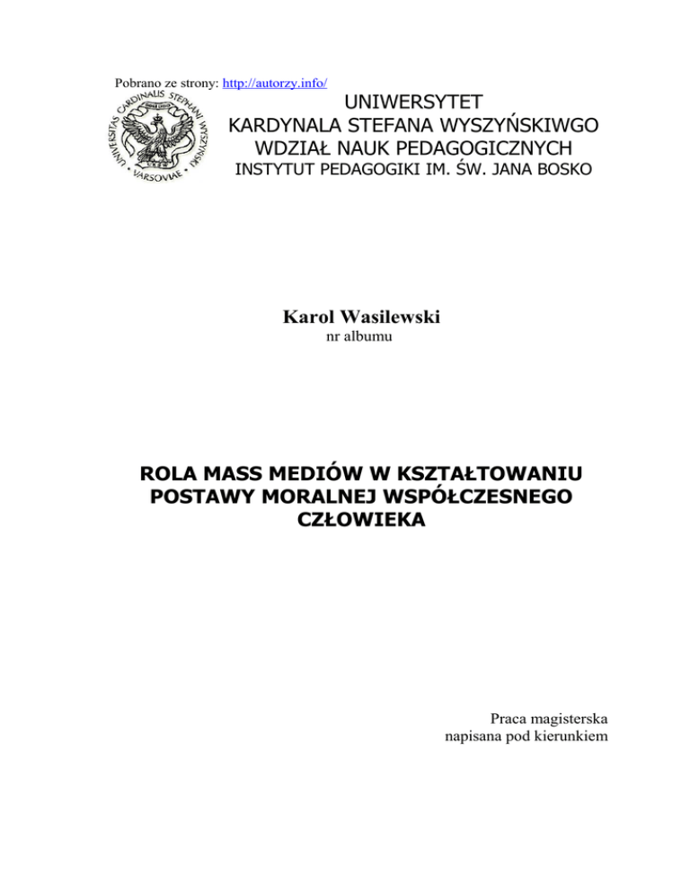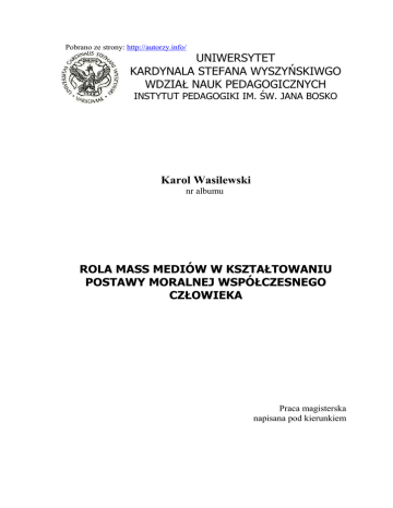 Pobrano ze strony: http://autorzy.info/ UNIWERSYTET KARDYNALA STEFANA WYSZYŃSKIWGO WDZIAŁ NAUK PEDAGOGICZNYCH INSTYTUT PEDAGOGIKI IM. ŚW. JANA BOSKO Karol Wasilewski nr albumu ROLA MASS MEDIÓW W KSZTAŁTOWANIU POSTAWY MORALNEJ WSPÓŁCZESNEGO CZŁOWIEKA Praca magisterska napisana pod kierunkiem Warszawa 2009 STRESZCZENIE 2 SPIS TREŚCI WSTĘP…………………………………………………………………………........................... Rozdział I. Wyjaśnienie pojęć i przedstawienie kategorii programów 1.1. Pojęcia moralności i mass mediów 1.2. Kategorie współczesnych programów 1.3. Przybliżenie sylwetki wybranych programów Rozdział II. Sposoby oddziaływania mass mediów na współczesnego człowieka 2.1. Dostęp do środków masowego przekazu 2.1.1. Statystyki dotyczące dostępu do mediów 2.1.2. Psychologiczna analiza dotycząca odbioru komunikatów pochodzących z mass mediów przez człowieka (jak człowiek się uczy? Poprzez obserwację rzeczywistości – media z rozdziału pierwszego strona 10 odwołanie do tego punktu) 2.1.3. Rola opiniotwórcza 2.2. Mass media a moralność 2.2.1. Nowe zagrożenia moralności wynikające z dostępu do mediów 2.2.2. Programy wpływające negatywnie na zachowanie człowieka 2.2.3. Programy wpływające pozytywnie na zachowanie człowieka Rozdział III. Kierunki rozwoju mass mediów 3.1. Problem maksymalizacji zysków 3.1.1. Przewidywane korzyści 3.1.2. Czyhające niebezpieczeństwa 3.1.3. Propozycje etyczne 3.2. Media w służbie osoby ludzkiej 3.2.1. Obrona wspólnego dobra 3.2.2. Służba prawdzie i wolności ZAKOŃCZENIE…………………………………………………………………………………. WYKAZ LITERATURY………………………………………………………………………… ANEKSY…………………………………………………………………………………………. 3 WSTĘP 4 Rozdział I Wyjaśnienie programów. 1.1 pojęć i przedstawienie kategorii Pojęcia moralności i mass mediów. Zdefiniowanie moralności jest bardzo trudnym zadaniem, tym bardziej, że każdy ma własne jej pojęcie. Wielu naukowców sprzecza się miedzy sobą na jakiej zasadzie została ona wykształcona u człowieka, czy jest wrodzona, czy nabyta, czy jest pierwiastkiem duchowym, czy mniej lub bardziej uświadomionym kompromisem egoizmu wobec otaczającego świata, by żyć łatwiej i choć muszę przyznać, że to ciekawe rozważania, to jednak nie one są tematem mojej pracy. W encyklopedii WIEM 2007 możemy przeczytać, że moralność to: „ogół norm, zasad, ocen, wzorów, ideałów - zmierzających do regulowania stosunków pomiędzy ludźmi (jednostka - grupa, grupa – grupa). Całokształt zachowań jednostki lub grupy społecznej oceniany wg funkcjonującego systemu norm, zasad moralnych. Ocena moralna czynu ludzkiego wiąże się ściśle z motywem, który skłonił człowieka do podjęcia danego czynu. Np. pomaganie komuś jest tylko wówczas czynem moralnym, gdy podejmowane jest dla realizowania zasady moralnej i z własnej woli.”1 Problem jednak polega na tym, że w pytaniu o moralność nie chodzi o podanie dokładnej definicji, ale o odpowiedź dlaczego mamy podporządkować się jej zasadom 2. Tutaj z pewną pomocą przychodzi nam druga definicja którą chciałbym przytoczyć: „Etyka(z greckiego éthikós – zwyczajny; éthos – obyczaj, zwyczaj). 1 2 Encyklopedia WIEM 2007, hasło moralność Por. Przewodnik po etyce, red. Peter Singer, Warszawa 2000, s. 29 5 1. zespół norm i ocen moralnych charakterystycznych dla danej zbiorowości społ. (np. grupy społecznej, klasy, warstwy, środowiska); 2. filozoficzna nauka o moralności, zajmująca się wyjaśnieniem i ustalaniem takich kategorii, jak dobro i zło, odpowiedzialność, sumienie, powinności oraz wytyczaniem zasad i norm moralnego postępowania. Dzieli się na aksjologię (teorię wartości) i deontologię (naukę o powinnościach).”3 Z premedytacją sięgnąłem do tej samej encyklopedii by na jej przykładzie pokazać, że etyka w stosunku do moralności jest czymś szerszym. Etyka jest teorią, a moralność jest praktyką. Od początku ludzkość boryka się z różnymi problemami natury moralnej. Jednak dopiero w IV w p.n.e. Arystoteles wprowadził termin etyka (jednak wówczas odnosiło się ono do etosu jako ludzkiego charakteru) 4. To co zapoczątkował miało na początku charakter nauki o szczęściu – eudajmonii i cnocie – arete. Ówczesne szkoły filozoficzne szukały tych dwóch najważniejszych celów życia człowieka np. w hedonizmie (cyrenaicy) w realizowaniu cnót (cynicy) 5. Późniejsza etyka średniowieczna była teocentryczna – jej głównymi przedstawicielami są Św. Augustyn i Św. Tomasz z Akwinu. Można napisać niejedną pracę na ten temat. Łatwo jednak odnaleźć to co wyróżnia naukę etyczną tych świętych od ich greckich poprzedników. Święty Augustyn czerpał z nauk Sokratesa i Platona. Skoncentrował się na wytłumaczeniu istnienia zła i predyspozycji do czynienia dobra, jako niezasłużonej łaski pochodzącej od Boga. Święty Tomasz natomiast idąc tokiem rozumowania Arystotelesa w swojej filozofii moralnej twierdzi, że każde dobro ma swoją wartość, czy jest ono małe czy duże i ważne jest by rozum pomógł w zapanowaniu człowieka nad jego chciwością i egoizmem i pozwolił to dobro wybierać. U obu tych myślicieli ważna jest motywacja czynów, dla których warto dobrze postępować (bo jak wiadomo nie jest to proste zadanie). Największe szczęście jest w odnalezieniu i poznaniu Boga6. 3 Encyklopedia WIEM 2007, hasło etyka Por. Powszechna Encyklopedia PWN, Warszawa 2005, hasło etyka 5 Por. Przewodnik po etyce, red. Peter Singer, Warszawa 2000, s. ??? 6 Por. Alban McCoy, Etyka chrześcijańska, Poznań 2007, str. 189 4 6 Późniejsze systemy etyczne zaczynają się koncentrować na innych aspektach życia moralnego. Chodzi bar