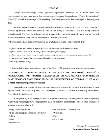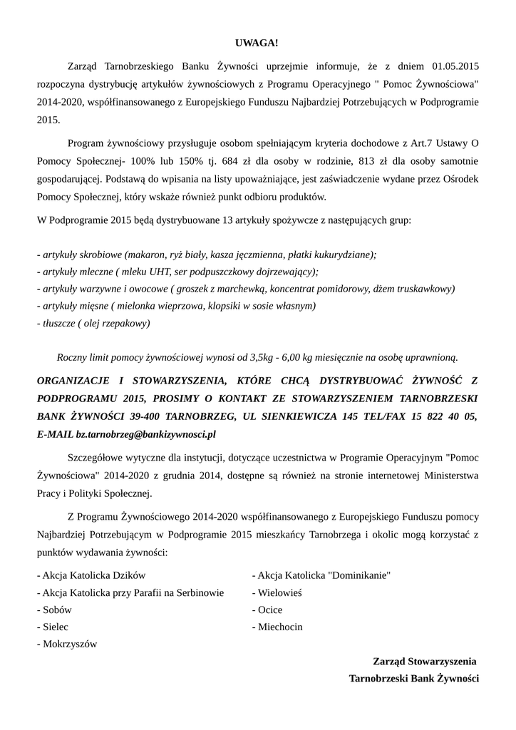 UWAGA! Zarząd Tarnobrzeskiego Banku Żywności uprzejmie