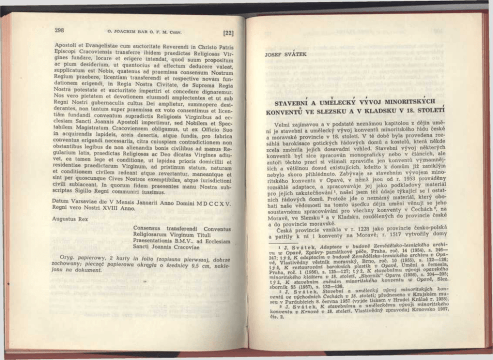 298 O . J O A C H IM B A R O . F . M . C o n v . [22] Apostoli et Evangelistae cum auctoritate Reverendi in Christo Patris Episcopi Cracoviensis transferre ibidem praedictas Religiosas Virgines fundare, locare et erigere intendat, quod suum propositum ac pium desiderium, ut ąuantocius ad effectum deducere valeat, supplicatum est Nobis, ąuatenus ad praemissa consensum Nostrum Regium praebere, licentiam transferendi et respective novam fundationem erigendi, in Regia Nostra Civitate, de Suprema Regia Nostra potestate et auctoritate impertiri et concedere dignaremur. Nos vero pietatem et devotionem eiusmodi amplectentes et ut sub Regni Nostri gubernaculis cultus Dei amplietur, summopere desiderantes, non tantum super praemissa ex voto consentimus et licentickm fundandi conventum supradictis Religiosis Virginibus ad ecclesiam Sancti Joannis Apostoli impertimur, sed Nobilem et Spectabilem Magistratum Cracoviensem obligamus, ut ex Officio Suo in acąuirendis lapideis, areis desertis, atąue fundis, pro fabrica conventus erigendi necessariis, citra cuiuspiam contradictionem non obstantibus legibus de non alienandis bonis civilibus ad manus Regularium latis, praedictas Religiosas ac Deo dicatas Virgines adiuvet, ea tamen lege et conditione, ut lapidea prioris domicillii et residentiae praedictarum Virginum, ad pristinum statum, naturam et conditionem civilem redeant atąue revertantur, maneantąue et sint per ąuoscunąue Cives Nostros exemptibiles, atąue iurisdictioni dvili subiaceant. In ąuorum fidem praesentes manu Nostra subscriptas Sigillo Regni communiri iussimus. Datum Varsaviae die V Mensis Januarii Anno Domini M D C C X V. Regni vero Nostri XVIII Anno. Augustus Rex Consensus transferendi Conventus Religiosarum Virginum Tituli Praesentationis ad Ecclesiam Sancti Joannis Cracoviae Oryg. papierowy, 2 karty in folio (zapisana pierwsza), dobrze zachowany; pieczęć papierowa okrągła o średnicy 9,5 cm, nakle jona na dokument. JO SEF SY ATEK STAVEBNI A UMELECKY VYVOJ MINORITSKYCH KONVENTU VE SLEZSKU A V KLADSKU V 18. STOLETI Velmi zajimavou a v podstate neznźmou kapitolou z d£jin umeni je stavebni a umelecky vyvoj konventu minoritskeho radu ćeske a moravske provincie v 18. stoleti. V te dobe była provedena rozsahla barokisace gotickych fadovych domu a kostelu, ktera nekde zcela zmenila jejich dosavadni vzhled. Stavebni vyvoj nekterych konventu byl sice zpracovan monograficky nebo v ćlancich, ale autori techto prąci si vśxmali zpravidla jen konventu vyznamnejśich a vetśinou dosud existujicich, kdeżto k domum jiż zaniklym nebylo skoro prihlednuto. Zabyvaje se stavebnim vyvojem mino ritskeho konventu v Opave, v nśmż jsou od r. 1953 provadśny rozsahle adaptace, a zpracovavaje jej jako podkladovy materiał pro jejich uskutećńovani *, naśel jsem też udaje tykajici se i ostat nich rśdovych domu. Protoźe jde o neznamy materiał, ktery obohati naśe v£domosti na tomto ujedku dejin umeni venuji se jeho soustavnemu zpracovavani pro v§echny konventy v Cechach \ na Morav6, ve Slezsku * a v Kladsku, rozdelenych do provincie ćeske a do provincie moravske. Ceska provincie vznikla v r. 1228 jako provincie ćesko-polska a patrily k ni i konventy na Moravś; r. 1517 vytvorily domy 1 J. S v ś t e k , A d a p ta c e v bud ov6 Z e m id S ls k o -le s n ic k ih o arch i v u w O p a v (, Zprśvy- p am ń tk ovś p eće, P raha, roć. 14 (1954), s. 246— 247; t y ź, K a d a p ta cim v b u d o v6 Z e m ć d ć lsk o -le sn ic k e h o a rch ivu v O p a v 6 , V la stiv ed n y vSstnik m oravsk y, B rno, roć. 10 (1955), s. 122—126; t y i , K re s ta u ro v d n i ba ro k n ich p la s tik v O p a v ś, U m śn i a rem esla, P raha, roć. 1 (1956), s. 125— 127; t y ź , K sta veb n (m u v y v o j i o p a vsk ćh o m in o ritsk ć h o k la ś te ra v 18. s to le ti, „Sbornik” O pava (1956), s. 204— 205; t y ź , K s ta v e b n im zn en a m m in o ritsk e h o k o n v e n tu w O pav6, S lez. sbornik 55 (1957), s. 132—136. 2 J . S v ś t e k, S ta v e b n i a um & lecky v y v o j m in o ritsk y c h k o n v e n t i v e v yc h o d n ic h C echach v 18. s to le ti; p redn eseno v K rajsk em m u seu v P ard ubicich 8. ćervna 1957 (vyjd e tisk em v H radci K ralae r. 1958). 3 J . S v ś t e k , K sta v e b n im u a u m g leck ćm u v y v o j i m in o ritsk e h o k o n v e n tu v K rn o v 6 v 18. s ta le ti, V la stiv śd n y zpravodaj K rnovsko 1957, Cis. 2. 300 JO S E F SV A T E K [2] v Polsku samostatnou provincii, zatim co domy na Morave były pnćleneny k provincii rakouske, od niż se osamostatnily v r. 1732. Tato ćeska provincie, jeż se spojila s moravskou provincii na ka pitule konane v srpnu 1822 v Brne v jednu provincii ćesko-moravsko-slezskou, obsahovala v 18. stoi. kustodii prażskou (s konventy v Praze, Litomericich, Moste, Kadani, Mlade Boleslavi a s residenci v Jilovem), kralovehradeckou (Hradec Kralove, Pardubice a Kladsko, od r. 1776 misto Hradce Kukleny), krumlovskou (Cesky Krumlov, Horażdovice a Stribro) a vratislavskou. Kustodie vratislavska mela konventy ve Vratislavi, Svidnici, Lemberku a ve Strede; v r. 1694 ztratila konvent ve Zlate Horę 4, ktery byl pripojen k saske provincii. R. 1725 ziskala konventy v Opoli a v Bytomi, ktere, należejice kdysi k ćesko-polske provincii, patrily nyni pres 200 let k provincii polske; od r. 1726 byl tedy porad slezskych domu ćeske provincie tento: Vratislav, Svidnice, Opoli, Bytom, Lemberk a Streda. Moravska provincie, vznikla v r. 1732 odloućenim od rakouske provincie, mela kustodie sv. Antonina (Brno, Olomouc a Jihlava), sv. Bonaventury (Opava, Unićov a Krnov) a sv. Ludvika Tolosanskeho (Horni Hlohov, Vladislav a Koźli). Ke konventum v Praze, Ceskśm Krumlove, V ratislavi5, Olomouci a v Opave były pnćleneny konventy klarisek. R. 1754 doślo k odpojeni konventu obou provincii, umistenych v mestech, jeż była postoupena Prusku. Pro ćeskou provincii se tak stało na kapitule konane v srpnu 1754 v Hradci Kralove ;a pro mor