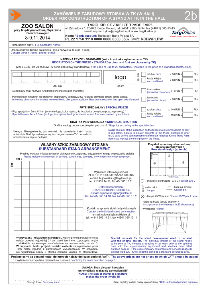 2b ZAMÓWIENIE ZABUDOWY STOISKA W TK (W HALI) ORDER FOR CONSTRUCTION OF A STAND AT TK IN THE HALL TARGI KIELCE / KIELCE TRADE FAIRS ZOO SALON przy Miêdzynarodowej Wystawie Psów Rasowych 8-9.11.2014 ul. Zak³adowa 1, 25-672 Kielce, Poland, tel.(+4841) 365-12-94, fax (+4841) 365-13-15 e-mail: [email protected], www.targikielce.pl Konto / Bank account: Raiffeisen Bank Polska SA PL 22 1750 1110 0000 0000 0568 3537 Swift: RCBWPLPW Pe³na nazwa firmy / Full Company Name: Osoba odpowiedzialna za stoisko (imiê i nazwisko, telefon, e-mail) Contact person (name, phone, e-mail) NAPIS NA FRYZIE - STANDARD (kolor i czcionka wybrane przez TK) INSCRIPTION ON THE FRIEZE - STANDARD (colour and font are choosen by TK) (2m x 0,3m - do 20 znaków - w cenie zabudowy standardowej / 2m x 0,3 m - up to 20 characters - included in the price of a standard construction). x 90 PLN = PLN ka¿de kolejne each additional x 60 PLN = PLN - Dodatkowy znak na fryzie / Additional inscription (per character) iloœæ znaków (amount of characters) x 4 PLN = PLN - Przy stoiskach naro¿nych lub czo³owych proponujemy dodatkowy fryz na drug¹ lub trzeci¹ otwart¹ stronê stoiska / In the case of corner or front stands we would like to offer you an additional frieze on the second or third open side of a stand iloœæ sztuk (amount of pieces) x 90 PLN = PLN sztuka / piece x 140 PLN = PLN ka¿dy kolejny each additional x 120 PLN = PLN 200 cm 30 cm sztuka / piece logo 90 cm FRYZ SPECJALNY / SPECIAL FRIEZE - Fryz specjalny - 2m x 0,3m - (w formie logo, kolor napisu, t³a i czcionka do wyboru przez wystawcê) / Special frieze - 2m x 0,3m - (as logo, inscription, background colours and font are choosen by exhibitor) GRAFIKA INDYWIDUALNA / INDIVIDUAL GRAPHICS Grafika wed³ug zleceñ specjalnych - patrz str. 6 / Graphics according to the special orders Uwaga: Niewype³nienie, jak równie¿ nie przes³anie treœci napisu w terminie 30 dni przed rozpoczêciem targów zwalnia TK z obowi¹zku umieszczania napisu na fryzie. Note: The lack of the inscription on the frieze makes it impossible to cary it into effect. Failure to deliver contents of the frieze inscriptions prior to 30 days before commencement of the fair releases Kielce Trade Fairs from duty to place the inscription on the frieze. Przyk³ad zabudowy standardowej stoiska szeregowego / Row stand design (example) W£ASNY SZKIC ZABUDOWY STOISKA SUBSTANDARD STAND ARRANGEMENT 1m 1m Prosimy wskazaæ miejsca gniazdek elektrycznych, zaplecza, lady,gabloty i innego wyposa¿enia stoiska Please indicate arrangement of sockets, subsidiares, counters, show cases and other equipment. Wszelkich informacji udziela ZESPÓ£ PROJEKTOWANIA STOISK e-mail: [email protected], tel. 41/ 365 14 10, fax 41/ 365 13 11 Detailed information STAND DESIGNING SECTION e-mail: [email protected], tel. +4841/ 365 14 10, fax +4841/ 365 13 11 FRYZ / FRIEZE - gniazdko elektryczne 230 V / socket 230 V - kosz na œmieci / rubbish bin - wieszak / hanger 2 - lampa 75 W na 4 m / lamp 75 W per 4 sqm - napis na fryzie (do 20 znaków) / inscription on the frieze (up to 20 characters) Kontakt w sprawie stoisk indywidualnych Contact the individual stand construction: e-mail: [email protected], tel. +4841 365 14 51, fax +4841 365 13 11 W przypadku indywidualnej aran¿acji, w³asny projekt aran¿acji stoiska nale¿y przes³aæ najpóŸniej 21 dni przed terminem rozpoczêcia targów z dok³adnie wype³nionym zamówieniem na wyposa¿enie, na str. 3. W przypadku braku projektu stoisko zostanie zaprojektowane przez Targi Kielce zgodnie z zamówionym wyposa¿eniem. W przypadku nie wype³nienia strony 3 stoisko zostanie uznane za standardowe. - wyk³adzina / carpet Special requests for the stand development need to be sent with the original project. The individual project of the stand needs to be sent to TK, meeting a deadline of 21 days prior to the opening date with the supplementary equipment and services order filled out (see page 3). If the supplementary equipment and services (page 3) are not filled out, TK will treat the stand as a standard developed area. Podane ceny s¹ cenami netto, do których nale¿y doliczyæ podatek VAT* / The above prices are net prices to which VAT* should be added * z wy³¹czeniem przypadków opisanych na 1 stronie / * excluding the cases described on page 1 UWAGA: Brak pieczêci i podpisu uniemo¿liwia realizacjê zamówienia!!!/ NOTE: The lack of stamp or signature makes the order invalid !!! Pieczêæ firmy / Company stamp Data, czytelny podpis osoby upowa¿nionej / Date, authorised person’s signature