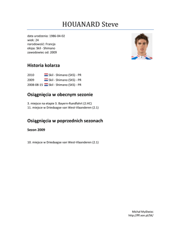 HOUANARD Steve data urodzenia: 1986-04-02 wiek: 24 narodowość: Francja ekipa: Skil - Shimano zawodowiec od: 2009 Historia kolarza 2010 2009 2008-08-15 Skil - Shimano (SKS) - PR Skil - Shimano (SKS) - PR Skil - Shimano (SKS) - PR Osiągnięcia w obecnym sezonie 3. miejsce na etapie 3. Bayern-Rundfahrt Rundfahrt (2.HC) 11. miejsce w Driedaagse van West West-Vlaanderen (2.1) Osiągnięcia w poprzednich sezonach Sezon 2009 10. miejsce w Driedaagse van West West-Vlaanderen (2.1) Michał Myśliwiec http://fff.xon.pl/SK/ http://fff.xon.pl