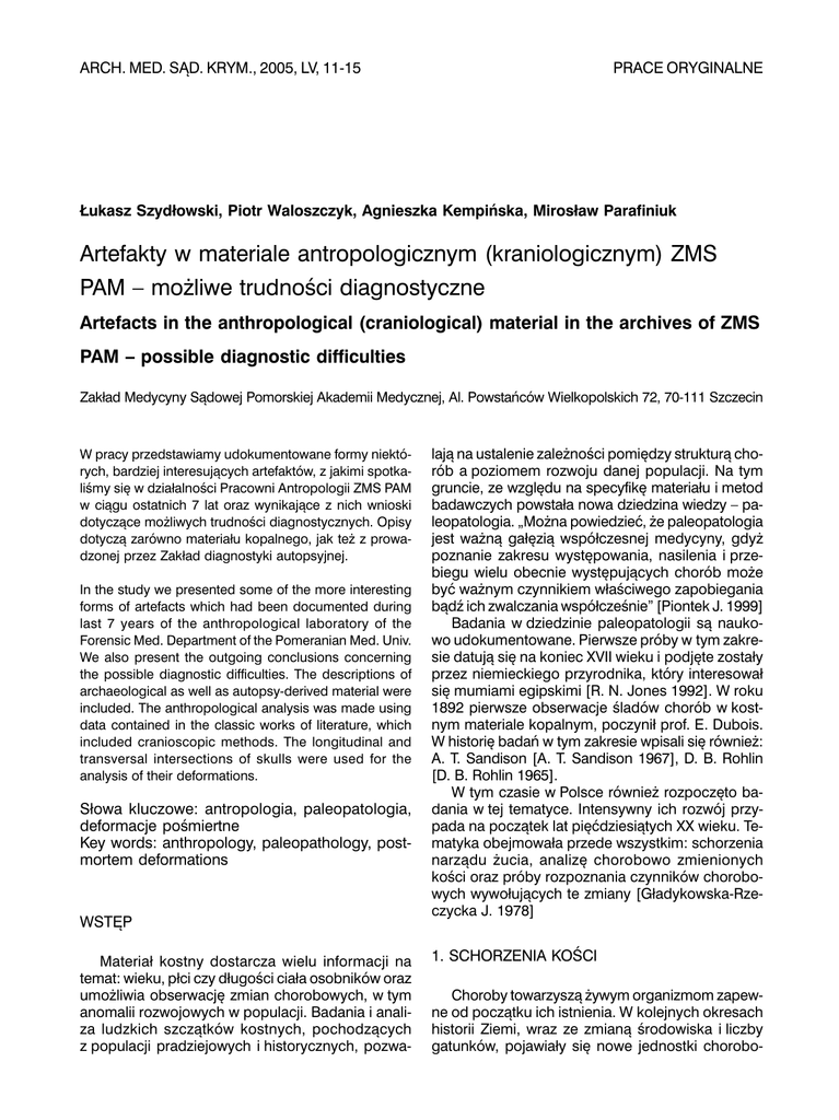 ARCH. MED. SĄD. KRYM., 2005, LV, 11-15 PRACE ORYGINALNE Łukasz Szydłowski, Piotr Waloszczyk, Agnieszka Kempińska, Mirosław Parafiniuk Artefakty w materiale antropologicznym (kraniologicznym) ZMS PAM – możliwe trudności diagnostyczne Artefacts in the anthropological (craniological) material in the archives of ZMS PAM – possible diagnostic difficulties Zakład Medycyny Sądowej Pomorskiej Akademii Medycznej, Al. Powstańców Wielkopolskich 72, 70-111 Szczecin W pracy przedstawiamy udokumentowane formy niektórych, bardziej interesujących artefaktów, z jakimi spotkaliśmy się w działalności Pracowni Antropologii ZMS PAM w ciągu ostatnich 7 lat oraz wynikające z nich wnioski dotyczące możliwych trudności diagnostycznych. Opisy dotyczą zarówno materiału kopalnego, jak też z prowadzonej przez Zakład diagnostyki autopsyjnej. In the study we presented some of the more interesting forms of artefacts which had been documented during last 7 years of the anthropological laboratory of the Forensic Med. Department of the Pomeranian Med. Univ. We also present the outgoing conclusions concerning the possible diagnostic difficulties. The descriptions of archaeological as well as autopsy-derived material were included. The anthropological analysis was made using data contained in the classic works of literature, which included cranioscopic methods. The longitudinal and transversal intersections of skulls were used for the analysis of their deformations. Słowa kluczowe: antropologia, paleopatologia, deformacje pośmiertne Key words: anthropology, paleopathology, postmortem deformations WSTĘP Materiał kostny dostarcza wielu informacji na temat: wieku, płci czy długości ciała osobników oraz umożliwia obserwację zmian chorobowych, w tym anomalii rozwojowych w populacji. Badania i analiza ludzkich szczątków kostnych, pochodzących z populacji pradziejowych i historycznych, pozwa- lają na ustalenie zależności pomiędzy strukturą chorób a poziomem rozwoju danej populacji. Na tym gruncie, ze względu na specyfikę materiału i metod badawczych powstała nowa dziedzina wiedzy – paleopatologia. „Można powiedzieć, że paleopatologia jest ważną gałęzią współczesnej medycyny, gdyż poznanie zakresu występowania, nasilenia i przebiegu wielu obecnie występujących chorób może być ważnym czynnikiem właściwego zapobiegania bądź ich zwalczania współcześnie” [Piontek J. 1999] Badania w dziedzinie paleopatologii są naukowo udokumentowane. Pierwsze próby w tym zakresie datują się na koniec XVII wieku i podjęte zostały przez niemieckiego przyrodnika, który interesował się mumiami egipskimi [R. N. Jones 1992]. W roku 1892 pierwsze obserwacje śladów chorób w kostnym materiale kopalnym, poczynił prof. E. Dubois. W historię badań w tym zakresie wpisali się również: A. T. Sandison [A. T. Sandison 1967], D. B. Rohlin [D. B. Rohlin 1965]. W tym czasie w Polsce również rozpoczęto badania w tej tematyce. Intensywny ich rozwój przypada na początek lat pięćdziesiątych XX wieku. Tematyka obejmowała przede wszystkim: schorzenia narządu żucia, analizę chorobowo zmienionych kości oraz próby rozpoznania czynników chorobowych wywołujących te zmiany [Gładykowska-Rzeczycka J. 1978] 1. SCHORZENIA KOŚCI Choroby towarzyszą żywym organizmom zapewne od początku ich istnienia. W kolejnych okresach historii Ziemi, wraz ze zmianą środowiska i liczby gatunków, pojawiały się nowe jednostki chorobo- 12 Ł. Szydłowski, P. Waloszczyk, A. Kempińska, M. Parafiniuk we. Do najbardziej rozpowszechnionych chorób u naczelnych należy zaliczyć: nieswoiste ostre stany zapalne, choroby pasożytnicze, zmiany dystroficzne układu ruchu, przepukliny, ropnie (głównie związane z uzębieniem), zmiany pourazowe [Gładykowska-Rzeczycka J. 1989]. Z dotychczasowych badań paleopatologicznych wynika, że tylko niektóre schorzenia można z dużym powodzeniem badać na materiałach pradziejowych oraz śledzić ich rozprzestrzenianie się w czasie i przestrzeni [Piontek J. 1999]. W opracowaniach różnych autorów [Behrman E. 1996, Buraczewski J. 1987, Gładykowska-Rzeczycka J. 1989, Piontek J. 1999, Zollinger H. 1977] do schorzeń takich zaliczono: zmiany pourazowe, celowe zniekształcenia kości lub zębów, ślady zabiegów jatrogennych, np. trepanacje, zmiany zapalne (o charakterze swoistym oraz nieswoistym), zmiany zwyrodnieniowo-zniekształcające (pochodzenia endogennego oraz egzogennego), choroby układowe (anemia, krzywica, stresy żywieniowe, zaburzenia układu wewnątrzwydzielniczego), martwice kości, guzy i zmiany guzopodobne, schorzenia rozwojowe, schorzenia narządu żującego. 2. POŚMIERTNE PROCESY IMITUJĄCE PROCESY PATOLOGICZNE W praktyce patomorfologicznej, a zwłaszcza sądowo-lekarskiej, znanych jest szereg procesów zachodzących po śmierci osobnika, które mogą wpływać na obraz sekcyjny. Mogą one zarówno utrudniać zauważenie istniejącej, prawdziwej patologii, jak też spowodować nadinterpretację stanu faktycznego. Również w obrębie kośćca mogą pojawiać się takie zjawiska. Opisywano rozejście się szwów czaszkowych pod wpływem raptownie zwiększonej objętości zamarzającego mózgu [Załuski J., Niemcunowicz-Janica A., Rydzewska M. J., Janica J. 1998] czy pleśni (ryc. 1) [Szydłowski Ł., Parafiniuk M., Knap O. 2000]. Warto też wspomnieć o zmianach w wyglądzie powierzchni kości pod wpływem czynników biologicznych czy chemicznych. Zjawisko takie obserwowano np. w trakcie badań czaszek Książąt Pomorskich, które to wystawione były na działanie żrących chemikaliów. W odpowiednich warunkach, można się spodziewać, powstania artefaktów udających np. rany postrzałowe (ryc. 2-4). Nr 1 Osobnym zjawiskiem są pośmiertne deformacje czaszek (ryc. 5-8), które obejmują zmiany wzajemnych odległości pomiędzy poszczególnymi ich punktami. Tego typu odkształcenia powstają w wyniku naprężeń spowodowan