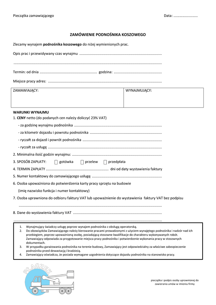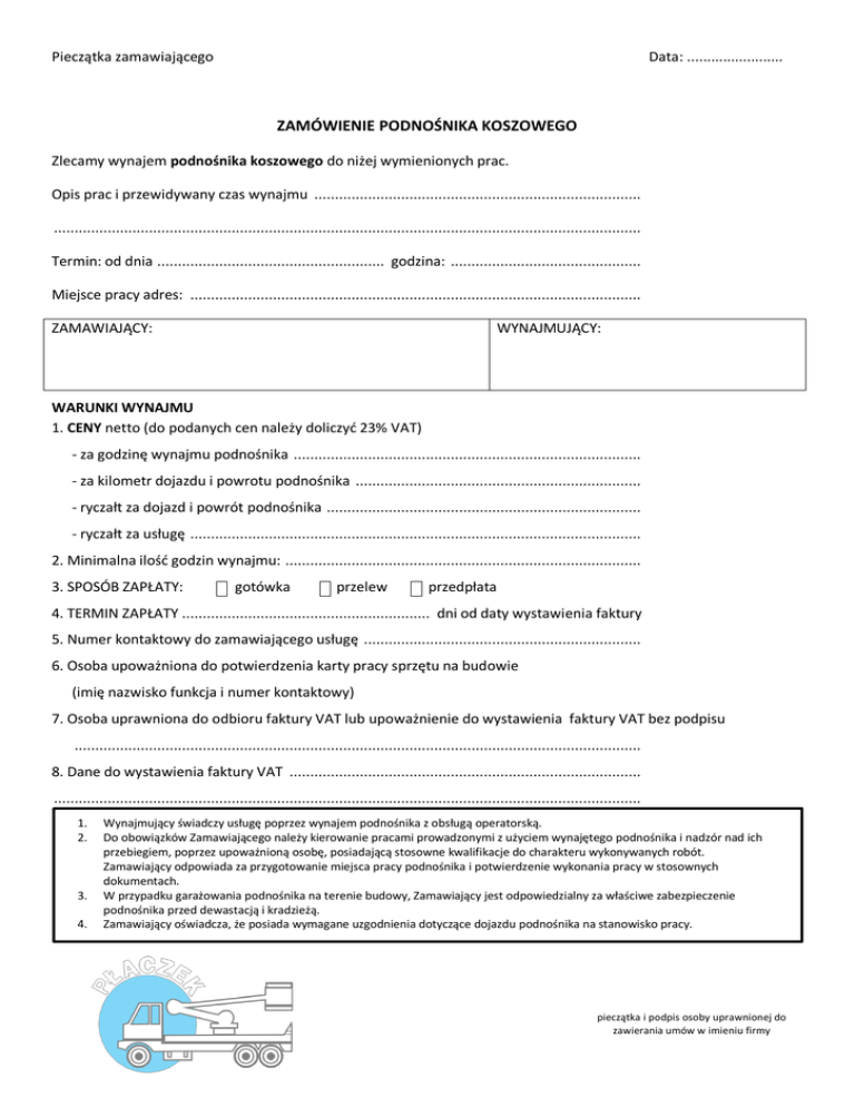 Pieczątka zamawiającego Data: ........................ ZAMÓWIENIE PODNOŚNIKA KOSZOWEGO Zlecamy wynajem podnośnika koszowego do niżej wymienionych prac. Opis prac i przewidywany czas wynajmu ............................................................................... .............................................................................................................................................. Termin: od dnia ....................................................... godzina: .............................................. Miejsce pracy adres: ............................................................................................................. ZAMAWIAJĄCY: WYNAJMUJĄCY: WARUNKI WYNAJMU 1. CENY netto (do podanych cen należy doliczyć 23% VAT) - za godzinę wynajmu podnośnika .................................................................................... - za kilometr dojazdu i powrotu podnośnika ..................................................................... - ryczałt za dojazd i powrót podnośnika ............................................................................ - ryczałt za usługę ............................................................................................................. 2. Minimalna ilość godzin wynajmu: ...................................................................................... 3. SPOSÓB ZAPŁATY: gotówka przelew przedpłata 4. TERMIN ZAPŁATY ............................................................ dni od daty wystawienia faktury 5. Numer kontaktowy do zamawiającego usługę ................................................................... 6. Osoba upoważniona do potwierdzenia karty pracy sprzętu na budowie (imię nazwisko funkcja i numer kontaktowy) 7. Osoba uprawniona do odbioru faktury VAT lub upoważnienie do wystawienia faktury VAT bez podpisu ......................................................................................................................................... 8. Dane do wystawienia faktury VAT ..................................................................................... .............................................................................................................................................. 1. 2. 3. 4. Wynajmujący świadczy usługę poprzez wynajem podnośnika z obsługą operatorską. Do obowiązków Zamawiającego należy kierowanie pracami prowadzonymi z użyciem wynajętego podnośnika i nadzór nad ich przebiegiem, poprzez upoważnioną osobę, posiadającą stosowne kwalifikacje do charakteru wykonywanych robót. Zamawiający odpowiada za przygotowanie miejsca pracy podnośnika i potwierdzenie wykonania pracy w stosownych dokumentach. W przypadku garażowania podnośnika na terenie budowy, Zamawiający jest odpowiedzialny za właściwe zabezpieczenie podnośnika przed dewastacją i kradzieżą. Zamawiający oświadcza, że posiada wymagane uzgodnienia dotyczące dojazdu podnośnika na stanowisko pracy. pieczątka i podpis osoby uprawnionej do zawierania umów w imieniu firmy