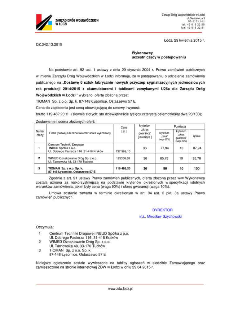 Zarząd Dróg Wojewódzkich w Łodzi ul. Sienkiewicza 3 90-113 Łódź tel. 42 616 22 50 fax. 42 616 22 51 Łódź, 29 kwietnia 2015 r. DZ.342.13.2015 Wykonawcy uczestniczący w postępowaniu Na podstawie art. 92 ust. 1 ustawy z dnia 29 stycznia 2004 r. Prawo zamówień publicznych w imieniu Zarządu Dróg Wojewódzkich w Łodzi informuję, że w postępowaniu o udzielenie zamówienia publicznego na „Dostawę 6 sztuk fabrycznie nowych przyczep sygnalizacyjnych jednoosiowych rok produkcji 2014/2015 z akumulatorami i tablicami zamykanymi U26a dla Zarządu Dróg Wojewódzkich w Łodzi ” wybrano ofertę złożoną przez: TIOMAN Sp. z o.o. Sp. k. 87-148 Łysomice, Ostaszewo 57 E. Cena do zapłacenia jest ceną obowiązującą do umowy i wynosi: brutto 119 482,20 zł (słownie złotych: sto dziewiętnaście tysięcy czterysta osiemdziesiąt dwa 20/100); Zestawienie i ocena złożonych ofert: Numer oferty 1 Firma (nazwa) lub nazwisko oraz adres wykonawcy Centrum Techniki Drogowej INBUD Spółka z o.o. Ul. Dobrego Pasterza 116 ,31-416 Kraków Cena [ zł ] kryterium „okres gwarancji” [ miesiące ] Punktacja kryterium „cena” (waga 90%) kryterium „okres gwarancji” łącznie (waga 10%) 36 77,94 10 87,94 137 969,10 2 WIMED Oznakowanie Dróg Sp. z o.o. Ul. Tarnowska 48, 33-170 Tuchów 125356,68 36 85,78 10 95,78 3 TIOMAN Sp. z o.o. Sp. k. 87-148 Łysomice, Ostaszewo 57 E 119 482,20 36 90 10 100 Zgodnie z art. 91 ustawy Prawo zamówień publicznych, oferta złożona przez w/w Wykonawcę została uznana za najkorzystniejszą na podstawie kryteriów określonych w specyfikacji istotnych warunków zamówienia, jakim były cena (waga 90%) i okres gwarancji (waga 10%). Umowa zostanie zawarta w terminie określonym w art. 94 ust. 2 pkt. 3a ustawy Prawo zamówień publicznych. DYREKTOR inż.. Mirosław Szychowski Otrzymują: 1 2 3 Centrum Techniki Drogowej INBUD Spółka z o.o. Ul. Dobrego Pasterza 116 ,31-416 Kraków WIMED Oznakowanie Dróg Sp. z o.o. Ul. Tarnowska 48, 33-170 Tuchów TIOMAN Sp. z o.o. Sp. k. 87-148 Łysomice, Ostaszewo 57 E Niniejsze ogłoszenie zostało wywieszone na tablicy ogłoszeń w siedzibie Zamawiającego oraz zamieszczone na stronie internetowej ZDW w Łodzi w dniu 29.04.2015 r. www.zdw.lodz.pl