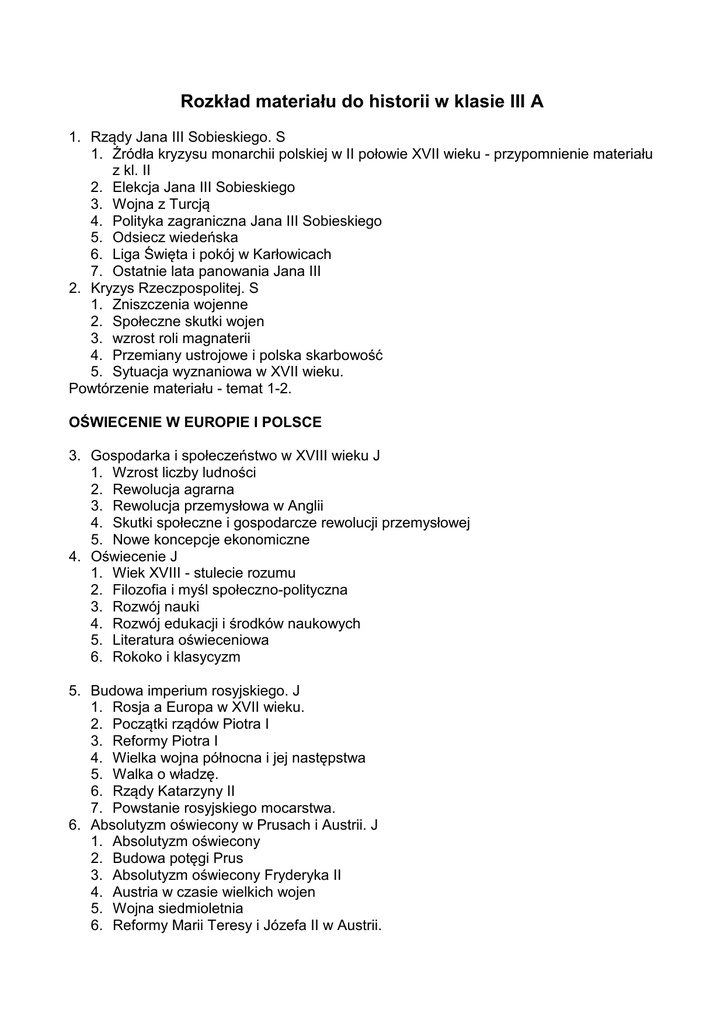 Rozkład materiału do historii w klasie III A 1. Rządy Jana III Sobieskiego. S 1. Źródła kryzysu monarchii polskiej w II połowie XVII wieku - przypomnienie materiału z kl. II 2. Elekcja Jana III Sobieskiego 3. Wojna z Turcją 4. Polityka zagraniczna Jana III Sobieskiego 5. Odsiecz wiedeńska 6. Liga Święta i pokój w Karłowicach 7. Ostatnie lata panowania Jana III 2. Kryzys Rzeczpospolitej. S 1. Zniszczenia wojenne 2. Społeczne skutki wojen 3. wzrost roli magnaterii 4. Przemiany ustrojowe i polska skarbowość 5. Sytuacja wyznaniowa w XVII wieku. Powtórzenie materiału - temat 1-2. OŚWIECENIE W EUROPIE I POLSCE 3. Gospodarka i społeczeństwo w XVIII wieku J 1. Wzrost liczby ludności 2. Rewolucja agrarna 3. Rewolucja przemysłowa w Anglii 4. Skutki społeczne i gospodarcze rewolucji przemysłowej 5. Nowe koncepcje ekonomiczne 4. Oświecenie J 1. Wiek XVIII - stulecie rozumu 2. Filozofia i myśl społeczno-polityczna 3. Rozwój nauki 4. Rozwój edukacji i środków naukowych 5. Literatura oświeceniowa 6. Rokoko i klasycyzm 5. Budowa imperium rosyjskiego. J 1. Rosja a Europa w XVII wieku. 2. Początki rządów Piotra I 3. Reformy Piotra I 4. Wielka wojna północna i jej następstwa 5. Walka o władzę. 6. Rządy Katarzyny II 7. Powstanie rosyjskiego mocarstwa. 6. Absolutyzm oświecony w Prusach i Austrii. J 1. Absolutyzm oświecony 2. Budowa potęgi Prus 3. Absolutyzm oświecony Fryderyka II 4. Austria w czasie wielkich wojen 5. Wojna siedmioletnia 6. Reformy Marii Teresy i Józefa II w Austrii. 7. Rzeczpospolita w pierwszej połowie XVIII wieku. S 1. Pierwsze lata unii polsko-saskiej 2. Rzeczpospolita w czasie wojny północnej 3. Ostatnie lata rządów Augusta II 4. Wojna o polską koronę 5. Polityczna anarchia i próby reform w czasach Augusta III 6. Reformy oświaty i ożywienie gospodarcze w Polsce 8. Pierwsze lata rządów Stanisława Augusta. S 1. Elekcja Stanisława Augusta Poniatowskiego i pierwsze reformy 2. Sprawa dysydentów i prawa kardynalne 3. Konfederacja barska 4. I rozbiór polski 5. Sejm rozbiorowy 9. Oświecenie w Rzeczpospolitej. S 1. Początki oświecenia w Polsce. 2. Mecenat Stanisława Augusta Poniatowskiego 3. Architektura i sztuki plastyczne 4. Literatura oświeceniowa 5. Edukacja i nauka Sprawdzian. ŚWIAT I W RZECZPOSPOLITA W XVIII WIEKU 10. Rewolucja amerykańska J 1. Kolonizacja Ameryki Północnej 2. Konflikt między osadnikami i metropolią 3. Wojna o niepodległość 4. Ustrój Stanów Zjednoczonych 11. Wybuch rewolucji we Francji J 1. Francja Ludwika XVI 2. Stany Generalne 3. Rewolucja ludowa 4. Zmiana ustroju we Francji 5. Rewolucja burżuazyjna 12. Republika Francuska J 1. Proklamowanie republiki 2. Wojna i dyktatura jakobinów 3. Przewrót termidoriański i dyrektoriat 4. Znaczenie Wielkiej Rewolucji Francuskiej. 13. Rzeczpospolita w dobie Sejmu Wielkiego S 1. Rzeczpospolita w dobie Sejmu Wielkiego 2. Sytuacja polityczna po I rozbiorze 3. Zwołanie Sejmu Wielkiego 4. Reformy Sejmu Wielkiego 5. Konstytucja 3 Maja 6. Wojna w obronie suwerenności 7. II rozbiór Polski 14. Upadek polskiej państwowości S 1. Polska po II rozbiorze 2. Wybuch powstania 3. Dalszy przebieg powstania 4. Koniec Insurekcji Kościuszkowskiej 5. III rozbiór Rzeczpospolitej 15. Francja od konsulatu do cesarstwa. J 1. Rządy Dyrektoriatu 2. Zakończenie walk z I koalicją 3. Wyprawa do Egiptu 4. Zamach stanu 18 brumiere’a 5. Konsul sięga po koronę 16. Legiony polskie we Włoszech. S 1. Polacy po III rozbiorze 2. Polska konspiracja niepodległościowa 3. Powstanie legionów polskich 4. Walki we Włoszech 5. Kryzys idei legionowej 6. Znaczenie legionów polskich we Włoszech. 17. Ekspansja i klęska Napoleona J 1. Wojna z III koalicją 2. Walki z Prusami i Rosją 3. Apogeum francuskiej dominacji 4. Wyprawa na Moskwę 5. Wojna z Wielką Koalicją 18. Księstwo Warszawskie S 1. Ziemie Rzeczypospolitej po III rozbiorze 2. Powstanie Księstwa Warszawskiego 3. Ustrój Księstwa Warszawskiego 4. Wojna z Austrią 5. Okupacja Księstwa Warszawskiego Sprawdzian wiadomości EUROPA I ŚWIAT W OKRESIE WIEDEŃSKIM 19. Kongres Wiedeński 20. Europa po Kongresie Wiedeńskim 21. Rewolucja przemysłowa 22. Nowe idee 23. Kultura pierwszej połowy XIX wieku. 24. Ameryka w I połowie XIX wieku 25. Wiosna Ludów 26. Rosja i Turcja w połowie XIX wieku Sprawdzian wiadomości POLACY W OKRESIE POWSTAŃ NARODOWYCH 27. Ziemie polskie w latach 1815-1830 28. Geneza powstania listopadowego 29. Powstanie listopadowe 30. Wielka Emigracja 31. Ziemie polskie w latach 1830-1831 32. Wiosna Ludów i odwilż posewastopolska 33. Powstanie styczniowe Sprawdzian wiadomości ŚWIAT W LATACH 1860-1914 (J) 34. Stany Zjednoczone w drugiej połowie XIX wieku 35. Zjednoczenie Włoch 36. Zjednoczenie Niemiec i powstanie Austro-Węgier 37. Kolonializm 38. Nowy podział polityczny świata 39. Epoka węgla i stali 40. Przemiany ustrojowe i nowe ideologie 41. Piękna epoka Sprawdzian wiadomości ZIEMIE POLSKIE W LATACH 1864-1914 (S) 42. Ziemie polskie po powstaniu styczniowym 43. Przemiany społeczne i gospodarcze na ziemiach polskich 44. Nowe nurty polityczne 45. Rewolucja 1905 roku 46. Pozytywizm i Młoda Polska Sprawdzian wiadomości I WOJNA ŚWIATOWA (J) 47. Świat u progu I wojny światowej 48. Na frontach Wielkiej Wojny 49. Rewolucje w Rosji 50. Polacy podczas I wojny światowej 51. Klęska państw centralnych Sprawdzian wiadomości DWUDZIESTOLECIE MIĘDZYWOJENNE (J) 52. Porządek wersalski 53. Kryzys demokracji i gospodarki 54. Powstanie III Rzeszy 55. Państwo Stalina 56. Afryka i Azja w okresie międzywojennym 57. Na drodze ku wojnie 58. Kultura i nauka dwudziestolecia międzywojennego Sprawdzian wiadomości II RZECZPOSPOLITA (S) 59. Odzyskanie niepodległości 60. Walka o granicę wschodnią 61. Rządy parlamentarne 62. Przewrót majowy i rządy sanacji 63. Społeczeństwo i gospodarka II RP 64. Nauka i kultura międzywojennej Polski. 65. Polska w przededniu wojny. Sprawdzian wiadomości SYSTEM WIEDEŃSK