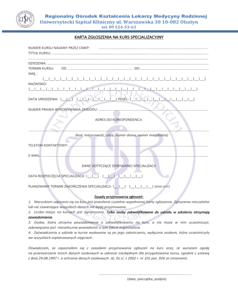 Regionalny Ośrodek Kształcenia Lekarzy Medycyny Rodzinnej Uniwersytecki Szpital Kliniczny ul. Warszawska 30 10-082 Olsztyn tel. 89 524-53-63 KARTA ZGŁOSZENIA NA KURS SPECJALIZACYJNY NUMER KURSU NADANY PRZEZ CMKP: …….......................................................................................................... TYTUŁ KURSU: ................................................................................................................................................................ ........................................................................................................................................................................................ DZIEDZINA: ..................................................................................................................................................................... TERMIN KURSU: OD …………………………………………………….……….. DO ………………………………..………………………………. IMIĘ : |__|__|__|__|__|__|__|__|__|__|__|__|__|__|__|__|__|__|__|__|__|__|__|__|__|__|__|__| NAZWISKO: |__|__|__|__|__|__|__|__|__|__|__|__|__|__|__|__|__|__|__|__|__|__|__|__|__|__|__|__|__| DATA URODZENIA: |__|__| |__|__| |__|__|__|__| PESEL: |__|__|__|__|__|__|__|__|__|__|__| NUMER PRAWA WYKONYWANIA ZAWODU: …………………………………………………………………………………………………………. ADRES DO KORESPONDENCJI: ………………………………………………………………………………………………………………………………………………………………………………. (kod, miejscowość, ulica, numer domu, numer mieszkania) TELEFON KONTAKTOWY: ………………………………………………………………………………………………………………………………………. E-MAIL: …………………………………………………………………………………………………………………………………………………………………. DANE DOTYCZĄCE ODBYWANEJ SPECJALIZACJI DATA ROZPOCZĘCIA SPECJALIZACJI: |__|__| |__|__| |__|__|__|__| PLANOWANY TERMIN ZAKOŃCZENIA SPECJALIZACJI: |__|__| |__|__|__|__| (mm.rrrr) Zasady przyjmowania zgłoszeń: 1. Warunkiem zapisania się na kurs jest przesłanie czytelnie wypełnionej karty zgłoszenia. Zgłoszenia nieczytelne lub nie zawierające wszystkich danych nie będą przyjmowane. 2. Liczba miejsc na kursach jest ograniczona. Tylko osoby zakwalifikowane do udziału w szkoleniu otrzymają zawiadomienia. 3. Osoba, która otrzyma powiadomienie o zakwalifikowaniu na kurs, a nie może w nim uczestniczyć, zobowiązana jest niezwłocznie powiadomić o tym fakcie organizatora. 4. Zaświadczenia o udziale w kursie wydawane są po jego zakończeniu, wyłącznie osobom, które uczestniczyły we wszystkich zaplanowanych zajęciach. Oświadczam, że zapoznałem się z zasadami przyjmowania zgłoszeń na kurs oraz, że wyrażam zgodę na przetwarzanie moich danych osobowych w zakresie niezbędnym dla przygotowania kursu, zgodnie z ustawą z dnia 29.08.1997 r. o ochronie danych osobowych. (tj. Dz.U. z 2002 r. nr 101 poz. 926 ze zmianami). ............................................................................................... (data, pieczątka, podpis)