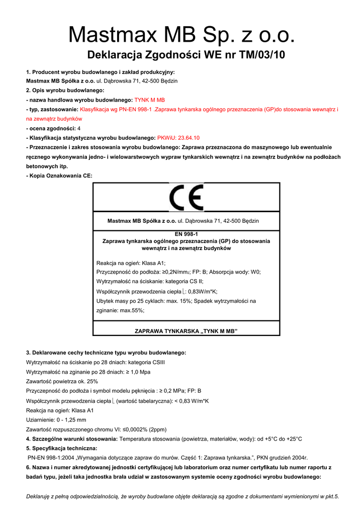 Mastmax MB Sp. z o.o. Deklaracja Zgodności WE nr TM/03/10 1. Producent wyrobu budowlanego i zakład produkcyjny: Mastmax MB Spółka z o.o. ul. Dąbrowska 71, 42-500 Będzin 2. Opis wyrobu budowlanego: - nazwa handlowa wyrobu budowlanego: TYNK M MB - typ, zastosowanie: Klasyfikacja wg PN-EN 998-1 .Zaprawa tynkarska ogólnego przeznaczenia (GP)do stosowania wewnątrz i na zewnątrz budynków - ocena zgodności: 4 - Klasyfikacja statystyczna wyrobu budowlanego: PKWiU: 23.64.10 - Przeznaczenie i zakres stosowania wyrobu budowlanego: Zaprawa przeznaczona do maszynowego lub ewentualnie ręcznego wykonywania jedno- i wielowarstwowych wypraw tynkarskich wewnątrz i na zewnątrz budynków na podłożach betonowych itp. - Kopia Oznakowania CE: Mastmax MB Spółka z o.o. ul. Dąbrowska 71, 42-500 Będzin EN 998-1 Zaprawa tynkarska ogólnego przeznaczenia (GP) do stosowania wewnątrz i na zewnątrz budynków Reakcja na ogień: Klasa A1; Przyczepność do podłoża: ≥0,2N/mm2; FP: B; Absorpcja wody: W0; Wytrzymałość na ściskanie: kategoria CS II; Współczynnik przewodzenia ciepła: 0,83W/m*K; Ubytek masy po 25 cyklach: max. 15%; Spadek wytrzymałości na zginanie: max.55%; ZAPRAWA TYNKARSKA „TYNK M MB” 3. Deklarowane cechy techniczne typu wyrobu budowlanego: Wytrzymałość na ściskanie po 28 dniach: kategoria CSIII Wytrzymałość na zginanie po 28 dniach: ≥ 1,0 Mpa Zawartość powietrza ok. 25% Przyczepność do podłoża i symbol modelu pęknięcia : ≥ 0,2 MPa; FP: B Współczynnik przewodzenia ciepła (wartość tabelaryczna): < 0,83 W/m*K Reakcja na ogień: Klasa A1 Uziarnienie: 0 - 1,25 mm Zawartość rozpuszczonego chromu VI: ≤0,0002% (2ppm) 4. Szczególne warunki stosowania: Temperatura stosowania (powietrza, materiałów, wody): od +5°C do +25°C 5. Specyfikacja techniczna: PN-EN 998-1:2004 „Wymagania dotyczące zapraw do murów. Część 1: Zaprawa tynkarska.”, PKN grudzień 2004r. 6. Nazwa i numer akredytowanej jednostki certyfikującej lub laboratorium oraz numer certyfikatu lub numer raportu z badań typu, jeżeli taka jednostka brała udział w zastosowanym systemie oceny zgodności wyrobu budowlanego: Deklaruję z pełną odpowiedzialnością, że wyroby budowlane objęte deklaracją są zgodne z dokumentami wymienionymi w pkt.5.