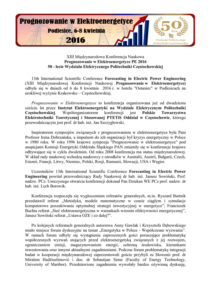 XIII Międzynarodowa Konferencja Naukowa Prognozowanie w Elektroenergetyce PE 2016 50 - lecie Wydziału Elektrycznego Politechniki Częstochowskiej 13th International Scientific Conference Forecasting in Electric Power Engineering (XIII Międzynarodowej Konferencji Naukowej Prognozowanie w Elektroenergetyce) odbyła się w dniach od 6 do 8 kwietnia 2016 r. w hotelu "Ostaniec" w Podlesicach na urokliwej wyżynie Krakowsko – Częstochowskiej. Prognozowanie w Elektroenergetyce to konferencja organizowana już od dwudziestu sześciu lat przez Instytut Elektroenergetyki na Wydziale Elektrycznym Politechniki Częstochowskiej. Współorganizatorem konferencji jest Polskie Towarzystwo Elektrotechniki Teoretycznej i Stosowanej PTETiS Oddział w Częstochowie, którego przewodniczącym jest prof. dr hab. inż. Jan Szczygłowski. Inspiratorem sympozjów związanych z prognozowaniem w elektroenergetyce była Pani Profesor Irena Dobrzańska, a impulsem do ich organizacji był kryzys energetyczny w Polsce w 1980 roku. W roku 1996 krajowe sympozja "Prognozowanie w elektroenergetyce" pod auspicjami Komisji Energetyki Oddziału Śląskiego PAN zmieniły się w konferencje krajowe odbywające się w cyklu dwuletnim. Od roku 2008 konferencja ma status międzynarodowej. W skład rady naukowej wchodzą naukowcy z ośrodków w Australii, Austrii, Bułgarii, Czech, Estonii, Francji, Litwy, Niemiec, Polski, Rosji, Rumunii, Słowacji, USA i Węgier. Uczestników 13th International Scientific Conference Forecasting in Electric Power Engineering powitał przewodniczący Rady Naukowej dr hab. inż. Janusz Sowiński, Prof. nadzw. PCz. Uroczystego otwarcia konferencji dokonał Pan Dziekan WE PCz prof. nadzw. dr hab. inż. Lech Borowik. Konferencja rozpoczęła się wygłoszeniem referatów generalnych, m.in. Ryszard Bartnik przedstawił referat „Metodyka, modele matematyczne w czasie ciągłym i symulacje komputerowe poszukiwania optymalnej strategii inwestycyjnej w energetyce”, Franciszek Buchta referat „Sieć elektroenergetyczna w warunkach wzrostu efektywności energetycznej”, Janusz Sowiński referat „Ustawa OZE i co dalej?”. Po kolejnych referatach generalnych autorstwa Anny Gawlak i Krzysztofa Dębowskiego miało miejsce forum dyskusyjne na temat „Energetyka w Polsce - Współczesne wyzwania”. W ramach forum odbyły się wystąpienia zaproszonych gości poruszające problematykę współczesnych wyzwań stojących przed elektroenergetyką związanych z jej rozwojem, ograniczaniem emisji, magazynowaniem energii, ochroną środowiska, kierunkami inwestowania oraz innymi aktualnymi zagadnieniami. Podczas forum problematykę integracji badań w kooperacji międzynarodowej zaprezentowali goście przybyli ze Słowenii prof. dr Miralem Hadžiselimović i doc. dr Sebastijan Seme (Faculty of Energy Technology, University of Maribor). Przedstawione zagadnienia wywołały bardzo ożywioną dyskusję, która następnie przeniosła się w kuluary i była kontynuowana również podczas uroczystej kolacji. Od pewnego czasu oficjalna tematyka konferencji jest sukcesywnie rozszerzana poza tytułowe prognozowanie elektroenergetyczne. Obecnie tematyka konferencji obejmuje m.in.: prognozowanie w elektroenergetyce, modelowanie, optymalizację i planowanie rozwoju systemu elektroenergetycznego, bezpieczeństwo elektroenergetyczne, sterowanie pracą systemu, układy automatyki, sterowania, pomiarów i monitorowania, źródła generacji rozproszonej i odnawialnej, energetykę jądrową oraz funkcjonowanie rynków energii elektrycznej. W tegorocznych obradach wzięło udział czterdziestu jeden uczestników. Łącznie zaprezentowano 39 referatów podczas obrad plenarnych w 7 sekcjach. Tegoroczna Konferencja PE 2016 była szczególna, gdyż wpisała się w obchody jubileuszu 50 - lecia Wydziału Elektrycznego Politechniki Częstochowskiej. Konferencja gościła przedstawicieli z wyższych uczelni i ośrodków naukowo-badawczych: Akademii Górniczo-Hutniczej w Krakowie, National University “Lviv Polytechnic”, Politechniki Śląskiej w Gliwicach, Politechniki Warszawskiej, Politechniki Wrocławskiej oraz University of Maribor. Podczas obrad wspomniano ogromne zasługi stałego uczestnika konferencji Profesora Jacka Malko zmarłego w 2015 roku. W ramach obrad plenarnych i sesji tematycznych zaprezentowano następujące referaty: Solemn Plenary Session - part I: The General Papers / Uroczysta Sesja Plenarna - część I: Referaty generalne Chairmen/Prowadzący: Lech Borowik, Janusz Sowiński ● Bartnik R.: Metodyka, modele matematyczne w czasie ciągłym i symulacje komputerowe poszukiwania optymalnej strategii inwestycyjnej w energetyce ● Buchta F.: Sieć elektroenergetyczna w warunkach wzrostu efektywności energetycznej ● Sowiński J.: Ustawa o OZE - i co dalej? Solemn Plenary Session - part II: Discussion forum: "Energy in Poland - Contemporary challenges" / Uroczysta Sesja Plenarna - część II: Forum dyskusyjne: "Energetyka w Polsce - Współczesne wyzwania" Chairmen/Prowadzący: Ryszard Bartnik, Maksymilian Przygrodzki ● Gawlak A.: Kierunki inwestowania a straty energii elektrycznej w sieci rozdzielczej w systemie ● Bieliński W.: Inne spojrzenie na zmienność obciążeń elektroenergetycznych ● Dębowski K.: Taryfa dynamiczna jako sygnał sterujący w efektywnym wykorzystywania zasobów elektroenergetycznych Session I: Forecasting in Electric Power Engineering / Prognozowanie w Elektroenergetyce Chairmen/Prowadzący: Mirosław Parol, Grzegorz Dudek ● Łyp J.: Problematyka prognozowania zapotrzebowania na letnią moc szczytową krajowego systemu elektroenergetycznego ● Pieczarko R., Sołtysik M.: Analiza wpływu generacji źródeł wiatrowych na poziom kształtowania się cen SPOT. ● Piotrowski P., Marzecki J.: Ekspert kontra klasyczne metody prognostyczne w zadaniu prognozowania rocznego zapotrzebowania na energię elektryczną terenowych stacji transformatorowych SN/nN ● Dudek G.: Stochast