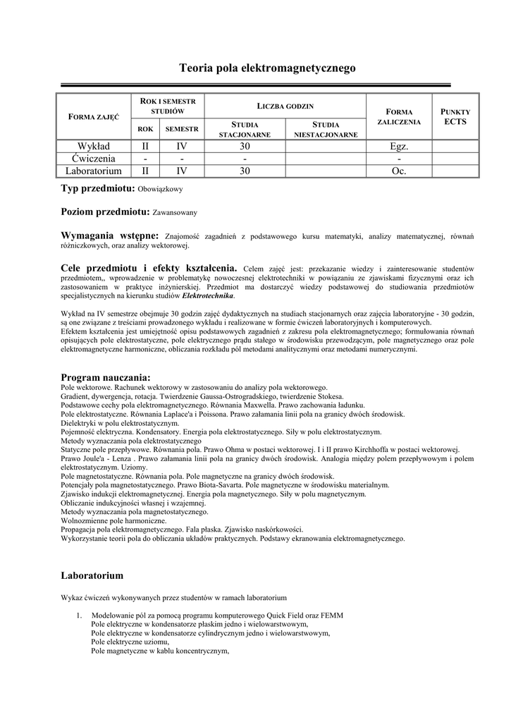 Teoria pola elektromagnetycznego ROK I SEMESTR Wykład Ćwiczenia Laboratorium LICZBA GODZIN STUDIÓW FORMA ZAJĘĆ ROK SEMESTR STUDIA STACJONARNE II II IV IV 30 30 STUDIA NIESTACJONARNE FORMA ZALICZENIA PUNKTY ECTS Egz. Oc. Typ przedmiotu: Obowiązkowy Poziom przedmiotu: Zawansowany Wymagania wstępne: Znajomość zagadnień z podstawowego kursu matematyki, analizy matematycznej, równań różniczkowych, oraz analizy wektorowej. Cele przedmiotu i efekty kształcenia. Celem zajęć jest: przekazanie wiedzy i zainteresowanie studentów przedmiotem,, wprowadzenie w problematykę nowoczesnej elektrotechniki w powiązaniu ze zjawiskami fizycznymi oraz ich zastosowaniem w praktyce inżynierskiej. Przedmiot ma dostarczyć wiedzy podstawowej do studiowania przedmiotów specjalistycznych na kierunku studiów Elektrotechnika. Wykład na IV semestrze obejmuje 30 godzin zajęć dydaktycznych na studiach stacjonarnych oraz zajęcia laboratoryjne - 30 godzin, są one związane z treściami prowadzonego wykładu i realizowane w formie ćwiczeń laboratoryjnych i komputerowych. Efektem kształcenia jest umiejętność opisu podstawowych zagadnień z zakresu pola elektromagnetycznego; formułowania równań opisujących pole elektrostatyczne, pole elektrycznego prądu stałego w środowisku przewodzącym, pole magnetycznego oraz pole elektromagnetyczne harmoniczne, obliczania rozkładu pól metodami analitycznymi oraz metodami numerycznymi. Program nauczania: Pole wektorowe. Rachunek wektorowy w zastosowaniu do analizy pola wektorowego. Gradient, dywergencja, rotacja. Twierdzenie Gaussa-Ostrogradskiego, twierdzenie Stokesa. Podstawowe cechy pola elektromagnetycznego. Równania Maxwella. Prawo zachowania ładunku. Pole elektrostatyczne. Równania Laplace'a i Poissona. Prawo załamania linii pola na granicy dwóch środowisk. Dielektryki w polu elektrostatycznym. Pojemność elektryczna. Kondensatory. Energia pola elektrostatycznego. Siły w polu elektrostatycznym. Metody wyznaczania pola elektrostatycznego Statyczne pole przepływowe. Równania pola. Prawo Ohma w postaci wektorowej. I i II prawo Kirchhoffa w postaci wektorowej. Prawo Joule'a - Lenza . Prawo załamania linii pola na granicy dwóch środowisk. Analogia między polem przepływowym i polem elektrostatycznym. Uziomy. Pole magnetostatyczne. Równania pola. Pole magnetyczne na granicy dwóch środowisk. Potencjały pola magnetostatycznego. Prawo Biota-Savarta. Pole magnetyczne w środowisku materialnym. Zjawisko indukcji elektromagnetycznej. Energia pola magnetycznego. Siły w polu magnetycznym. Obliczanie indukcyjności własnej i wzajemnej. Metody wyznaczania pola magnetostatycznego. Wolnozmienne pole harmoniczne. Propagacja pola elektromagnetycznego. Fala płaska. Zjawisko naskórkowości. Wykorzystanie teorii pola do obliczania układów praktycznych. Podstawy ekranowania elektromagnetycznego. Laboratorium Wykaz ćwiczeń wykonywanych przez studentów w ramach laboratorium 1. Modelowanie pól za pomocą programu komputerowego Quick Field oraz FEMM Pole elektryczne w kondensatorze płaskim jedno i wielowarstwowym, Pole elektryczne w kondensatorze cylindrycznym jedno i wielowarstwowym, Pole elektryczne uziomu, Pole magnetyczne w kablu koncentrycznym, Modelowanie pól w ekranach – elektrycznym i magnetycznym oraz ocena skuteczności ich działania, Modelowanie zjawiska naskórkowości (układ szyn z prądem, żłobek silnika indukcyjnego) Analityczne wyznaczanie rozkładów pola elektrycznego, Analityczne wyznaczanie rozkładów pola elektrycznego w środowisku przewodzącym, Analityczne wyznaczanie rozkładów pola magnetycznego. Obliczanie indukcyjności własnej i wzajemnej. 2. 3. 4. 5. Badanie pola elektromagnetycznego cewki cylindrycznej, Badanie pola elektromagnetycznego cewki z przewodzącym rdzeniem, Pomiary podstawowych wielkości w polu elektromagnetycznym, Modelowanie pól dwuwymiarowych na papierze elektroprzewodzącym. Metody oceny: Zaliczenie wykładu odbywa się na podstawie wyników egzaminu. Zaliczenie ćwiczeń laboratoryjnych odbywa się na podstawie ocen cząstkowych z przeprowadzanych ćwiczeń, opracowania wyników badań w formie sprawozdań oraz sprawdzianów z wiedzy dotyczącej wykonywanych ćwiczeń. Wykaz literatury podstawowej: 1. 2. 3. 4. 5. 6. Maciej Krakowski: Elektrotechnika teoretyczna t. II. Pole elektromagnetyczne. PWN, 1999. Ryszard Matusiak: Elektrotechnika teoretyczna T.2. Teoria pola elektromagnetycznego, WNT, 1982. Zygmunt Piątek, Paweł Jabłoński: Podstawy teorii pola elektromagnetycznego, WNT 2010. Henryk Rawa: Podstawy elektromagnetyzmu. Oficyna Wydawnicza Politechniki Warszawskiej, 2005, Antoni Cieśla, Elektrotechnika. Elektryczność i magnetyzm w przykładach i zadaniach, AGH Uczelniane Wydawnictwa Naukowo-Dydaktyczne, Kraków, 2008. Paweł Jabłoński, Zygmunt Piątek, Przykłady i zadania z podstaw teorii pola elektromagnetycznego. Wydawnictwo Politechniki Częstochowskiej, Częstochowa 2008. Wykaz literatury uzupełniającej: 1. 2. 3. 4. 5. 6. 7. 8. Tadeusz Łobos, Jacek Bogusz, Marian Łukaniszyn, Teoria pola dla elektryków. Oficyna Wydawnicza Politechniki Wrocławskiej, 2004 T. Cholewicki: Elektrotechnika techniczna, t. II WNT 1971 Henryk Rawa: Elektryczność i magnetyzm w technice. PWN Warszawa, 1994. Ryszard Sikora: Teoria pola elektromagnetycznego ,WNT 1997. Jan Sikora, Podstawy elementów skończonych. Zagadnienia potencjalne pola elektromagnetycznego, Wydawnictwo Książkowe Instytutu Elektrotechniki. Warszawa 2008. Janusz Turowski J.: Elektrodynamika techniczna, WNT 1968. M. Zahn M.: Pole elektromagnetyczne, PWN 1989 Jerzy Kozłowski, Wojciech Machczyński, Zadania z podstaw elektromagnetyzmu, Wydawnictwo Politechniki Poznańskiej, 1998. Opracował: Dr inż. Ryszard Goleman