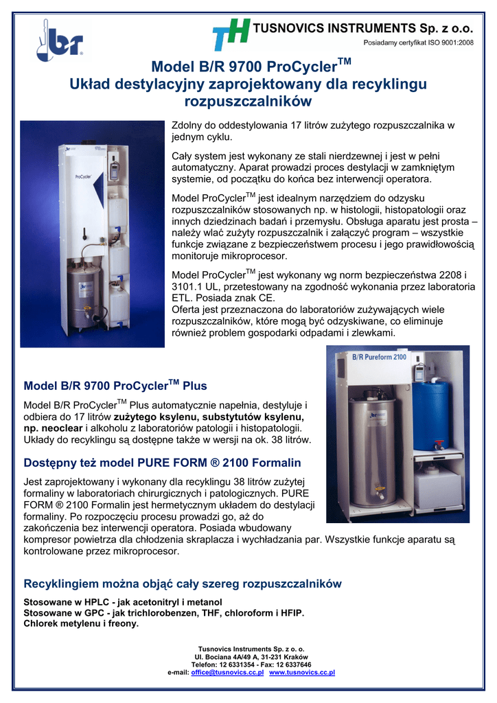 Model B/R 9700 ProCyclerTM Układ destylacyjny zaprojektowany dla recyklingu rozpuszczalników Zdolny do oddestylowania 17 litrów zużytego rozpuszczalnika w jednym cyklu. Cały system jest wykonany ze stali nierdzewnej i jest w pełni automatyczny. Aparat prowadzi proces destylacji w zamkniętym systemie, od początku do końca bez interwencji operatora. Model ProCyclerTM jest idealnym narzędziem do odzysku rozpuszczalników stosowanych np. w histologii, histopatologii oraz innych dziedzinach badań i przemysłu. Obsługa aparatu jest prosta – należy wlać zużyty rozpuszczalnik i załączyć program – wszystkie funkcje związane z bezpieczeństwem procesu i jego prawidłowością monitoruje mikroprocesor. Model ProCyclerTM jest wykonany wg norm bezpieczeństwa 2208 i 3101.1 UL, przetestowany na zgodność wykonania przez laboratoria ETL. Posiada znak CE. Oferta jest przeznaczona do laboratoriów zużywających wiele rozpuszczalników, które mogą być odzyskiwane, co eliminuje również problem gospodarki odpadami i zlewkami. Model B/R 9700 ProCyclerTM Plus Model B/R ProCyclerTM Plus automatycznie napełnia, destyluje i odbiera do 17 litrów zużytego ksylenu, substytutów ksylenu, np. neoclear i alkoholu z laboratoriów patologii i histopatologii. Układy do recyklingu są dostępne także w wersji na ok. 38 litrów. Dostępny też model PURE FORM ® 2100 Formalin Jest zaprojektowany i wykonany dla recyklingu 38 litrów zużytej formaliny w laboratoriach chirurgicznych i patologicznych. PURE FORM ® 2100 Formalin jest hermetycznym układem do destylacji formaliny. Po rozpoczęciu procesu prowadzi go, aż do zakończenia bez interwencji operatora. Posiada wbudowany kompresor powietrza dla chłodzenia skraplacza i wychładzania par. Wszystkie funkcje aparatu są kontrolowane przez mikroprocesor. Recyklingiem można objąć cały szereg rozpuszczalników Stosowane w HPLC - jak acetonitryl i metanol Stosowane w GPC - jak trichlorobenzen, THF, chloroform i HFIP. Chlorek metylenu i freony. Tusnovics Instruments Sp. z o. o. Ul. Bociana 4A/49 A, 31-231 Kraków Telefon: 12 6331354 - Fax: 12 6337646 e-mail: [email protected] www.tusnovics.cc.pl