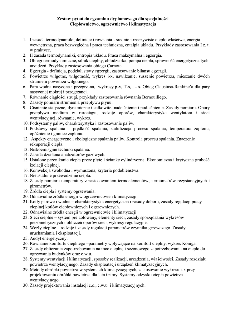 Zestaw pytań do egzaminu dyplomowego dla specjalności Ciepłownictwo, ogrzewnictwo i klimatyzacja 1. I zasada termodynamiki, definicje i równania - średnie i rzeczywiste ciepło właściwe, energia wewnętrzna, praca bezwzględna i praca techniczna, entalpia układu. Przykłady zastosowania I z. t. w praktyce. 2. II zasada termodynamiki, entropia układu. Praca maksymalna i egzergia. 3. Obiegi termodynamiczne, silnik cieplny, chłodziarka, pompa ciepła, sprawność energetyczna tych urządzeń. Przykłady zastosowania obiegu Carnota. 4. Egzergia - definicja, podział, straty egzergii, zastosowanie bilansu egzergii. 5. Powietrze wilgotne, wilgotność, wykres i-x, nawilżanie, suszenie powietrza, mieszanie dwóch strumieni powietrza wilgotnego. 6. Para wodna nasycona i przegrzana, wykresy p-v, T-s, i - s. Obieg Clausiusa-Rankine’a dla pary nasyconej mokrej i przegrzanej. 7. Równanie ciągłości strugi, przykłady zastosowania równania Bernoulliego. 8. Zasady pomiaru strumienia przepływu płynu. 9. Ciśnienie statyczne, dynamiczne i całkowite, nadciśnienie i podciśnienie. Zasady pomiaru. Opory przepływu medium w rurociągu, rodzaje oporów, charakterystyka wentylatora i sieci wentylacyjnej, równanie, wykres. 10. Podsystemy paliw, charakterystyka i zastosowanie paliw. 11. Podstawy spalania – prędkość spalania, stabilizacja procesu spalania, temperatura zapłonu, opóźnienie i granice zapłonu. 12. Aspekty energetyczne i ekologiczne spalania paliw. Kontrola procesu spalania. Znaczenie rekuperacji ciepła. 13. Niskoemisyjne techniki spalania. 14. Zasada działania analizatorów gazowych. 15. Ustalone przenikanie ciepła przez płytę i ściankę cylindryczną. Ekonomiczna i krytyczna grubość izolacji cieplnej. 16. Konwekcja swobodna i wymuszona, kryteria podobieństwa. 17. Nieustalone przewodzenie ciepła. 18. Zasady pomiaru temperatury z zastosowaniem termoelementów, termometrów rezystancyjnych i pirometrów. 19. Źródła ciepła i systemy ogrzewania. 20. Odnawialne źródła energii w ogrzewnictwie i klimatyzacji. 21. Kotły parowe i wodne – charakterystyka energetyczna i zasady doboru, zasady regulacji pracy cieplnej kotłów ciepłowniczych i ogrzewniczych. 22. Odnawialne źródła energii w ogrzewnictwie i klimatyzacji. 23. Sieci cieplne – system preizolowany, elementy sieci, zasady sporządzania wykresów piezometrycznych i obliczeń oporów sieci, wykresy regulacyjne. 24. Węzły cieplne – rodzaje i zasady regulacji parametrów czynnika grzewczego. Zasady uruchamiania i eksploatacji. 25. Audyt energetyczny. 26. Równanie komfortu cieplnego –parametry wpływające na komfort cieplny, wykres Königa. 27. Zasady obliczania zapotrzebowania na moc cieplną i sezonowego zapotrzebowania na ciepło do ogrzewania budynków oraz c.w.u. 28. Systemy wentylacji i klimatyzacji, sposoby realizacji, urządzenia, właściwości. Zasady rozdziału powietrza wentylacyjnego. Zasady eksploatacji urządzeń klimatyzacyjnych. 29. Metody obróbki powietrza w systemach klimatyzacyjnych, zastosowanie wykresu i-x przy projektowaniu obróbki powietrza dla lata i zimy. Systemy odzysku ciepła powietrza wentylacyjnego. 30. Zasady projektowania instalacji c.o., c.w.u. i klimatyzacyjnych. Zestaw pytań do egzaminu dyplomowego dla specjalności Energetyka Jądrowa 1. Cele i założenia ustawy termomodernizacyjnej 2. Na przykładzie budynku wielorodzinnego omówić możliwe przedsięwzięcia termomodernizacyjne oraz ich przewidywane efekty 3. Bezspoinowy System Ociepleń - omówić analityczne metody obliczania optymalnej grubości izolacji przegród zewnętrznych 4. Sposoby połączenia urządzeń pomiarowych z komputerem – najważniejsze parametry tych połączeń. 5. Objaśnić działanie wybranej funkcji Labview: events (zdarzenia), semaphores (semafory), notifiers (powiadomienia), property node (węzeł właściwości), shift register (rejestr przesuwny). 6. .Opisz podstawowe zjawiska, których nie wyjaśnia fizyka klasyczna: a) widmo promieniowania ciała doskonale czarnego (postulaty Plancka służące jego wyjaśnieniu), b) zjawisko fotoelektryczne, c) efekt Comptona, d) doświadczenie z interferencją elektronów na sieci krystalicznej (Davissona i Germera), oraz podaj wyjaśnienie jednego z nich 7. Co stanowi podstawę podziału cząstek na bozony i fermiony? Jak brzmi zakaz Pauliego, i do której z tych grup cząstek się stosuje? 8. Izotopowe i akceleratorowe źródła neutronów. 9. Metody pomiarowe oparte na oddziaływaniu promieniowania gamma z materią. 10. Metody pomiarowe oparte na oddziaływaniu neutronów z materią. 11. Jądrowe metody pomiarowe stosowane do ciągłej kontroli jakości węgli. 12. Energetyka wiatrowa 13. Gęstość strumienia energii wiatru. 14. Krzywa mocy turbiny wiatrowej. 15. Cele i sposoby magazynowania energii elektrycznej. 16. Metody poprawy wydajności energetycznej budynków 17. Paliwa z odpadów 18. Omówić defekty termodynamicznie odwracalne i nieodwracalne w kryształach 19. Układy dwuskładnikowe podstawowe pojęcia: eutektyka, eutektoida perytektyka, perytektoida 20. Omówić istotne różnice w budowie krystalicznej kryształów ceramicznych i metali 21. Wydajność reakcji jądrowych 22. Proces rozszczepienia jąder 23. Współczynnik mnożenia neutronów, stan krytyczny/stacjonarny reaktora 24. Stabilność pracy reaktora, objaśnienie 25. Bezpieczeństwo reaktorów jądrowych 26. Zmiany składu paliwa w czasie eksploatacji reaktora 27. Transmutacje odpadów promieniotwórczych, układy podkrytyczne np. sterowane akceleratorem 28. Warunki realizacji syntezy jądrowej 29. Reaktory termojądrowe: ograniczanie magnetyczne i bezwładnościowe; reaktory hybrydowe synteza rozszczepienie 30. Metoda obliczeniowa Monte-Carlo w zastosowaniu do transportu cząstek Zestaw pytań do egzaminu dyplomowego dla specjalności Urządzenia, sieci i systemy energetyczne 1. Rodzaje maszyn energetycznych 2. Charakterystyki aerodynamiczne profili 3. 