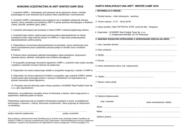 WARUNKI UCZESTNICTWA W ARFT WINTER CAMP 2016 1. Uczestnik CAMP-u zobowiązany jest stosować się do regulaminu obozu i ośrodka przestrzegać ich oraz stosować się do poleceń kadry szkoleniowej i wychowawców. 2. Uczestnik CAMP-u zobowiązany jest zaopatrzyć się w niezbędny ekwipunek (obuwie, ubrania, rzeczy osobiste) oraz zawodnicy ARFT w sprzęt sportowy obowiązujący w Akademii ( dresy, koszulki, spodenki, getry, piłkę ). KARTA KWALIFIKACYJNA ARFT WINTER CAMP 2016 _______________________________________________________________________ I. INFORMACJA O OBOZIE : 1. Rodzaj imprezy – obóz rekreacyjno - sportowy. 2. Termin imprezy : 31.01 – 06.02.2016r . 3. Adres ośrodka: Hotel TOP ROYAL STAR, Lloret De Mar , Hiszpania 3. Uczestnik zobowiązany jest posiadać w trakcie CAMP-u aktualną legitymację szkolną . 4. Uczestnik( jego rodzice, opiekunowie) ponoszą pełną odpowiedzialność za szkody wyrządzone przez niego podczas pobytu na CAMP-ie i z tego tytułu przejmują pełną odpowiedzialność cywilno-prawną. 4. Organizator : ACADEMY Real Football Team Sp. z o.o. ul. Sulejkowska 60A/805, 04-157 Warszawa ________________________________________________________________________ II. WNIOSEK RODZICÓW (OPIEKUNÓW) O SKIEROWANIE DZIECKA NA OBÓZ : 5. Organizatorzy nie ponoszą odpowiedzialności za pieniądze, rzeczy wartościowe oraz rzeczy pozostawione przez uczestników podczas pobytu w ośrodku oraz w środkach transportu. 1. Imię i nazwisko dziecka ....................................................................................................... 6. Podczas obozu obowiązuje całkowity bezwzględny zakaz posiadania, spożywania i używania tytoniu, alkoholu, narkotyków oraz środków odurzających. 3. PESEL .………………………………………………………………………………………………………… 7. W przypadku poważnego naruszenia regulaminu CAMP-u, uczestnik może zostać usunięty i wydalony z placówki na koszt rodziców lub opiekunów. 8. Organizator nie zwraca wpłaconego zadatku w przypadku rezygnacji z udziału w CAMP-ie. 9. Organizator nie zwraca wpłaconych środków w przypadku, gdy uczestnik CAMP-u będzie musiał opuścił obóz przed jego końcem z przyczyn niezależnych od organizatora lub z powodu naruszenia zasad regulaminu. 10. Powyższe warunki stanowią część umowy zawartej z ACADEMY Real Football Team Sp. z o.o. jako organizatorem. Stwierdzam, że podałam/em wszystkie znane mi informacje o dziecku, które mogą pomóc w zapewnieniu właściwej opieki na obozie. Potwierdzam zapoznanie się ze wszelkimi informacjami zawartymi w karcie, szczegółowymi informacjami o imprezie i z treścią „Warunków Uczestnictwa”, które przyjmuję do wiadomości i je akceptuję. .................................................. podpis rodziców (opiekunów) …..……………………………….. 2. Data urodzenia .................................................................................................................... 4. Wzrost ..…………………………………………………………………………………………. 5. Adres zamieszkania (ulica, kod, miejscowość) .................................................................................................................................................. 6. Telefon ......................................................................................... 7. Nazwa i adres szkoły ........................................................................................................................................................... ........................................................................................................................................................... 8. Rodzice (Opiekunowie): imię i nazwisko adres zamieszkania i telefon Ojciec …………………………………………………. …........………………………………………… Matka …………………………………………………. ...………………………………....................... podpis uczestnika Brak podpisów, niedostarczenie Karty Kwalifikacyjnej w terminie może skutkować brakiem kwalifikacji do udziału w CAMP-ie z przyczyn niezawinionych przez Organizatora. Karta Kwalifikacyjna musi być wypełniona kompletnie i czytelnie oraz dostarczona do Organizatora w stanie nienagannym. Format wymagany- A4. Opiekun prawny………………………………..……… ……..……………………………………….…. ________________________________________________________________ III. ORZECZENIE LEKARSKIE* (w przypadku braku aktualnego i ważnego w okresie CAMP-u orzeczenia od lekarza medycyny sportowej ). 5. Inne uwagi o zdrowiu dziecka: ( np. czy nosi aparat ,okulary , jak znosi jazdę samochodem, autobusem) : 1. Po zbadaniu dziecka stwierdzam ............................................................................................................................................... ................................................................................................................................................. ............................................................................................................................................... ................................................................................................................................................. Zgadzam się na leczenie szpitalne, zabiegi diagnostyczne, operacje w razie zagrożenia życia dziecka. ............................................................................................................................................... 2. Zalecenia dla wychowawcy: Oświadczam, że podałam/em wszystkie znane mi informacje o dziecku, które mogą pomóc w zapewnieniu mu właściwej opieki w czasie jego pobytu na obozie. ..................................................................