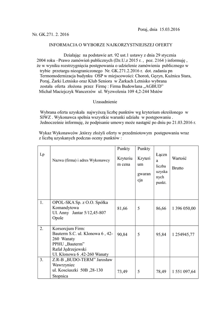 Poraj, dnia 15.03.2016 Nr. GK.271. 2. 2016 INFORMACJA O