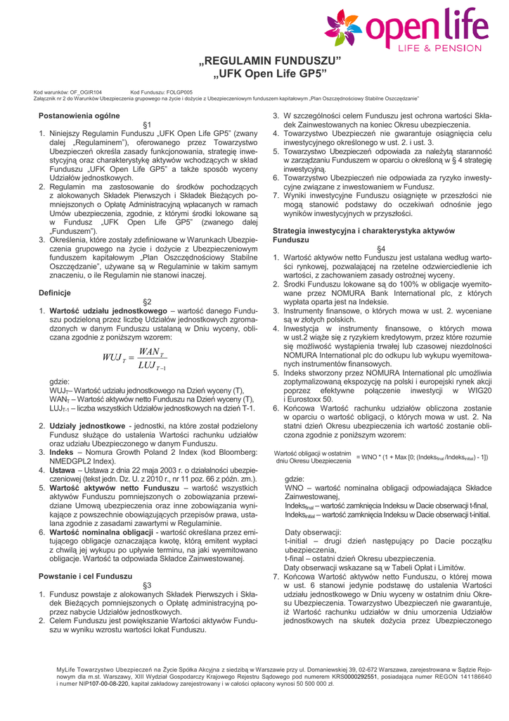 „REGULAMIN FUNDUSZU” „UFK Open Life GP5” Kod warunków: OF_OGIR104 Kod Funduszu: FOLGP005 Załącznik nr 2 do Warunków Ubezpieczenia grupowego na Ŝycie i doŜycie z Ubezpieczeniowym funduszem kapitałowym „Plan Oszczędnościowy Stabilne Oszczędzanie” Postanowienia ogólne §1 1. Niniejszy Regulamin Funduszu „UFK Open Life GP5” (zwany dalej „Regulaminem”), oferowanego przez Towarzystwo Ubezpieczeń określa zasady funkcjonowania, strategię inwestycyjną oraz charakterystykę aktywów wchodzących w skład Funduszu „UFK Open Life GP5” a takŜe sposób wyceny Udziałów jednostkowych. 2. Regulamin ma zastosowanie do środków pochodzących z alokowanych Składek Pierwszych i Składek BieŜących pomniejszonych o Opłatę Administracyjną wpłacanych w ramach Umów ubezpieczenia, zgodnie, z którymi środki lokowane są w Fundusz „UFK Open Life GP5” (zwanego dalej „Funduszem”). 3. Określenia, które zostały zdefiniowane w Warunkach Ubezpieczenia grupowego na Ŝycie i doŜycie z Ubezpieczeniowym funduszem kapitałowym „Plan Oszczędnościowy Stabilne Oszczędzanie”, uŜywane są w Regulaminie w takim samym znaczeniu, o ile Regulamin nie stanowi inaczej. Definicje §2 1. Wartość udziału jednostkowego – wartość danego Funduszu podzieloną przez liczbę Udziałów jednostkowych zgromadzonych w danym Funduszu ustalaną w Dniu wyceny, obliczana zgodnie z poniŜszym wzorem: WUJ T = WAN T LUJ T −1 gdzie: WUJT– Wartość udziału jednostkowego na Dzień wyceny (T), WANT – Wartość aktywów netto Funduszu na Dzień wyceny (T), LUJT-1 – liczba wszystkich Udziałów jednostkowych na dzień T-1. 2. Udziały jednostkowe - jednostki, na które został podzielony Fundusz słuŜące do ustalenia Wartości rachunku udziałów oraz udziału Ubezpieczonego w danym Funduszu. 3. Indeks – Nomura Growth Poland 2 Index (kod Bloomberg: NMEDGPL2 Index). 4. Ustawa – Ustawa z dnia 22 maja 2003 r. o działalności ubezpieczeniowej (tekst jedn. Dz. U. z 2010 r., nr 11 poz. 66 z późn. zm.). 5. Wartość aktywów netto Funduszu – wartość wszystkich aktywów Funduszu pomniejszonych o zobowiązania przewidziane Umową ubezpieczenia oraz inne zobowiązania wynikające z powszechnie obowiązujących przepisów prawa, ustalana zgodnie z zasadami zawartymi w Regulaminie. 6. Wartość nominalna obligacji - wartość określana przez emitującego obligacje oznaczająca kwotę, którą emitent wypłaci z chwilą jej wykupu po upływie terminu, na jaki wyemitowano obligacje. Wartość ta odpowiada Składce Zainwestowanej. Powstanie i cel Funduszu §3 1. Fundusz powstaje z alokowanych Składek Pierwszych i Składek BieŜących pomniejszonych o Opłatę administracyjną poprzez nabycie Udziałów jednostkowych. 2. Celem Funduszu jest powiększanie Wartości aktywów Funduszu w wyniku wzrostu wartości lokat Funduszu. 3. W szczególności celem Funduszu jest ochrona wartości Składek Zainwestowanych na koniec Okresu ubezpieczenia. 4. Towarzystwo Ubezpieczeń nie gwarantuje osiągnięcia celu inwestycyjnego określonego w ust. 2. i ust. 3. 5. Towarzystwo Ubezpieczeń odpowiada za naleŜytą staranność w zarządzaniu Funduszem w oparciu o określoną w § 4 strategię inwestycyjną. 6. Towarzystwo Ubezpieczeń nie odpowiada za ryzyko inwestycyjne związane z inwestowaniem w Fundusz. 7. Wyniki inwestycyjne Funduszu osiągnięte w przeszłości nie mogą stanowić podstawy do oczekiwań odnośnie jego wyników inwestycyjnych w przyszłości. Strategia inwestycyjna i charakterystyka aktywów Funduszu §4 1. Wartość aktywów netto Funduszu jest ustalana według wartości rynkowej, pozwalającej na rzetelne odzwierciedlenie ich wartości, z zachowaniem zasady ostroŜnej wyceny. 2. Środki Funduszu lokowane są do 100% w obligacje wyemitowane przez NOMURA Bank International plc, z których wypłata oparta jest na Indeksie. 3. Instrumenty finansowe, o których mowa w ust. 2. wyceniane są w złotych polskich. 4. Inwestycja w instrumenty finansowe, o których mowa w ust.2 wiąŜe się z ryzykiem kredytowym, przez które rozumie się moŜliwość wystąpienia trwałej lub czasowej niezdolności NOMURA International plc do odkupu lub wykupu wyemitowanych instrumentów finansowych. 5. Indeks stworzony przez NOMURA International plc umoŜliwia zoptymalizowaną ekspozycję na polski i europejski rynek akcji poprzez efektywne połączenie inwestycji w WIG20 i Eurostoxx 50. 6. Końcowa Wartość rachunku udziałów obliczona zostanie w oparciu o wartość obligacji, o których mowa w ust. 2. Na statni dzień Okresu ubezpieczenia ich wartość zostanie obliczona zgodnie z poniŜszym wzorem: Wartość obligacji w ostatnim = WNO * (1 + Max [0; (Indeksfinal /Indeksinitial) - 1]) dniu Okresu Ubezpieczenia gdzie: WNO – wartość nominalna obligacji odpowiadająca Składce Zainwestowanej, Indeksfinal – wartość zamknięcia Indeksu w Dacie obserwacji t-final, Indeksinitial – wartość zamknięcia Indeksu w Dacie obserwacji t-initial. Daty obserwacji: t-initial – drugi dzień następujący po Dacie początku ubezpieczenia, t-final – ostatni dzień Okresu ubezpieczenia. Daty obserwacji wskazane są w Tabeli Opłat i Limitów. 7. Końcowa Wartość aktywów netto Funduszu, o której mowa w ust. 6 stanowi jedynie podstawę do ustalenia Wartości udziału jednostkowego w Dniu wyceny w ostatnim dniu Okresu Ubezpieczenia. Towarzystwo Ubezpieczeń nie gwarantuje, iŜ Wartość rachunku udziałów w dniu umorzenia Udziałów jednostkowych na skutek doŜycia przez Ubezpieczonego MyLife Towarzystwo Ubezpieczeń na śycie Spółka Akcyjna z siedzibą w Warszawie przy ul. Domaniewskiej 39, 02-672 Warszawa, zarejestrowana w Sądzie Rejonowym dla m.st. Warszawy, XIII Wydział Gospodarczy Krajowego Rejestru Sądowego pod numerem KRS0000292551, posiadająca numer REGON 141186640 i numer NIP107-00-08-220, kapitał zakładowy zarejestrowany i w całości opłacony wynosi 50 500 000 zł. ostatnieg