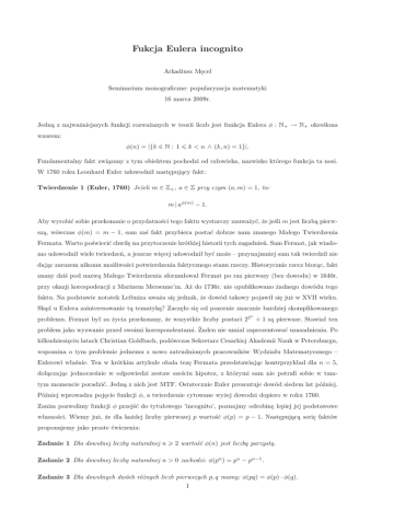 Jedną z najważniejszych funkcji rozważanych w teorii liczb jest funkcja Eulera φ : N+ → N+ określona