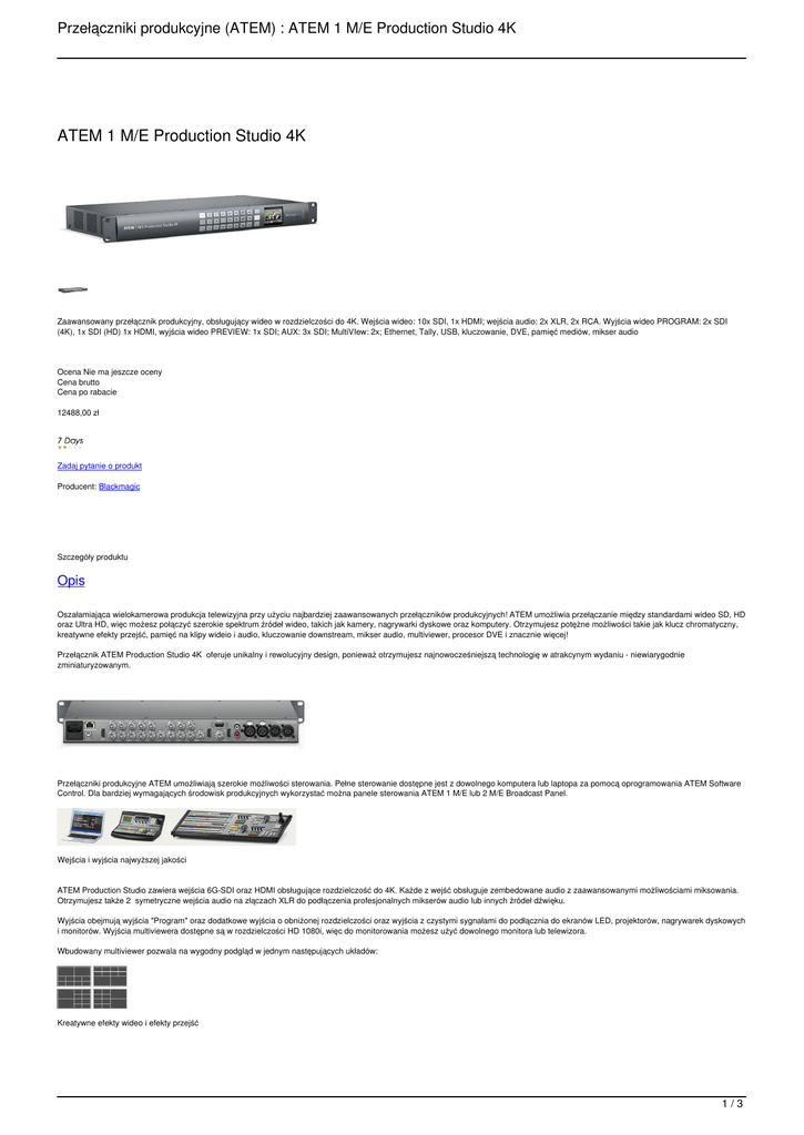 Przełączniki produkcyjne (ATEM) : ATEM 1 M/E Production Studio 4K ATEM 1 M/E Production Studio 4K Zaawansowany przełącznik produkcyjny, obsługujący wideo w rozdzielczości do 4K. Wejścia wideo: 10x SDI, 1x HDMI; wejścia audio: 2x XLR, 2x RCA. Wyjścia wideo PROGRAM: 2x SDI (4K), 1x SDI (HD) 1x HDMI, wyjścia wideo PREVIEW: 1x SDI; AUX: 3x SDI; MultiVIew: 2x; Ethernet, Tally, USB, kluczowanie, DVE, pamięć mediów, mikser audio Ocena Nie ma jeszcze oceny Cena brutto Cena po rabacie 12488,00 zł Zadaj pytanie o produkt Producent: Blackmagic Szczegóły produktu Opis Oszałamiająca wielokamerowa produkcja telewizyjna przy użyciu najbardziej zaawansowanych przełączników produkcyjnych! ATEM umożliwia przełączanie między standardami wideo SD, HD oraz Ultra HD, więc możesz połączyć szerokie spektrum źródeł wideo, takich jak kamery, nagrywarki dyskowe oraz komputery. Otrzymujesz potężne możliwości takie jak klucz chromatyczny, kreatywne efekty przejść, pamięć na klipy wideio i audio, kluczowanie downstream, mikser audio, multiviewer, procesor DVE i znacznie więcej! Przełącznik ATEM Production Studio 4K oferuje unikalny i rewolucyjny design, ponieważ otrzymujesz najnowocześniejszą technologię w atrakcynym wydaniu - niewiarygodnie zminiaturyzowanym. Przełączniki produkcyjne ATEM umożliwiają szerokie możliwości sterowania. Pełne sterowanie dostępne jest z dowolnego komputera lub laptopa za pomocą oprogramowania ATEM Software Control. Dla bardziej wymagających środowisk produkcyjnych wykorzystać można panele sterowania ATEM 1 M/E lub 2 M/E Broadcast Panel. Wejścia i wyjścia najwyższej jakości ATEM Production Studio zawiera wejścia 6G-SDI oraz HDMI obsługujące rozdzielczość do 4K. Każde z wejść obsługuje zembedowane audio z zaawansowanymi możliwościami miksowania. Otrzymujesz także 2 symetryczne wejścia audio na złączach XLR do podłączenia profesjonalnych mikserów audio lub innych źródeł dźwięku. Wyjścia obejmują wyjścia "Program" oraz dodatkowe wyjścia o obniżonej rozdzielczości oraz wyjścia z czystymi sygnałami do podłącznia do ekranów LED, projektorów, nagrywarek dyskowych i monitorów. Wyjścia multiviewera dostępne są w rozdzielczości HD 1080i, więc do monitorowania możesz użyć dowolnego monitora lub telewizora. Wbudowany multiviewer pozwala na wygodny podgląd w jednym następujących układów: Kreatywne efekty wideo i efekty przejść 1/3 Przełączniki produkcyjne (ATEM) : ATEM 1 M/E Production Studio 4K ATEM umożliwia renderowanie w czasie rzeczywistym szerokiego spektrum efektów przejść we wszystkich rozdzielczościach - nawet w UltraHD. Efekty wideo obejmują zmianę położenia , zmianę rozmiaru, obrót i skalowanie okien w czasie rzeczywistym. Podwójny odtwarzacz plików Przełączniki produkcyjne ATEM posiadają dużą pamięć, w której przechowywać można statyczne obrazy w popularnych formatach i grafiki wykorzystywane np. do kluczowania, a także do 180 klatek materiału UltraHD lub do 720 kaltek materiału HD 1080p. Potężne narzędzia kluczowania ATEM umożliwia wysokiej jakości kluczowanie: luminancji, liniowe i chmoratyczne. Oprócz tego otrzymujez także możliwość wstawiania logo, napisów i innych grafik. Specyfikacja techniczna Liczba wejść wideo: 10 Liczba wyjść wideo: 8 Wejście SDI: 10 x 10-bitowe SD/HD/Ultra HD 4K. 2 kanały zembedowanego audio. Wejście HDMI: 1x HDMI typ A. 10-bitowe SD/HD/Ultra HD 4K. 2 kanały zembedowanego audio. Wyjścia analogowe audio: 2x XLR Wyjścia audio SDI: 2 kanały zembedowanego w SDI na wszystkich wyjściach Wejścia audio: 2x XLR, 2x RCA Wejście synchronizacji: Tri-Sync lub Blackburst Wyjścia Program SDI: 2x 10-bit SD/HD/Ultra HD 4K Wyjścia Program HDMI: 1x HDMI typ A. 10-bitowe SD/HD/Ultra HD 4K Wyjście Program SDI skalowane w dół: 1x 1-bit (z Ultra HD 4K na HD) Wyjście Preview SDI: 1x 10-bit SD/HD/Ultra HD 4K Wyjście SDI Aux.: 3x 10-bitowe SD/HD/Ultra HD 4K Liczba wyjść Multi View: 2 Wyjścia Multi View: 1x SDI, 1x HDMI Połączenie z panelem sterowania: Ethernet 10/100/1000 BaseT. Pozwala na bezpośrednie połączenie z panelem sterującym, lub połączenie przez sieć. Wyjście Tally: Możliwe przez połączenie ethernetowe z interfejsem Blackmagic Design GPI oraz Tally. Interfejs komputerowy: 1x port USB 2.0 Obsługa formatów SD: 525 59.94i NTSC, 625 50i PAL, 525 59.94i 16:9, 625 50i 16:9. Obsługa formatów HD: 720 50p, 720 59.94p 1080 50i, 1080 59.94i, 1080 23.98p, 1080 24p, 1080 25p, 1080 29.97p, 1080 50p, 1080 59.94p. Obsługa formatów Ultra HD 4K: 3840x2160 23.98p, 3840x2160 24p, 3840x2160 25p, 3840x2160 29.97p. Zgodność z SDI: SMPTE 259M, 292M. Próbkowanie wideo: 4:2:2 Precyzja kolorów: 10-bit Przestrzeń barw: REC 601, REC 709, REC 2020. Wejściowe komputerowe rozdzielczości HDMI: 720 x 480i 59.94Hz, 720 x 576i 50Hz, 1280 x 720 59.94Hz, 1280 x 720 50Hz, 1920 x 1080 50Hz, 1920 x 1080 59.94Hz, 3840 x 2160 23.98Hz, 3840 x 2160 24Hz, 3840 x 2160 25Hz, 3840 x 2160 29.97Hz. Oprogramowanie: ATEM Software Control Panel dla Mac OS X 10.7.2 lub 10.8 Mountain Lion oraz Windows 7 64-bit lub Windows 8 32-bit/64-bit Aktualizacja oprogramowania: Za pomocą połączenia USB 2.0 z komputerem (ATEM Switcher Utility) Konfiguracja: Za pomocą oprogramowania ATEM Software Control Panel, z wyłączeniem konfiguracji adresu IP, realizowanego przez program ATEM Switcher Utility (połączenie przez USB). Konwersja przestrzeni barw: Sprzętowa w czasie rzeczywistym Opóźnienie przetwarzania: poniżej 2 linii Mikser audio: 12 wejść x 2 kanały. Audio-Follow-Video wł./wył.; monitorowanie level, peak; regulacja wzmocnienia Master gain, wyjścia analogowe mogą służyć do oddzielnego monitoringu. Skalowanie w dół 4K na HD: Tak, Program x1 Systemy operacyjne: Mac OS X 10.7 Lion lub późniejszy, Mac OS X 10.8 Mountain Lion lub późniejszy, Windows 7 64-bit, Windows 8 32-bit lub 64-bit. Całkowita liczba warstw: 8 Up