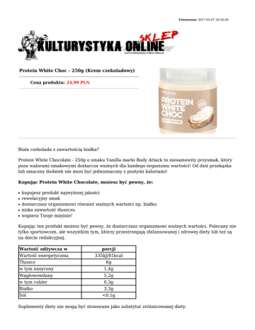 Utworzono: 2017-03-07 20:34:04 Protein White Choc - 250g (Krem czekoladowy) Cena produktu: 24,99 PLN Biała czekolada z zawartością białka? Protein White Chocolate - 250g o smaku Vanilla marki Body Attack to niesamowity przysmak, który poza walorami smakowymi dostarcza ważnych dla każdego organizmu wartości! Od dziś przekąska lub smaczny dodatek nie musi być jednoznaczny z pustymi kaloriami! Kupując Protein White Chocolate, możesz być pewny, że: ● ● ● ● ● kupujesz produkt najwyższej jakości rewelacyjny smak dostarczasz organizmowi również ważnych wartości np. białko niska zawartość tłuszczu wspiera Twoje mięśnie! Kupując ten produkt możesz być pewny, że dostarczasz organizmowi ważnych wartości. Polecany nie tylko sportowcom, ale wszystkim tym, którzy przestrzegają zbilansowanej i zdrowej diety lub też są na diecie redukcyjnej. Wartość odżywcza w porcji Wartość energetyczma 335kJ/81kcal Tłuszcz 6g w tym nasycony 1,4g Węglowowdany 5,2g w tym cukier 0,3g Białko 3,3g Sól <0,1g Suplementy diety nie mogą być stosowane jako substytut zróżnicowanej diety. Pamiętaj, że tylko zdrowy tryb życia i zrównoważony sposób odżywiania zapewniają prawidłowe funkcjonowanie organizmu i zachowanie dobrej kondycji. Sposób użycia: Spożywać według własnego zapotrzebowania. Nie przekraczać zalecanej porcji do spożycia w ciągu dnia. Produkt nie może być stosowany przez osoby uczulone na którykolwiek z jego składników. Najlepiej spożyć przed końcem: miesiąc, rok pod kodem kreskowym Numer partii produkcyjnej: pod kodem kreskowym Przechowywać w miejscu niedostępnym dla małych dzieci. Przechowywać w miejscu suchym w temperaturze pokojowej w szczelnie zamkniętych opakowaniach. Masa netto opakowania: 250g Adres: http://www.ko.sklep.pl/ Telefon: kom. 782 010 880 Email: [email protected]