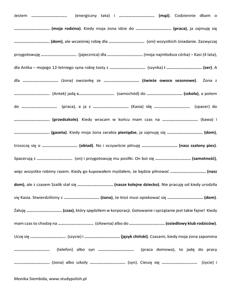 Jestem ………………………….. (energiczny tata) i ………………………….. (mąż). Codziennie dbam o ………………………….. (moja rodzina). Kiedy moja żona idzie do ………………………….. (praca), ja zajmuję się …………………………..(dom),alewcześniejrobiędla…………………………..(oni)wszystkichśniadanie.Zazwyczaj przygotowuję…………………………..(jajecznica)dla…………………………..(mojanajmłodszacórka)–Kasi(4lata), dlaAntka–mojego12-letniegosynarobiętostyz…………………………..(szynka)i…………………………..(ser).A dla ………………………….. (żona) owsiankę ze ………………………….. (świeże owoce sezonowe). Żona z …………………………..(Antek)jadąs…………………………..(samochód)do…………………………..(szkoła),apotem do ………………………….. (praca), a ja z ………………………….. (Kasia) idę ………………………….. (spacer) do ………………………….. (przedszkole). Kiedy wracam w końcu mam czas na ………………………….. (kawa) i …………………………..(gazeta).Kiedymojażonazarabiapieniądze,jazajmujęsię…………………………..(dom), troszczę się o ………………………….. (obiad). No i oczywiście pilnuję ………………………….. (nasz szalony pies). Spacerująz…………………………..(on)iprzygotowujęmuposiłki.Onboisię…………………………..(samotność), więcwszystkorobimyrazem.Kiedygokupowałemmyślałem,żebędziepilnować…………………………..(nasz dom),alezczasemSzalikstałsię…………………………..(naszekolejnedziecko).Niepracujęodkiedyurodziła sięKasia.Stwierdziliśmyz…………………………..(żona),żektośmusiopiekowaćsię…………………………..(dom). Żałuję…………………………..(czas),któryspędziłemwkorporacji.Gotowanieisprzątaniejesttakiefajne!Kiedy mamczastochodzęna…………………………..(siłownia)albodo…………………………..(osiedlowyklubrodziców). Uczęsię…………………………..(szycie)i…………………………..(językchiński).Czasami,kiedymojażonazapomina ………………………….. (telefon) albo syn ………………………….. (praca domowa), to jadę do pracy ………………………….. (żona) albo szkoły ………………………….. (syn). Cieszę się ………………………….. (życie) i MonikaSiembida,www.studypolish.pl ………………………….. (moja wolność). Nigdy nie byłem tak szczęśliwy jak teraz. Nie potrzebuję pieniędzy i ………………………….. (praca), żeby być (szczęśliwy człowiek). Nie przeszkadza mi, kiedy moja żona płaci za ………………………….. (kolacja) w restauracji albo za ………………………….. (nasze wakacje) w orientalnych krajach.Mówiłemjuż,żepasjonujęsię…………………………..(gotowanie).Czasamipotrafięmiesiącamiszukać s………………………….. (składnik) do ………………………….. (moja potrawa) albo ………………………….. (specjalny sos). Często zamawiam przyprawy z ………………………….. (Afryka) albo ………………………….. (Azja). Kocham ………………………….. (kuchnia orientalna). Nie cierpię ………………………….. (prosta kuchnia) ani ………………………….. (bałagan), dlatego jestem ………………………….. (perfekcyjny pan domu). Obok …………………………..(my)mieszkaKasia–matkatrójkidzieci.Jejmążcałedniespędzawpracy,dlategoKasia częstoprzychodzido…………………………..(ja)na…………………………..(kawa)igorąceciasteczka.Kasienielubi …………………………..(swojeżycie)ani…………………………..(gotowanie).Częstoplotkujemyrazemnatemat …………………………..(naszsąsiad)Zdzisława.Czasamiprzychodzido…………………………..(ja)teściowa,kiedy jestem sam. Ona często krytykuje ………………………….. (ja). Słucham ………………………….. (ona) uważnie, a kiedywracadodomurobięwszystkoposwojemu.Pocosiędenerwować?Tobez…………………………..(sens). MonikaSiembida,www.studypolish.pl