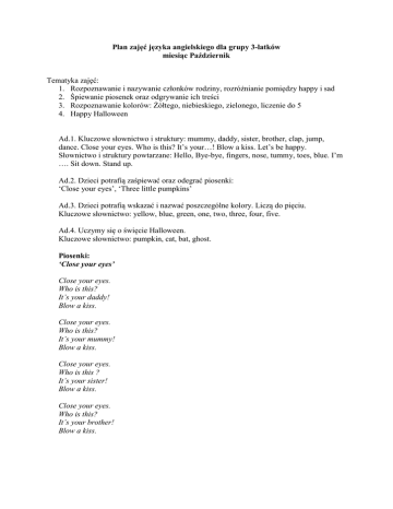Plan zajęć języka angielskiego dla grupy 3-latków miesiąc Październik Tematyka zajęć: 1. Rozpoznawanie i nazywanie członków rodziny, rozróżnianie pomiędzy happy i sad 2. Śpiewanie piosenek oraz odgrywanie ich treści 3. Rozpoznawanie kolorów: Żółtego, niebieskiego, zielonego, liczenie do 5 4. Happy Halloween Ad.1. Kluczowe słownictwo i struktury: mummy, daddy, sister, brother, clap, jump, dance. Close your eyes. Who is this? It’s your…! Blow a kiss. Let’s be happy. Słownictwo i struktury powtarzane: Hello, Bye-bye, fingers, nose, tummy, toes, blue. I’m …. Sit down. Stand up. Ad.2. Dzieci potrafią zaśpiewać oraz odegrać piosenki: ‘Close your eyes’, ‘Three little pumpkins’ Ad.3. Dzieci potrafią wskazać i nazwać poszczególne kolory. Liczą do pięciu. Kluczowe słownictwo: yellow, blue, green, one, two, three, four, five. Ad.4. Uczymy się o święcie Halloween. Kluczowe słownictwo: pumpkin, cat, bat, ghost. Piosenki: ‘Close your eyes’ Close your eyes. Who is this? It’s your daddy! Blow a kiss. Close your eyes. Who is this? It’s your mummy! Blow a kiss. Close your eyes. Who is this ? It’s your sister! Blow a kiss. Close your eyes. Who is this? It’s your brother! Blow a kiss. ‘Three little pumpkins’ One, two, three little pumpkins. One, two, three, little pumpkins. One, two, three little pumpkins. Three little pumpkins for Halloween. Three, two, one little pumpkin. Three, two, one little pumpkin. Three, two, one little pumpkin. One little pumpkin for Halloween.