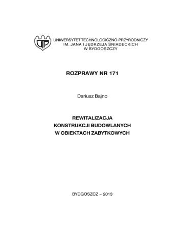 UNIWERSYTET TECHNOLOGICZNO-PRZYRODNICZY IM. JANA I JÊDRZEJA ŒNIADECKICH W BYDGOSZCZY ROZPRAWY NR 171 Dariusz Bajno REWITALIZACJA KONSTRUKCJI BUDOWLANYCH W OBIEKTACH ZABYTKOWYCH BYDGOSZCZ – 2013 REDAKTOR NACZELNY prof. dr hab. in¿. Józef Flizikowski REDAKTOR DZIA£OWY dr in¿. Krzysztof Paw³owski OPINIODAWCY dr hab. in¿. Andrzej Dylla, prof. nadzw. UTP dr hab. in¿. Aleksander Œwitoñski, prof. nadzw. UTP OPRACOWANIE REDAKCYJNE I TECHNICZNE mgr Dorota Œlachciak, mgr Tomasz Sza³ajda © Copyright Wydawnictwa Uczelniane Uniwersytetu Technologiczno-Przyrodniczego Bydgoszcz 2013 Utwór w ca³oœci ani we fragmentach nie mo¿e byæ powielany ani rozpowszechniany za pomoc¹ urz¹dzeñ elektronicznych, mechanicznych, kopiuj¹cych, nagrywaj¹cych i innych bez pisemnej zgody posiadacza praw autorskich. ISBN 978-83-64235-01-6 ISSN 0209-0597 Wydawnictwa Uczelniane Uniwersytetu Technologiczno-Przyrodniczego ul. Ks. A. Kordeckiego 20, 85-225 Bydgoszcz, tel. 52 3749482, 3749426 e-mail: [email protected] http://www.wu.utp.edu.pl Wyd. I. Nak³ad 52 egz. Ark. aut. 14,8. Ark. druk. 15,1. Oddano do druku i druk ukoñczono w sierpniu 2013 Uczelniany Zak³ad Ma³ej Poligrafii UTP Bydgoszcz, ul. Ks. A. Kordeckiego 20 170 WNIOSKI 1. Rewitalizacja obiektów zabytkowych powinna być procesem „przemyślanym”, który będzie mógł przynieść pożądany efekt tylko wówczas, gdy zostanie przeprowadzony kompleksowo, a to w każdym przypadku będzie uzależnione od świadomości osób/instytucji odpowiedzialnych za eksploatację zabytków nieruchomych oraz od ich możliwości finansowych. 2. Nieuniknione jest, że każda ingerencja w zabytek będzie obniżać jego autentyczność, lecz powinna zostać tak przeprowadzona, aby przyniosła jak najwięcej korzyści przy możliwie niskim ryzyku wyrządzenia szkody wskutek prowadzenia prac i stosowania np. nowych technologii; ocena ryzyka powinna znaleźć się w opracowaniach projektowych dotyczących ratowania lub adaptowania zabytków do innych celów niż pierwotne. 3. Wprowadzenie nowych technologii (aktualnie stosowanych na rynku budowlanym), w tym wbudowywanie nowych materiałów w konstrukcje zabytkowe, nie powinno generować negatywnego wpływu na bezpieczeństwo użytkowania, trwałość, estetykę oraz zachowanie walorów historycznych tych konstrukcji, jak również całych obiektów, w których występują. 4. Nie jest znana liczba obiektów będących w pełni zabytkami, ponieważ udział substancji zabytkowej w strukturze obiektu wpisanego do rejestru zabytków można ocenić dopiero na podstawie poddania ich szczegółowym badaniom − autor monografii nie spotkał się z wynikami takich badań. 5. Wszystkich uczestników procesu budowlanego, przyjmujących na siebie obowiązki projektowania, kierowania robotami oraz ich nadzorowania w obiektach zabytkowych lub w otoczeniu zabytków, powinien cechować wysoki poziom odpowiedzialności, doświadczenia zawodowego oraz wiedzy praktycznej, opartej na aktualnych osiągnięciach nauki i techniki. 6. Zabytki nieruchome, mimo że często są mylnie postrzegane jako obiekty o prostej i masywnej budowie, wymagają znacznie większego zaangażowania nakładów remontowo-inwestycyjnych niż pozostałe obiekty. 7. Trwałość konstrukcji zabytkowych nie powinna być rozpatrywana jedynie w kategoriach ich wieku, wyglądu oraz nośności elementów konstrukcji. 8. Podczas przygotowywania dokumentacji projektowej remontu, adaptacji lub modernizacji obiektu będącego zabytkiem zbyt często pomija się wykonywanie badań oceniających fizykalne warunki dalszego użytkowania takich obiektów, być może już w zupełnie innym niż zakładano pierwotnie klimacie środowiska wewnętrznego. 9. Zaniechanie obowiązku przeprowadzania okresowych przeglądów technicznych w obiektach zabytkowych lub lekceważące ich wykonywanie jest równoważne z przyzwoleniem na nieodwracalne uszkodzenie lub całkowitą utratę tych zabytków. 10. Badania konstrukcji zabytków nieruchomych należy przeprowadzać przy użyciu wszelkich dostępnych i skutecznych urządzeń oraz technik nieniszczących, w celu uzyskania jak najbardziej wiarygodnych wyników ocen stanu technicznego. 11. Rewitalizacja obiektów zabytkowych powinna przynosić korzyści przede wszystkim samym zabytkom, a dopiero w dalszej kolejności ich właścicielom.