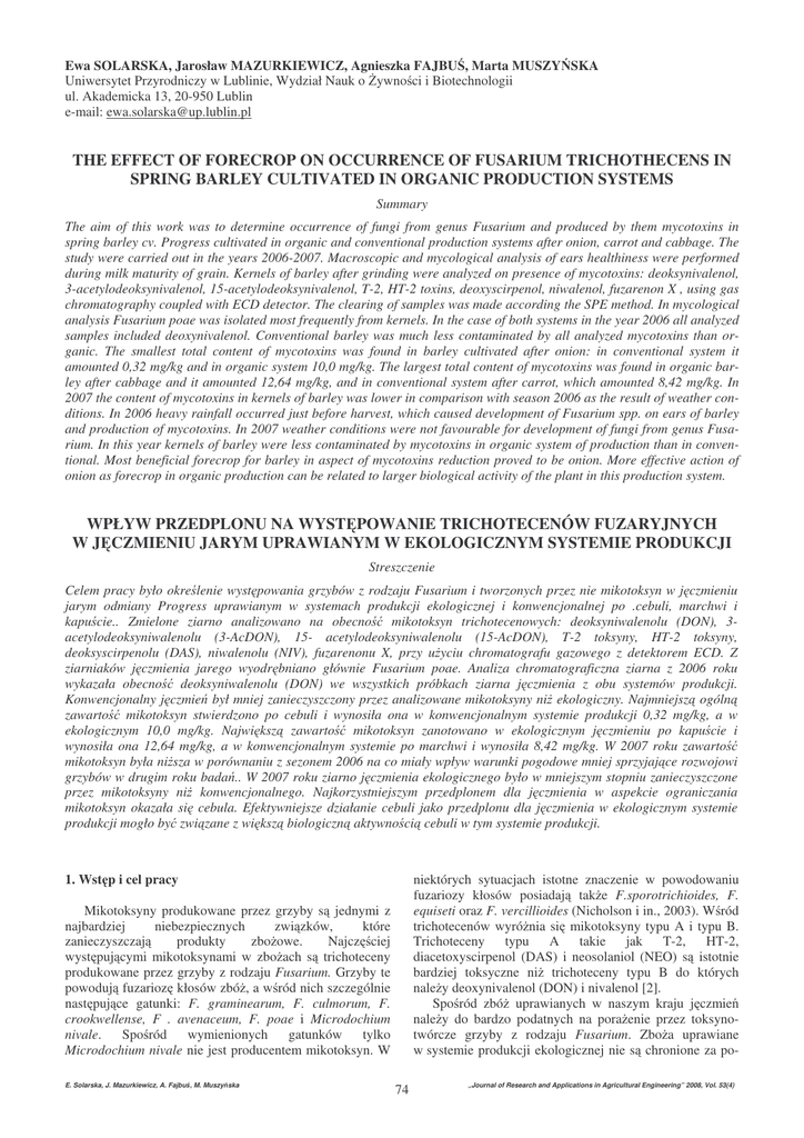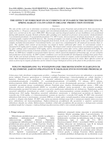 Ewa SOLARSKA, Jarosław MAZURKIEWICZ, Agnieszka FAJBU , Marta MUSZY SKA Uniwersytet Przyrodniczy w Lublinie, Wydział Nauk o ywno ci i Biotechnologii ul. Akademicka 13, 20-950 Lublin e-mail: [email protected] THE EFFECT OF FORECROP ON OCCURRENCE OF FUSARIUM TRICHOTHECENS IN SPRING BARLEY CULTIVATED IN ORGANIC PRODUCTION SYSTEMS Summary The aim of this work was to determine occurrence of fungi from genus Fusarium and produced by them mycotoxins in spring barley cv. Progress cultivated in organic and conventional production systems after onion, carrot and cabbage. The study were carried out in the years 2006-2007. Macroscopic and mycological analysis of ears healthiness were performed during milk maturity of grain. Kernels of barley after grinding were analyzed on presence of mycotoxins: deoksynivalenol, 3-acetylodeoksynivalenol, 15-acetylodeoksynivalenol, T-2, HT-2 toxins, deoxyscirpenol, niwalenol, fuzarenon X , using gas chromatography coupled with ECD detector. The clearing of samples was made according the SPE method. In mycological analysis Fusarium poae was isolated most frequently from kernels. In the case of both systems in the year 2006 all analyzed samples included deoxynivalenol. Conventional barley was much less contaminated by all analyzed mycotoxins than organic. The smallest total content of mycotoxins was found in barley cultivated after onion: in conventional system it amounted 0,32 mg/kg and in organic system 10,0 mg/kg. The largest total content of mycotoxins was found in organic barley after cabbage and it amounted 12,64 mg/kg, and in conventional system after carrot, which amounted 8,42 mg/kg. In 2007 the content of mycotoxins in kernels of barley was lower in comparison with season 2006 as the result of weather conditions. In 2006 heavy rainfall occurred just before harvest, which caused development of Fusarium spp. on ears of barley and production of mycotoxins. In 2007 weather conditions were not favourable for development of fungi from genus Fusarium. In this year kernels of barley were less contaminated by mycotoxins in organic system of production than in conventional. Most beneficial forecrop for barley in aspect of mycotoxins reduction proved to be onion. More effective action of onion as forecrop in organic production can be related to larger biological activity of the plant in this production system. WPŁYW PRZEDPLONU NA WYST POWANIE TRICHOTECENÓW FUZARYJNYCH W J CZMIENIU JARYM UPRAWIANYM W EKOLOGICZNYM SYSTEMIE PRODUKCJI Streszczenie Celem pracy było okre lenie wyst powania grzybów z rodzaju Fusarium i tworzonych przez nie mikotoksyn w j czmieniu jarym odmiany Progress uprawianym w systemach produkcji ekologicznej i konwencjonalnej po .cebuli, marchwi i kapu cie.. Zmielone ziarno analizowano na obecno mikotoksyn trichotecenowych: deoksyniwalenolu (DON), 3acetylodeoksyniwalenolu (3-AcDON), 15- acetylodeoksyniwalenolu (15-AcDON), T-2 toksyny, HT-2 toksyny, deoksyscirpenolu (DAS), niwalenolu (NIV), fuzarenonu X, przy u yciu chromatografu gazowego z detektorem ECD. Z ziarniaków j czmienia jarego wyodr bniano głównie Fusarium poae. Analiza chromatograficzna ziarna z 2006 roku wykazała obecno deoksyniwalenolu (DON) we wszystkich próbkach ziarna j czmienia z obu systemów produkcji. Konwencjonalny j czmie był mniej zanieczyszczony przez analizowane mikotoksyny ni ekologiczny. Najmniejsz ogóln zawarto mikotoksyn stwierdzono po cebuli i wynosiła ona w konwencjonalnym systemie produkcji 0,32 mg/kg, a w ekologicznym 10,0 mg/kg. Najwi ksz zawarto mikotoksyn zanotowano w ekologicznym j czmieniu po kapu cie i wynosiła ona 12,64 mg/kg, a w konwencjonalnym systemie po marchwi i wynosiła 8,42 mg/kg. W 2007 roku zawarto mikotoksyn była ni sza w porównaniu z sezonem 2006 na co miały wpływ warunki pogodowe mniej sprzyjaj ce rozwojowi grzybów w drugim roku bada .. W 2007 roku ziarno j czmienia ekologicznego było w mniejszym stopniu zanieczyszczone przez mikotoksyny ni konwencjonalnego. Najkorzystniejszym przedplonem dla j czmienia w aspekcie ograniczania mikotoksyn okazała si cebula. Efektywniejsze działanie cebuli jako przedplonu dla j czmienia w ekologicznym systemie produkcji mogło by zwi zane z wi ksz biologiczn aktywno ci cebuli w tym systemie produkcji. 1. Wst p i cel pracy niektórych sytuacjach istotne znaczenie w powodowaniu fuzariozy kłosów posiadaj tak e F.sporotrichioides, F. equiseti oraz F. vercillioides (Nicholson i in., 2003). W ród trichotecenów wyró nia si mikotoksyny typu A i typu B. Trichoteceny typu A takie jak T-2, HT-2, diacetoxyscirpenol (DAS) i neosolaniol (NEO) s istotnie bardziej toksyczne ni trichoteceny typu B do których nale y deoxynivalenol (DON) i nivalenol [2]. Spo ród zbó uprawianych w naszym kraju j czmie nale y do bardzo podatnych na pora enie przez toksynotwórcze grzyby z rodzaju Fusarium. Zbo a uprawiane w systemie produkcji ekologicznej nie s chronione za po- Mikotoksyny produkowane przez grzyby s jednymi z najbardziej niebezpiecznych zwi zków, które zanieczyszczaj produkty zbo owe. Najcz ciej wyst puj cymi mikotoksynami w zbo ach s trichoteceny produkowane przez grzyby z rodzaju Fusarium. Grzyby te powoduj fuzarioz kłosów zbó , a w ród nich szczególnie nast puj ce gatunki: F. graminearum, F. culmorum, F. crookwellense, F . avenaceum, F. poae i Microdochium nivale. Spo ród wymienionych gatunków tylko Microdochium nivale nie jest producentem mikotoksyn. W E. Solarska, J. Mazurkiewicz, A. Fajbu , M. Muszy ska 74 „Journal of Research and Applications in Agricultural Engineering” 2008, Vol. 53(4) moc chemicznych preparatów przeciwgrzybowych, s dzi si wi c e ro liny te s bardziej nara one na zanieczyszczenia przez mikotoksyny ni w systemie produkcji konwencjonalnej. Z drugiej strony liczne informacje z pi miennictwa wskazuj ce na mniejsze zawarto ci mikotoksyn w zbo ach lub ich produktach pochodz cych z uprawy ekologicznej w porównaniu z konwencjonaln , sugeruj e czynniki biologiczne takie jak nast 