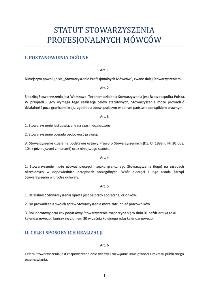 STATUT STOWARZYSZENIA PROFESJONALNYCH MOWCOW I. POSTANOWIENIA OGÓLNE Art. 1 Niniejszym powołuje się „Stowarzyszenie Profesjonalnych Mówców”, zwane dalej Stowarzyszeniem. Art. 2 Siedzibą Stowarzyszenia jest Warszawa. Terenem działania Stowarzyszenia jest Rzeczpospolita Polska. W przypadku, gdy wymaga tego realizacja celów statutowych, Stowarzyszenie może prowadzić działalność poza granicami kraju, zgodnie z obowiązującym w danym państwie porządkiem prawnym. Art. 3 1. Stowarzyszenie jest zawiązane na czas nieoznaczony. 2. Stowarzyszenie posiada osobowość prawną. 3. Stowarzyszenie działa na podstawie ustawy Prawo o Stowarzyszeniach (Dz. U. 1989 r. Nr 20 poz. 104 z późniejszymi zmianami) oraz niniejszego statutu. Art. 4 1. Stowarzyszenie może używać pieczęci i znaku graficznego Stowarzyszenia (logo) na zasadach określonych w odpowiednich przepisach szczególnych. Wzór pieczęci i logo ustala Zarząd Stowarzyszenia w drodze uchwały. Art. 5 1. Działalność Stowarzyszenia oparta jest na pracy społecznej członków. 2. Do prowadzenia swoich spraw Stowarzyszenie może zatrudniać pracowników. 3. Rok obrotowy oraz rok podatkowy Stowarzyszenia rozpoczyna się w dniu 01 października roku kalendarzowego i kończy się z dniem 30 września kolejnego roku kalendarzowego. II. CELE I SPOSOBY ICH REALIZACJI Art. 6 Celem Stowarzyszenia jest rozpowszechnianie wiedzy i rozwijanie umiejętności z zakresu publicznego przemawiania. 1 Art. 7 Stowarzyszenie realizuje swoje cele poprzez: 1) organizowanie spotkań, wykładów, warsztatów i konferencji poświęconych umiejętnościom związanym z publicznym przemawianiem, 2) współpracę z innymi podmiotami posiadającymi cele zbieżne z celami Stowarzyszenia, w zakresie promocji i rozpowszechniania wiedzy oraz rozwijania umiejętności obejmujących wystąpienia publiczne, poprzez podejmowanie działań określonych w pkt 1), 3) przekazywanie informacji na temat działalności Stowarzyszenia szerokim kręgom społecznym za pomocą środków masowego przekazu, 4) prowadzenie własnej działalności publikacyjnej o charakterze niegospodarczym w zakresie związanym z rozpowszechnianiem wiedzy na temat retoryki i erystyki, 5) podejmowanie działań mających zapewnić wsparcie sponsorów dla realizacji celów statutowych Stowarzyszenia. III. CZŁONKOWIE, ICH PRAWA I OBOWIĄZKI Art. 8 Stowarzyszenie posiada członków: 1) 2) 3) 4) aspirujących, zwyczajnych, honorowych wspierających. Art. 9 1. Członkami Stowarzyszenia mogą być osoby fizyczne lub osoby prawne. 2. Członkami aspirującymi, zwyczajnymi i honorowymi Stowarzyszenia mogą zostać osoby fizyczne, a członkami wspierającymi - osoby fizyczne lub prawne. 3. Członkiem aspirującym Stowarzyszenia może zostać osoba fizyczna która złożyła na ręce sekretarza Stowrzyszenia dwa listy polecające członków zwyczajnych. 4. Członkiem zwyczajnym Stowarzyszenia może być osoba fizyczna będąca członkiem aspirującym przez przynajmniej 12 miesięcy która dla okresu 12 miesięcy przed datą złożenia wniosku o członkostwo zwyczajne: 1) spełniła jeden z poniższych warunków: a) przeprowadziła 12 prezentacji w miejscu pracy do publiczności większej niż 15 osób potwierdzonymi przez pracodawcę aplikanta, b) przeprowadziła 12 prezentacji do publiczności większej niż 15 osób za które aplikant dostał wynagrodzenie, c) zarobiła co najmniej 30 000 PLN brutto poprzez prezentacje, przemowy i wystąpienia, 2 d) przeprowadziła 12 prezentacji w miejscu pracy do publiczności większej niż 15 osób potwierdzone na podstawie wypełnionej deklaracji kandydata. Art. 10 Członków aspirujących, zwyczajnych, honorowych i wspierających przyjmuje w drodze uchwały Zarząd, na podstawie podpisania przez kandydata na członka Stowarzyszenia pisemnej deklaracji o przystąpieniu do Stowarzyszenia i akceptacji postanowień jego statutu. Art. 11 1. Członkiem wspierającym może zostać osoba prawna lub prowadząca działalność gospodarczą zainteresowana działalnością Stowarzyszenia, która prowadzi działalność w branży przemówień profesjonalnych. 2. Osoba prawna działa w Stowarzyszeniu przez swojego przedstawiciela. 3. Zarząd, w drodze uchwały, wyraża zgodę na osobę przedstawiciela, o którym mowa w ust. 2. Art. 12 Członkiem honorowym może zostać osoba fizyczna szczególnie zasłużona dla Stowarzyszenia, która wniosła wkład w rozwój idei i realizację celów statutowych Stowarzyszenia. Tytuł członka honorowego nadaje Zarząd na podstawie wniosku wniesionego przez jednego z członków Zarządu w drodze uchwały przegłosowanej większością głosów przy akceptacji tego wniosku przez wszystkich członków stowarzyszenia po podaniu wniosku do wiaodmości w sposób zwyczajowo ustalony. Art 13a 1. Członkowie aspirujący i zwyczajni mają prawo do: 1) czynnego i biernego prawa wyborczego w wyborach do wszystkich władz Stowarzyszenia, 2) uczestniczenia w Walnym Zebraniu Członków z głosem stanowiącym, 3) wypowiadania się i wyrażania opinii we wszelkich kwestiach dotyczących działalności Stowarzyszenia, 4) uczestniczenia w kształtowaniu i realizacji programu Stowarzyszenia poprzez konsultacje w tym zakresie z władzami Stowarzyszenia, 5) używania logo Stowarzyszenia wyłącznie w zakresie działalności związanej z członkostwem w Stowarzyszeniu, 6) zwrócenia się do Sądu Koleżeńskiego z wnioskiem o rozstrzygnięcie sporu, o którym mowa w art. 33 ust. 1. 2. Członkowie aspirujący i zwyczajni mają obowiązek w przeciągu całego okresu trwania członkostwa: 1) 2) 3) 4) przestrzegania statutu, regulaminów i uchwał władz Stowarzyszenia, aktywnego udziału w realizacji statutowych celów Stowarzyszenia, opłacania składek członkowskich, dbania o dobre imię Stowarzyszenia. Art. 13b 3 1. Członkowie aspirujący Stowarzyszenia poza prawami zawartymi w art. 13a ust. 1 mają prawo do: 1) uczestniczenia w szkoleniach oraz imprezach 
