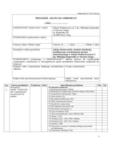 Załącznik nr 2 do Umowy PROTOKÓŁ ZDAWCZO–ODBIORCZY z dnia …………………. ZAMAWIAJĄCY (pełna nazwa i adres) Szkoła Podstawowa nr 2 im. Mikołaja Kopernika w Nowym Targu ul. Kopernika 28 34-400 Nowy Targ WYKONAWCA (pełna nazwa i adres) Umowa nr ….. z dnia ……..…../ Oferta z dnia …..……… Przedmiot i zakres protokołu: zakup, dostarczenie, montaż, instalacja, konfiguracja, uruchomienie sprzętu elektronicznego w Szkole Podstawowej nr 2 im. Mikołaja Kopernika w Nowym Targu WYKONAWCA przekazuje, a ZAMAWIAJĄCY odbiera gotowe do użytkowania wyposażenie wymienione w Szczegółowym opisie przedmiotu zamówienia (załącznik do Umowy) Wartość netto wyposażenia będącego przedmiotem Uwagi i zastrzeżenia: odbioru: Umowa z dnia / Oferta z dnia Podpis osoby upoważnionej przez Zamawiającego Lp. 1. Nazwa przedmiotu Wizualizer: Model - AVER U50 lub o parametrach nie gorszych niż podane Producent Ilość Podpis osoby Wykonawcę: upoważnionej Specyfikacja przedmiotu przez Tak Wymagania techniczne: 1) Sensor (przetwornik): CMOS, 2) Rozdzielczość (efektywna): Full HD 1080p (1920x1080), 3) Częstotliwość odświeżania: 30fps 4) Zoom cyfrowy: 8x, 5) Ilość pikseli (efektywna): 5M, 6) Fokus: automatyczny/ręczny, 7) Typ głowicy: gęsia szyja, 8) Pilot zdalnego sterowania: tak 9) Oświetlenie zewnętrzne: 1x 10) Typ oświetlenia: LED 11) Porty komunikacyjne: mini USB lub USB 12) Waga: 1,5 kg 13) Wymiary max.: 248 x 448 x 390mm 14) Wymiary min.: 259 x 39 x 163mm 15) Zasilacz: USB 16) Akcesoria w zestawie: instrukcja obsługi, przystawka do mikroskopu 17) Gwarancja: minimum 2 lata 1 Nie 2. 3. Urządzenie wielofunkcyjne: Brother DCPL2520DW lub inna o parametrach nie gorszych niż podane Tablica interaktywna QOMO QWB-200 PS (porcelanowa, magnetyczna) lub inna o parametrach nie gorszych niż podane Wymagania techniczne: 1) Funkcje: druk/skan/kopia, 2) Technologia druku: laserowa, 3) Automatyczny druk dwustronny, 4) Poziom hałasu: max 49 dB 5) Format: A4 6) Pamięć: 32 MB 7) Szybkość procesora: 266 MHz 8) Rozdzielczość druku mono: 2400x600dpi 9) Szybkość drukowania do 26 str./min. 10) Optyczna rozdzielczość skanowania: do 600 x 2400 dpi 11) Skanowanie: w kolorze, do emaila, do PDF 12) Rozdzielczość kopiowania: 600x600 dpi 13) Standardowe języki druku: GDI 14) Zasilanie: sieciowe AC 15) Wyświetlacz: LCD 16) Wymagania systemowe: Windows 7, 8, Vista 17) Kabel USB 1,8 m, 18) Waga: 9,7 kg 19) Gwarancja: minimum 2 lata Wymagania techniczne: 1) Technologia IR (pozycjonowanie w podczerwieni) 2) Powierzchnia suchościeralna i magnetyczna, matowa, odporna na uszkodzenia 3) Obsługa za pomocą palca lub dowolnego wskaźnika 4) Rama tablicy: solidna aluminiowa 5) Przekątna tablicy min. 88" 6) Przekątna powierzchni roboczej min. 80" 7) Powierzchnia robocza: min. 1653 mm x 1159 mm 8) Obsługa tablicy: min. przez 4 osoby 9) Format: 4:3 10) Intuicyjne paski skrótów po obu bokach tablicy 11) Rozdzielczość: min. 4096x4096 12) Dokładność odczytu: min. 3 mm 13) Prędkość kursora: min. 120”/sekundę 14) Czas reakcji: min. 25 ms, ciągła kropka: min. 8 ms 15) Komunikacja: USB 16) W zestawie: 3 pisaki zakończone gąbką (czerwony, czarny, niebieski), wskaźnik teleskopowy, kabel USB min. 7 m, uchwyty do montażu na ścianie 17) Gwarancja : min. 60 miesięcy Certyfikaty: ISO9001 Deklaracja zgodności CE Wymagane oprogramowanie w języku polskim, posiadające min. możliwości: 1) Praca w 3 trybach: okna, ramki i pełnoekranowym 2) Obsługa gestów multitouch 3) Wbudowana baza obiektów pomocnych w przeprowadzaniu zajęć 4) Sterowanie komputerem przy pomocy tablicy interaktywnej 2 5) Funkcja automatycznego zapisywania pliku co zadany interwał czasu i odtwarzanie go po niekontrolowanym zamknięciu programu 6) Zmiana kolorów tła, wstawianie różnych wzorów tła z zewnętrznej bazy 7) Udoskonalony mechanizm rozpoznawania i wstawiania rozpoznanego pisma ręcznego (m.in. w języku polskim) 8) Rozpoznawanie narysowanych odręcznie kształtów i przekształcanie ich na figury geometryczne 9) Baza figur geometrycznych - pozwala na łatwe wstawianie figur oraz brył geometrycznych do prezentacji 10) Interaktywne narzędzia do geometrii - linijka, ekierka, kątomierz, cyrkiel 11) Dodatkowe narzędzia i grafiki ułatwiające naukę matematyki, chemii, fizyki i języka angielskiego 12) Możliwość selektywnego ujawniania informacji umieszczonych na ekranie 13) Wstawianie tekstu za pomocą klawiatury ekranowej 14) Obracanie, przesuwanie i zmiana rozmiaru obiektów 15) Wstawianie plików wykonanych w technologii Flash, plików graficznych, animacji i filmów z wewnętrznej bazy 16) Możliwość modyfikowania zawartej w oprogramowaniu tablicy bazy obiektów poprzez dodawanie własnych obiektów oraz porządkowanie ich w drzewiastej strukturze katalogów i podkatalogów 17) Wypełnianie wybranych obiektów kolorem lub obrazem 18) Możliwość grupowania/rozgrupowania obiektów graficznych 19) Funkcja pozwalająca blokować elementy, zabezpieczając przed ich przypadkową edycją 20) Regulacja stopnia przezroczystości obiektów 21) Możliwość powiększania wybranego fragmentu strony 22) Pisanie na ruchomym lub zatrzymanym obrazie 23) Zapisywanie wszystkich czynności ekranowych w postaci sygnału wideo z dźwiękiem z mikrofonu 24) Zapisywanie materiału powstałego na tablicy w czasie zajęć w następujących formatach: plik obrazu, strona internetowa, dokument PDF, prezentacja Power Point 25) Zachowywanie notatek wykonanych przy pomocy Tablicy w plikach popularnych aplikacji (MS Word, MS Excel, MS PowerPoint 26) Za pomocą oprogramowania można nanosić zmiany i tworzyć notatki na dowolnym dokumencie wyświetlonym na pulpicie naszego komputera 27) Personalizacja paska narzędzi poprzez zapisanie spersonalizowanych ustawień pod różnymi profilami 28) Możliwość zdefiniowania skrótów do wybranych programów, folderów, plików 29) Przypisywanie hiperłączy, skr