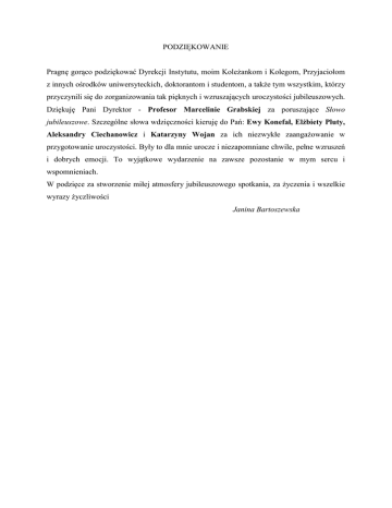 PODZIĘKOWANIE Pragnę gorąco podziękować Dyrekcji Instytutu, moim Koleżankom i Kolegom, Przyjaciołom z innych ośrodków uniwersyteckich, doktorantom i studentom, a także tym wszystkim, którzy przyczynili się do zorganizowania tak pięknych i wzruszających uroczystości jubileuszowych. Dziękuję Pani Dyrektor - Profesor Marcelinie Grabskiej za poruszające Słowo jubileuszowe. Szczególne słowa wdzięczności kieruję do Pań: Ewy Konefał, Elżbiety Pluty, Aleksandry Ciechanowicz i Katarzyny Wojan za ich niezwykłe zaangażowanie w przygotowanie uroczystości. Były to dla mnie urocze i niezapomniane chwile, pełne wzruszeń i dobrych emocji. To wyjątkowe wydarzenie na zawsze pozostanie w mym sercu i wspomnieniach. W podzięce za stworzenie miłej atmosfery jubileuszowego spotkania, za życzenia i wszelkie wyrazy życzliwości Janina Bartoszewska