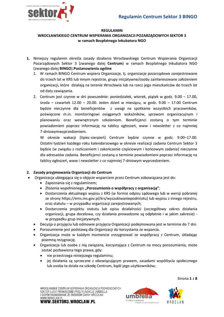 Regulamin Centrum Sektor 3 BINGO REGULAMIN WROCŁAWSKIEGO CENTRUM WSPIERANIA ORGANIZACJI POZARZĄDOWYCH SEKTOR 3 w ramach Bezpłatnego Inkubatora NGO 1. Niniejszy regulamin określa zasady działania Wrocławskiego Centrum Wspierania Organizacji Pozarządowych Sektor 3 (zwanego dalej Centrum) w ramach Bezpłatnego Inkubatora NGO (zwanego dalej BINGO).Postanowienia ogólne 1. W ramach BINGO Centrum wspiera Organizacje, tj. organizacje pozarządowe zarejestrowane do trzech lat w KRS lub innym rejestrze, grupy inicjatywne/osoby zainteresowane założeniem organizacji, które działają na terenie Wrocławia lub na rzecz jego mieszkańców do trzech lat od daty zawiązania. 2. Centrum jest czynne w dni powszednie: poniedziałek, wtorek, piątek w godz. 9.00 – 17.00, środa – czwartek 12.00 – 20.00. Jeden dzień w miesiącu, w godz. 9.00 – 17.00 Centrum będzie nieczynne dla beneficjentów z uwagi na spotkanie wszystkich pracowników, poświęcone m.in. monitoringowi osiąganych wskaźników, sprawom organizacyjnym i planowaniu oraz wewnętrznym szkoleniom. Beneficjenci zostaną o tym terminie powiadomieni poprzez informację na tablicy ogłoszeń, www i newsletter z co najmniej 7-dniowymwyprzedzeniem. W okresie wakacji (lipiec-sierpień) Centrum będzie czynne w godz. 9.00–17.00. Ostatni tydzień każdego roku kalendarzowego w okresie realizacji zadania Centrum Sektor 3 będzie (w związku z rozliczeniem i zakończenie częściowym i końcowym zadania) nieczynne dla adresatów zadania. Beneficjenci zostaną o terminie powiadomieni poprzez informację na tablicy ogłoszeń, www i newsletter z co najmniej 7-dniowym wyprzedzeniem. 2. Zasady przyjmowania Organizacji do Centrum Organizacja ubiegająca się o objęcie wsparciem przez Centrum zobowiązana jest do: Zapoznania się z regulaminem; Złożenia wypełnionego „Porozumienia o współpracy z organizacją”; Dostarczenia aktualnego wypisu z KRS (w formie odpisu sądowego lub w wersji pobranej ze strony https://ems.ms.gov.pl/krs/wyszukiwaniepodmiotu) lub wypisu z innego rejestru, oraz statutu – w przypadku organizacji zarejestrowanych; Dostarczenia projektu statutu lub opisu działalności (szczegółowy zakres działania organizacji, grupa docelowa, czy działania prowadzone są odpłatnie i w jakim zakresie) w przypadku grup inicjatywnych. Decyzja o przyjęciu lub odmowie przyjęcia Organizacji podejmowana jest w terminie do 7 dni. Porozumienie jest podstawą dla Organizacji do korzystania ze wsparcia. Organizacja może w każdym momencie zrezygnować ze współpracy z Centrum, składając pisemną rezygnację. Organizacja lub osoba z nią związana, korzystająca z Centrum na mocy porozumienia, może zostać pozbawiona tego prawa, gdy: nie przestrzega niniejszego regulaminu; jej działania są sprzeczne z obowiązującym prawem, zasadami współżycia społecznego lub osoba ta działa na szkodę Centrum, bądź jego użytkowników; Strona 1 z 8 Regulamin Centrum Sektor 3 BINGO przestaje być członkiem, pracownikiem, wolontariuszem organizacji, z którą Centrum podpisało Porozumienie; Centrum z uzasadnionych przyczyn, rezygnuje z dalszej współpracy z określoną organizacją. 3. Uprawnienia i obowiązki Organizacji korzystającej z Centrum Organizacja korzystająca z Centrum uprawniona jest do: bezpłatnego korzystania ze stanowisk biurowych, pomieszczeń i wyposażenia Centrum na potrzeby działalności statutowej organizacji; bezpłatnego udziału w szkoleniach; bezpłatnego korzystania z porad i konsultacji specjalistów zatrudnionych w Centrum; używania adresu Centrum jako adresu siedziby i/lub korespondencyjnego; korzystania z telefonu za odpłatnością (wg bilingu); bezpłatnego limitowanego korzystania z drukarki/ksero/faksu; bezpłatnego korzystania z serwera Centrum do hostowania stron www; bezpłatnego korzystania z biblioteki i czytelni Centrum; korzystania z różnych form informacji i promocji (m.in. internetowa, newsletter, tablice informacyjne, ścianki prezentacyjne); uczestniczenia we wszelkich otwartych wydarzeniach odbywających się w Centrum; Organizacja korzystająca z Centrum zobowiązana jest do: niezwłocznego informowania o zmianach statutu, składu organów reprezentujących organizację oraz danych adresowych i kontaktowych; przestrzegania regulaminu i zasad BHP; podporządkowania się uwagom i zaleceniom pracowników Centrum; regularnego odbierania poczty w przypadku korzystania z adresu korespondencyjnego; poniesienia ewentualnych kosztów napraw lub wymiany, w przypadku uszkodzenia lub zniszczenia sprzętu; umieszczenia na swojej stronie internetowej, na portalach społecznościowych (np. FB), wydawnictwach, poniższej informacji tekstowej wraz z logotypami, szczególnie w przypadku, gdy organizacja regularnie korzysta ze wsparcia infrastrukturalnego Centrum: „Nasza organizacja korzysta z pomocy Wrocławskiego Centrum Wspierania Organizacji Pozarządowych SEKTOR 3 prowadzonego przez Fundację Wspierania Organizacji Pozarządowych "Umbrella" a finansowanego przez Gminę Wrocław” Plik z logotypami można pobrać ze strony internetowej Centrum. po zakończeniu współpracy z Centrum, do usunięcia mebli, dokumentów i innego wyposażenia będącego własnością Organizacji oraz przekazania opróżnionych szaf, szuflad wraz z kluczem, a także usunięcia własnych zasobów z sieci komputerowej. Strona 2 z 8 Regulamin Centrum Sektor 3 BINGO 4. Szczegółowe zasady korzystania ze szkoleń Centrum oferuje bezpłatne szkolenia. Warunkiem udziału w szkoleniu jest osobiste, telefoniczne lub e-mailowe zgłoszenie chęci udziału w szkoleniu lub jeśli jest to wymagane, wypełnienie i przekazanie do Centrum wypełnionej ankiety zgłoszeniowej osobiście lub e-mailem. Aktualny harmonogram szkoleń znajduje się na stronie internetowej Centrum. O przyjęciu na szkolenie decyduje spełnienie określonych kryteriów podanych w ogłoszeniu o szkoleniu. Centrum zastrzega sobie możliwość ogranicze