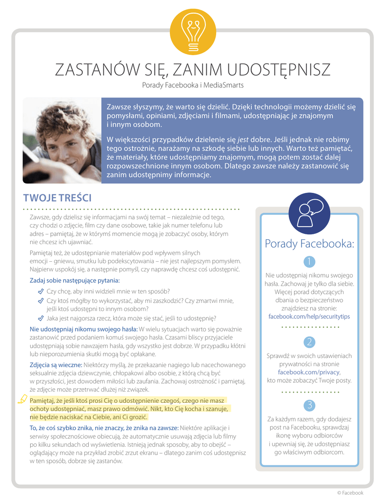 ZASTANÓW SIĘ, ZANIM UDOSTĘPNISZ Porady Facebooka i MediaSmarts Zawsze słyszymy, że warto się dzielić. Dzięki technologii możemy dzielić się pomysłami, opiniami, zdjęciami i filmami, udostępniając je znajomym i innym osobom. W większości przypadków dzielenie się jest dobre. Jeśli jednak nie robimy tego ostrożnie, narażamy na szkodę siebie lub innych. Warto też pamiętać, że materiały, które udostępniamy znajomym, mogą potem zostać dalej rozpowszechnione innym osobom. Dlatego zawsze należy zastanowić się zanim udostępnimy informacje. TWOJE TREŚCI Zawsze, gdy dzielisz się informacjami na swój temat – niezależnie od tego, czy chodzi o zdjęcie, film czy dane osobowe, takie jak numer telefonu lub adres – pamiętaj, że w którymś momencie mogą je zobaczyć osoby, którym nie chcesz ich ujawniać. Pamiętaj też, że udostępnianie materiałów pod wpływem silnych emocji – gniewu, smutku lub podekscytowania – nie jest najlepszym pomysłem. Najpierw uspokój się, a następnie pomyśl, czy naprawdę chcesz coś udostępnić. Zadaj sobie następujące pytania: Czy chcę, aby inni widzieli mnie w ten sposób? Czy ktoś mógłby to wykorzystać, aby mi zaszkodzić? Czy zmartwi mnie, jeśli ktoś udostępni to innym osobom? Jaka jest najgorsza rzecz, która może się stać, jeśli to udostępnię? Nie udostępniaj nikomu swojego hasła: W wielu sytuacjach warto się poważnie zastanowić przed podaniem komuś swojego hasła. Czasami bliscy przyjaciele udostępniają sobie nawzajem hasła, gdy wszystko jest dobrze. W przypadku kłótni lub nieporozumienia skutki mogą być opłakane. Zdjęcia są wieczne: Niektórzy myślą, że przekazanie nagiego lub nacechowanego seksualnie zdjęcia dziewczynie, chłopakowi albo osobie, z którą chcą być w przyszłości, jest dowodem miłości lub zaufania. Zachowaj ostrożność i pamiętaj, że zdjęcie może przetrwać dłużej niż związek. Pamiętaj, że jeśli ktoś prosi Cię o udostępnienie czegoś, czego nie masz ochoty udostępniać, masz prawo odmówić. Nikt, kto Cię kocha i szanuje, nie będzie naciskać na Ciebie, ani Ci grozić. To, że coś szybko znika, nie znaczy, że znika na zawsze: Niektóre aplikacje i serwisy społecznościowe obiecują, że automatycznie usuwają zdjęcia lub filmy po kilku sekundach od wyświetlenia. Istnieją jednak sposoby, aby to obejść – oglądający może na przykład zrobić zrzut ekranu – dlatego zanim coś udostępnisz w ten sposób, dobrze się zastanów. Porady Facebooka: 1 Nie udostępniaj nikomu swojego hasła. Zachowaj je tylko dla siebie. Więcej porad dotyczących dbania o bezpieczeństwo znajdziesz na stronie: facebook.com/help/securitytips 2 Sprawdź w swoich ustawieniach prywatności na stronie facebook.com/privacy, kto może zobaczyć Twoje posty. 3 Za każdym razem, gdy dodajesz post na Facebooku, sprawdzaj ikonę wyboru odbiorców i upewniaj się, że udostępniasz go właściwym odbiorcom. © Facebook TREŚCI INNYCH OSÓB W większości przypadków, gdy ktoś Ci coś wysyła, nie ma nic przeciwko temu, aby udostępnić wspomniane materiały innym osobom. Jeśli jednak nie masz pewności co do tego, zastanów się dwa razy, zanim coś dalej udostępnisz. A jeszcze lepiej zapytaj osobę, która wysłała Ci materiał, czy możesz go udostępnić. To samo dotyczy dzielenia się zdjęciami i filmami, na których są inne osoby: zapytaj je, zanim je oznaczysz, ponownie opublikujesz taki materiał lub przekażesz go dalej. Jeśli ktoś udostępni Ci materiał, w którym jest inna osoba, zadaj sobie pytania: Czy osoba, która mi to wysłała, chciałaby, bym to udostępnił(a) dalej? Czy osoba, która jest w tym materiale, wyraziła na to zgodę? Jak poczuł(a)bym się, gdyby ktoś udostępnił podobny materiał ze mną? Jeśli otrzymany przez Ciebie materiał przedstawia inną osobę w złym świetle, mógłby wprawić ją w zakłopotanie lub jej zaszkodzić, gdyby został rozpowszechniony, nie przekazuj go dalej. Osoba, która przesłała Ci ten materiał, mogła uważać to za żart, ale żarty mogą być o wiele mniej zabawne, gdy zobaczy je niewłaściwa osoba. Wiele osób (zwłaszcza chłopców) jest proszonych przez znajomych o podzielenie się intymnymi zdjęciami swoich dziewczyn lub chłopaków. Przeciwstawienie się takim naciskom może być trudne, ale w takiej sytuacji pomyśl o tym, jak bardzo udostępnienie ich mogłoby zaszkodzić. CO ZROBIĆ, GDY COŚ POSZŁO NIE TAK Każdy czasem popełnia błędy. Jeśli to Ci się przydarzy, postaraj się zrobić, co tylko w Twojej mocy, aby je naprawić. Jeśli udostępnisz coś niestosownego, po pierwsze poproś osoby, którym to udostępniłeś(aś), aby nie przesyłały tego dalej. Jeśli ktoś inny opublikował coś wysłanego przez Ciebie, najpierw poproś go o usunięcie materiału. W większości przypadków to wystarczy. Pamiętaj, aby nie podejmować żadnych działań pod wpływem emocji – daj sobie czas na uspokojenie się i, jeśli to możliwe, porozmawiaj z tą osobą poza Internetem. Jeśli odmówi usunięcia materiału, nie próbuj się odegrać, udostępniając prywatne informacje otrzymane od tej osoby, nękając ją lub namawiając znajomych do atakowania jej. Po pierwsze, to prawie zawsze pogarsza sprawę. Po drugie, im mocniej się odegrasz, tym bardziej będzie się wydawało, że wina leży po obu stronach. Jeśli oznaczono Cię na zdjęciu, które Ci nie odpowiada, pamiętaj, że wiele serwisów społecznościowych umożliwiających udostępnianie zdjęć pozwala usuwać swoje dane z tych materiałów. Na Facebooku możesz także wybrać opcję zatwierdzania postów, w których Cię oznaczono, przed opublikowaniem ich na Twojej osi czasu. Znajdziesz ją w swoich ustawieniach prywatności: facebook.com/privacy. Zapamiętaj te wskazówki! © Facebook Jeśli nieprzyjemna sytuacja spotkała Cię na Facebooku i obawiasz się samodzielnej konfrontacji z osobą, która opub