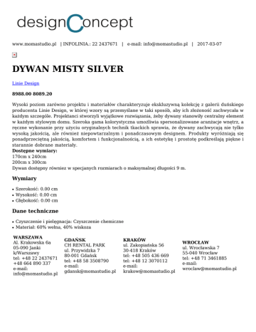 www.momastudio.pl | INFOLINIA.: 22 2437671 | e-mail: [email protected] | 2017-03-07 DYWAN MISTY SILVER Linie Design 8988.00 8089.20 Wysoki poziom zarówno projektu i materiałów charakteryzuje ekskluzywną kolekcję z galerii duńskiego producenta Linie Design, w której wzory są przemyślane w taki sposób, aby ich złożoność zachwycała w każdym szczególe. Projektanci stworzyli wyjątkowe rozwiązania, żeby dywany stanowiły centralny element w każdym stylowym domu. Szeroka gama kolorystyczna umożliwia spersonalizowane aranżacje wnętrz, a ręczne wykonanie przy użyciu oryginalnych technik tkackich sprawia, że dywany zachwycają nie tylko wysoką jakością, ale również niepowtarzalnym i ponadczasowym designem. Produkty wyróżniają się ponadprzeciętną jakością, komfortem i funkcjonalnością, a ich estetykę i prostotę podkreślają piękne i starannie dobrane materiały. Dostępne wymiary: 170cm x 240cm 200cm x 300cm Dywan dostępny równiez w specjanych rozmiarach o maksymalnej długości 9 m. Wymiary ● ● ● Szerokość: 0.00 cm Wysokość: 0.00 cm Głębokość: 0.00 cm Dane techniczne ● ● Czyszczenie i pielęgnacja: Czyszczenie chemiczne Materiał: 60% wełna, 40% wiskoza WARSZAWA Al. Krakowska 6a 05-090 Janki k/Warszawy tel: +48 22 2437671 +48 664 890 337 e-mail: [email protected] GDAŃSK CH RENTAL PARK ul. Przywidzka 7 80-001 Gdańsk tel: +48 58 3508790 e-mail: [email protected] KRAKÓW ul. Zakopiańska 56 30-418 Kraków tel: +48 505 436 669 tel: +48 12 3070112 e-mail: [email protected] WROCŁAW ul. Wrocławska 7 55-040 Wrocław tel: +48 71 3461885 e-mail: [email protected]