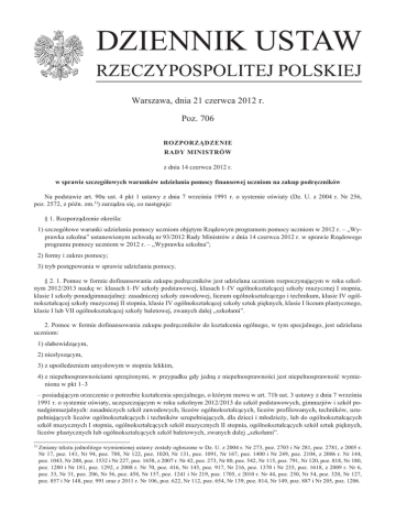 DZIENNIK USTAW RZECZYPOSPOLITEJ POLSKIEJ Warszawa, dnia 21 czerwca 2012 r. Poz. 706 ROZPORZĄDZENIE RADY MINISTRÓW z dnia 14 czerwca 2012 r. w sprawie szczegółowych warunków udzielania pomocy finansowej uczniom na zakup podręczników Na podstawie art. 90u ust. 4 pkt 1 ustawy z dnia 7 września 1991 r. o systemie oświaty (Dz. U. z 2004 r. Nr 256, poz. 2572, z późn. zm.1)) zarządza się, co następuje: § 1. Rozporządzenie określa: 1) szczegółowe warunki udzielania pomocy uczniom objętym Rządowym programem pomocy uczniom w 2012 r. – „Wyprawka szkolna” ustanowionym uchwałą nr 93/2012 Rady Ministrów z dnia 14 czerwca 2012 r. w sprawie Rządowego programu pomocy uczniom w 2012 r. – „Wyprawka szkolna”; 2) formy i zakres pomocy; 3) tryb postępowania w sprawie udzielania pomocy. § 2. 1. Pomoc w formie dofinansowania zakupu podręczników jest udzielana uczniom rozpoczynającym w roku szkolnym 2012/2013 naukę w: klasach I–IV szkoły podstawowej, klasach I–IV ogólnokształcącej szkoły muzycznej I stopnia, klasie I szkoły ponadgimnazjalnej: zasadniczej szkoły zawodowej, liceum ogólnokształcącego i technikum, klasie IV ogólnokształcącej szkoły muzycznej II stopnia, klasie IV ogólnokształcącej szkoły sztuk pięknych, klasie I liceum plastycznego, klasie I lub VII ogólnokształcącej szkoły baletowej, zwanych dalej „szkołami”. 2. Pomoc w formie dofinansowania zakupu podręczników do kształcenia ogólnego, w tym specjalnego, jest udzielana uczniom: 1) słabowidzącym, 2) niesłyszącym, 3) z upośledzeniem umysłowym w stopniu lekkim, 4) z niepełnosprawnościami sprzężonymi, w przypadku gdy jedną z niepełnosprawności jest niepełnosprawność wymieniona w pkt 1–3 – posiadającym orzeczenie o potrzebie kształcenia specjalnego, o którym mowa w art. 71b ust. 3 ustawy z dnia 7 września 1991 r. o systemie oświaty, uczęszczającym w roku szkolnym 2012/2013 do szkół podstawowych, gimnazjów i szkół ponadgimnazjalnych: zasadniczych szkół zawodowych, liceów ogólnokształcących, liceów profilowanych, techników, uzupełniających liceów ogólnokształcących i techników uzupełniających, dla dzieci i młodzieży, lub do ogólnokształcących szkół muzycznych I stopnia, ogólnokształcących szkół muzycznych II stopnia, ogólnokształcących szkół sztuk pięknych, liceów plastycznych lub ogólnokształcących szkół baletowych, zwanych dalej „szkołami”. 1) Zmiany tekstu jednolitego wymienionej ustawy zostały ogłoszone w Dz. U. z 2004 r. Nr 273, poz. 2703 i Nr 281, poz. 2781, z 2005 r. Nr 17, poz. 141, Nr 94, poz. 788, Nr 122, poz. 1020, Nr 131, poz. 1091, Nr 167, poz. 1400 i Nr 249, poz. 2104, z 2006 r. Nr 144, poz. 1043, Nr 208, poz. 1532 i Nr 227, poz. 1658, z 2007 r. Nr 42, poz. 273, Nr 80, poz. 542, Nr 115, poz. 791, Nr 120, poz. 818, Nr 180, poz. 1280 i Nr 181, poz. 1292, z 2008 r. Nr 70, poz. 416, Nr 145, poz. 917, Nr 216, poz. 1370 i Nr 235, poz. 1618, z 2009 r. Nr 6, poz. 33, Nr 31, poz. 206, Nr 56, poz. 458, Nr 157, poz. 1241 i Nr 219, poz. 1705, z 2010 r. Nr 44, poz. 250, Nr 54, poz. 320, Nr 127, poz. 857 i Nr 148, poz. 991 oraz z 2011 r. Nr 106, poz. 622, Nr 112, poz. 654, Nr 139, poz. 814, Nr 149, poz. 887 i Nr 205, poz. 1206. Dziennik Ustaw –2– Poz. 706 3. Pomocy udziela się uczniom, o których mowa w ust. 1, pochodzącym z rodzin, w których dochód na osobę nie przekracza kryterium dochodowego na osobę w rodzinie, o którym mowa w art. 8 ust. 1 pkt 2 ustawy z dnia 12 marca 2004 r. o pomocy społecznej (Dz. U. z 2009 r. Nr 175, poz. 1362, z późn. zm.2)), z wyłączeniem uczniów klasy I szkoły podstawowej i uczniów klasy I ogólnokształcącej szkoły muzycznej I stopnia. 4. Pomocy udziela się uczniom klasy I szkoły podstawowej i uczniom klasy I ogólnokształcącej szkoły muzycznej I stopnia, pochodzącym z rodzin, w których dochód na osobę nie przekracza kryterium dochodowego na osobę w rodzinie, o którym mowa w art. 5 ust. 1 ustawy z dnia 28 listopada 2003 r. o świadczeniach rodzinnych (Dz. U. z 2006 r. Nr 139, poz. 992, z późn. zm.3)). 5. W przypadkach określonych w art. 7 ustawy z dnia 12 marca 2004 r. o pomocy społecznej pomoc może być udzielona uczniom, o których mowa w ust. 1, z wyłączeniem uczniów klasy I szkoły podstawowej i uczniów klasy I ogólnokształcącej szkoły muzycznej I stopnia, pochodzącym z rodzin, w których dochód na osobę w rodzinie przekracza kryterium dochodowe, o którym mowa w ust. 3. 6. Liczba uczniów, którym zostanie udzielona pomoc w trybie, o którym mowa w ust. 5, nie może przekroczyć w danej gminie 5% ogólnej liczby uczniów, o których mowa w ust. 1, z wyjątkiem uczniów klasy I szkoły podstawowej i uczniów klasy I ogólnokształcącej szkoły muzycznej I stopnia oraz uczniów szkół prowadzonych przez ministra właściwego do spraw kultury i ochrony dziedzictwa narodowego. 7. W przypadku szkół prowadzonych przez ministra właściwego do spraw kultury i ochrony dziedzictwa narodowego liczba uczniów, którym zostanie udzielona pomoc w trybie, o którym mowa w ust. 5, nie może przekroczyć 5% ogólnej liczby uczniów klas II–IV ogólnokształcącej szkoły muzycznej I stopnia, klasy IV ogólnokształcącej szkoły muzycznej II stopnia, klasy IV ogólnokształcącej szkoły sztuk pięknych, klasy I liceum plastycznego oraz klas I i VII ogólnokształcącej szkoły baletowej, prowadzonych przez tego ministra. 8. Wartość pomocy nie może przekroczyć kwoty: 1) 180 zł – dla ucznia klas I–III szkoły podstawowej oraz dla ucznia klas I–III ogólnokształcącej szkoły muzycznej I stopnia; 2) 180 zł – dla ucznia: a) słabowidzącego, b) niesłyszącego, c) z upośledzeniem umysłowym w stopniu lekkim, d) z niepełnosprawnościami sprzężonymi, w przypadku gdy jedną z niepełnosprawności jest niepełnosprawność wymieniona w lit. a–c – posiadającego orzeczenie o potrzebie kształcenia specjalnego, o 