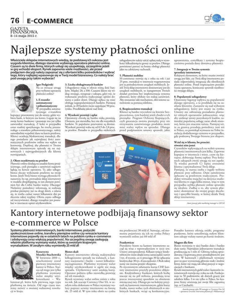 76 E-COMMERCE 8–14 maja 2015 r. Najlepsze systemy płatności online Właściciele sklepów internetowych wiedzą, że podstawą ich sukcesu jest wygoda klientów, dlatego starannie wybierają operatora płatności online. Czasem są to dwie firmy, których usługi się uzupełniają, szczególnie jeżeli w grę wchodzi eksport. Rynek zapewnia wiele możliwości, ale przed podjęciem decyzji należy zapoznać się z ofertami kilku pośredników i wybrać tego, który najlepiej wpasowuje się w Twój model biznesowy. Co należy brać pod uwagę przy takim wyborze? Igor Podgórski Na co zwracać uwagę przy wyborze operatora płatności online? 1. E-transfer automatyczny i półautomatyczny W przypadku automatycznego e-transferu kupujący przeniesiony jest do strony, gdzie wybiera bank, w którym ma konto. Loguje się na swoje konto bankowe i pozostaje mu już tylko zatwierdzić transakcję. Z kolei w przypadku coraz rzadziej spotykanego, bo trochę przestarzałego e-transferu półautomatycznego, należy samodzielnie wypełnić dane na karcie przelewu. Klienci oczekują błyskawicznej transakcji, dlatego posiadanie jak największej ilości automatycznych przelewów online ma wpływ na konwersję. Dopilnuj, aby płatności w Twoim sklepie internetowym opierały się na najnowszych i najwygodniejszych dla klienta rozwiązaniach. 3. Liczba obsługiwanych banków Usługodawcy mają w ofercie różną ilość banków. Między 20, a 100. Czasami klient nie widząc swojego, rezygnuje z zakupu, gdyż wie, że wykonanie przelewu tradycyjnego opóźni dostawę o jeden dzień. Dlatego opłaca się mieć obsługę najpopularniejszych banków. Pamiętaj jednak, że 20 banków może zaspokajać 90 proc. rynku. Przedkładaj jakość nad ilość. 4. Wysokość prowizji i opłat Operatorzy chwalą się bardzo niską prowizją. Owszem, jest niewielka, lecz nie dla wszystkich banków. Te popularne przeważnie są droższe. Wysokość prowizji waha się od 0,9 do 2,8 proc. za przelew. Ponadto w przypadku niektórych usługodawców należy uiścić opłatę stałą w wysokości kilkudziesięciu groszy za przelew. Dlatego powinieneś patrzeć na koszty obsługi płatności jako na całościowy rachunek. 5. Płatności mobilne M-commerce rozwija się z roku na rok i już 25 proc. transakcji w internecie wygenerowana jest za pośrednictwem urządzeń mobilnych. Jeżeli Twój sklep internetowy dostosowany jest do urządzeń mobilnych, to następstwem Twoich działań powinna być implementacja systemu płatności, który obsłuży ten rodzaj zamówień. Aby zrozumieć taki mechanizm, złóż testowe zamówienie za pomocą telefonu. 6. Bezpieczeństwo transakcji Klienci są bardzo wyczuleni na kwestie bezpieczeństwa, tym bardziej jeżeli chodzi o ich pieniądze. Program Ochrony Kupujących, czyli gwarancja zwrotu pieniędzy przy nie otrzymaniu zamówionego produktu może mieć realny wpływ na sprzedaż. Dlatego przed podpisaniem umowy sprawdź, jakie uprawnienia, certyfikaty i systemy bezpieczeństwa posiada dany dostawca płatności. 7. Integracje w Twoim systemie sprzedaży internetowej Kolejnym elementem, na który musisz zwrócić uwagę jest fakt, czy Twój sklep internetowy posiada odpowiednią integrację dla określonych płatności online. Przed rozpoczęciem poszukiwania operatora, koniecznie sprawdź możliwości swojego sklepu. 8. Popularność usługodawcy Opatrzony logotyp wpływa na popularność danego operatora, a ta przekłada się na zaufanie klientów. Zastanów się nad wyborem usługodawcy, który jest znany na rynku. Umowy nie zabraniają posiadania płatności różnych operatorów jednocześnie, więc aby uniknąć utraty pozyskanych leadów, zainstaluj popularną usługę zaraz obok niszowej, która jest znacznie tańsza. Pamiętaj też, że za granicą przodują pośrednicy inni niż w Polsce, co poniekąd wymusza na Tobie instalację dodatkowego systemu w przypadku, gdy podstawą Twojego biznesu jest eksport. Wciel się w klienta, bo przecież również nim jesteś Czynników wpływających na wybór systemu płatności internetowych jest kilka. Zapewne kupujesz w internecie i wiesz, czym się kierujesz, dobierając formę zapłaty. Przy kolejnych zakupach zwróć uwagę na ten aspekt. Ta wiedza pozwoli Ci lepiej zrozumieć klienta i optymalizować Twój sklep. Pamiętaj, że starsza osoba z reguły wybiera płatność przy odbiorze. Duże zamówienia opłacane są przelewem tradycyjnym. Produkty wirtualne mają być na skrzynce mailowej klienta w ciągu kilku minut, więc w tym przypadku szybka płatność online sprawdzi się idealnie. Zadbaj o to, aby system płatności dostosować do swojej grupy docelowej i specyfiki branży, w której działa Twój sklep internetowy. 2. Okres oczekiwania na przelew Płatności online działają na zasadzie konta przejściowego, czyli pieniądze z zamówień najpierw lądują na koncie operatora. Ty, jako usługobiorca zlecasz wykonanie przelewu na swoje konto. Jeżeli Twój biznes wymaga płynności finansowej, bo np. prowadzisz sklep internetowy w modelu dropshipping, to ten element powinien być dla Ciebie bardzo ważny. Dlaczego? Niektórzy pośrednicy informują, że realizują przekaz pieniężny już na drugi dzień, a zdarza się, że trzeba czekać nawet kilkanaście dni po zleceniu takiej wypłaty. Oferta często odbiega od rzeczywistości, dlatego rozsądnie jest poszukać w internecie opinii użytkowników. Autor pracuje jako marketing manager w IAI SA Kantory internetowe podbijają finansowy sektor e-commerce w Polsce Systemy płatności internetowych, banki internetowe, pożyczki społecznościowe online, transfery pieniężne online czy wreszcie kantory internetowe pojawiły się w ostatnich latach na polskim rynku e-commerce i zdobywają coraz większą popularność. Na szczególną uwagę zasługują właśnie platformy wymiany walut, które są swoistym krajowym wynalazkiem. W zeszłym roku wymieniły 25 mld zł! Katarzyna Mo