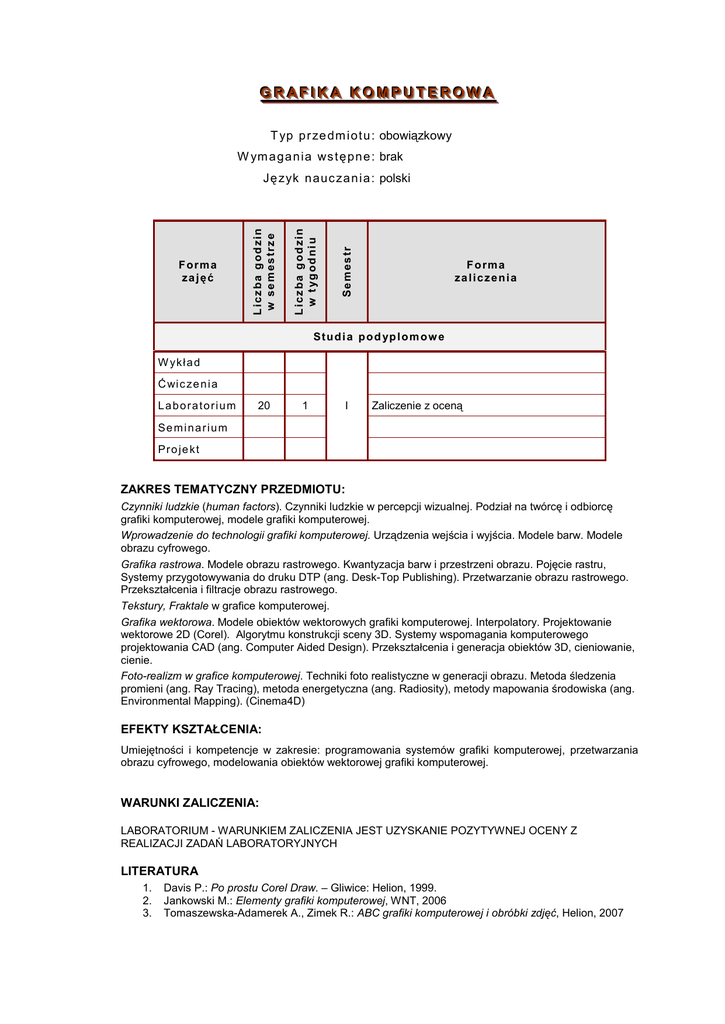 G GR RA AFFIIK KA A K KO OM MP PU UTTE ER RO OW WA A T yp pr ze dm i ot u : obowiązkowy W ym a ga n ia ws t ę pn e : brak Semestr Liczba godzin w tygodniu Forma zajęć Liczba godzin w semestrze J ę z yk n auc za n i a : polski Forma zaliczenia S t u d i a p o d yp l o m o w e W yk ł a d Ć wi c z e n i a Laboratorium 20 1 I Zaliczenie z oceną Seminarium Projekt ZAKRES TEMATYCZNY PRZEDMIOTU: Czynniki ludzkie (human factors). Czynniki ludzkie w percepcji wizualnej. Podział na twórcę i odbiorcę grafiki komputerowej, modele grafiki komputerowej. Wprowadzenie do technologii grafiki komputerowej. Urządzenia wejścia i wyjścia. Modele barw. Modele obrazu cyfrowego. Grafika rastrowa. Modele obrazu rastrowego. Kwantyzacja barw i przestrzeni obrazu. Pojęcie rastru, Systemy przygotowywania do druku DTP (ang. Desk-Top Publishing). Przetwarzanie obrazu rastrowego. Przekształcenia i filtracje obrazu rastrowego. Tekstury, Fraktale w grafice komputerowej. Grafika wektorowa. Modele obiektów wektorowych grafiki komputerowej. Interpolatory. Projektowanie wektorowe 2D (Corel). Algorytmu konstrukcji sceny 3D. Systemy wspomagania komputerowego projektowania CAD (ang. Computer Aided Design). Przekształcenia i generacja obiektów 3D, cieniowanie, cienie. Foto-realizm w grafice komputerowej. Techniki foto realistyczne w generacji obrazu. Metoda śledzenia promieni (ang. Ray Tracing), metoda energetyczna (ang. Radiosity), metody mapowania środowiska (ang. Environmental Mapping). (Cinema4D) EFEKTY KSZTAŁCENIA: Umiejętności i kompetencje w zakresie: programowania systemów grafiki komputerowej, przetwarzania obrazu cyfrowego, modelowania obiektów wektorowej grafiki komputerowej. WARUNKI ZALICZENIA: LABORATORIUM - WARUNKIEM ZALICZENIA JEST UZYSKANIE POZYTYWNEJ OCENY Z REALIZACJI ZADAŃ LABORATORYJNYCH LITERATURA 1. 2. 3. Davis P.: Po prostu Corel Draw. – Gliwice: Helion, 1999. Jankowski M.: Elementy grafiki komputerowej, WNT, 2006 Tomaszewska-Adamerek A., Zimek R.: ABC grafiki komputerowej i obróbki zdjęć, Helion, 2007