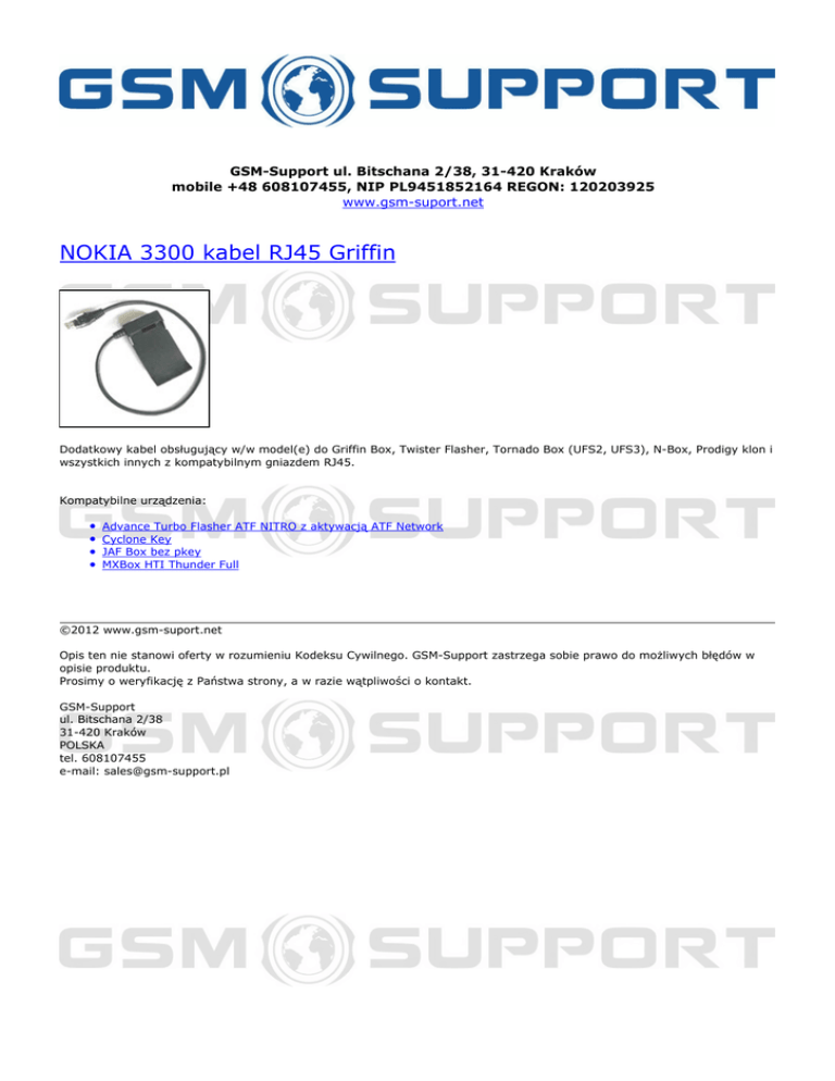 GSM-Support ul. Bitschana 2/38, 31-420 Kraków mobile +48 608107455, NIP PL9451852164 REGON: 120203925 www.gsm-suport.net NOKIA 3300 kabel RJ45 Griffin Dodatkowy kabel obsługujący w/w model(e) do Griffin Box, Twister Flasher, Tornado Box (UFS2, UFS3), N-Box, Prodigy klon i wszystkich innych z kompatybilnym gniazdem RJ45. Kompatybilne urządzenia: Advance Turbo Flasher ATF NITRO z aktywacją ATF Network Cyclone Key JAF Box bez pkey MXBox HTI Thunder Full ©2012 www.gsm-suport.net Opis ten nie stanowi oferty w rozumieniu Kodeksu Cywilnego. GSM-Support zastrzega sobie prawo do możliwych błędów w opisie produktu. Prosimy o weryfikację z Państwa strony, a w razie wątpliwości o kontakt. GSM-Support ul. Bitschana 2/38 31-420 Kraków POLSKA tel. 608107455 e-mail: [email protected] Powered by TCPDF (www.tcpdf.org)