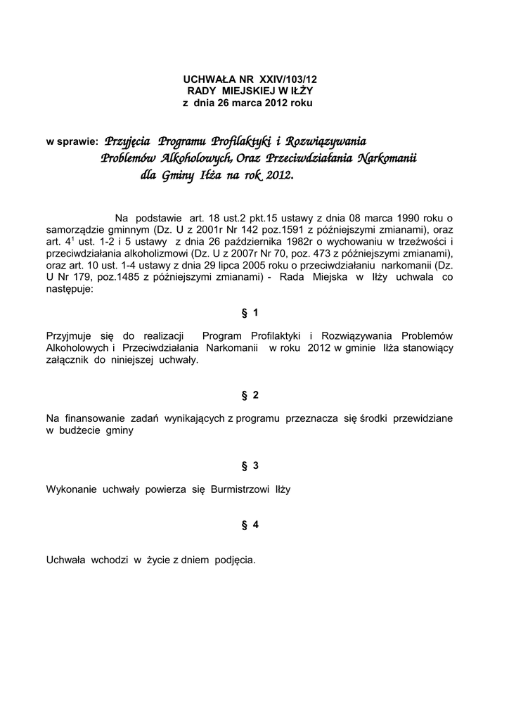 UCHWAŁA NR XXIV/103/12 RADY MIEJSKIEJ W IŁŻY z dnia 26 marca 2012 roku w sprawie: Przyjęcia Programu Profilaktyki i Rozwiązywania Problemów Alkoholowych, Oraz Przeciwdziałania Narkomanii dla Gminy Iłża na rok 2012. Na podstawie art. 18 ust.2 pkt.15 ustawy z dnia 08 marca 1990 roku o samorządzie gminnym (Dz. U z 2001r Nr 142 poz.1591 z późniejszymi zmianami), oraz art. 41 ust. 1-2 i 5 ustawy z dnia 26 października 1982r o wychowaniu w trzeźwości i przeciwdziałania alkoholizmowi (Dz. U z 2007r Nr 70, poz. 473 z późniejszymi zmianami), oraz art. 10 ust. 1-4 ustawy z dnia 29 lipca 2005 roku o przeciwdziałaniu narkomanii (Dz. U Nr 179, poz.1485 z późniejszymi zmianami) - Rada Miejska w Iłży uchwala co następuje: § 1 Przyjmuje się do realizacji Program Profilaktyki i Rozwiązywania Problemów Alkoholowych i Przeciwdziałania Narkomanii w roku 2012 w gminie Iłża stanowiący załącznik do niniejszej uchwały. § 2 Na finansowanie zadań wynikających z programu przeznacza się środki przewidziane w budżecie gminy § 3 Wykonanie uchwały powierza się Burmistrzowi Iłży § 4 Uchwała wchodzi w życie z dniem podjęcia. Załącznik do Uchwały Nr XXIV/103/12 Rady Miejskiej w Iłży z dnia 26.03.2012 r. PROGRAM PROFILAKTYKI I ROZWIĄZYWANIA PROBLEMÓW ALKOHOLOWYCH DLA GMINY IŁŻA Na rok 2012 I. WSTĘP Gminny Program Profilaktyki i Rozwiązywania Problemów Alkoholowych, oraz przeciwdziałania narkomanii poprzez realizację określonych w nim celów wychodzi naprzeciw najbardziej istotnym problemom społeczności lokalnej w obszarze profilaktyki uzależnień, oraz dysfunkcji związanych z nadużywaniem alkoholu. Program jest kontynuacją zadań realizowanych w gminie Iłża od kilku lat. Zgodnie z ustawą o wychowaniu trzeźwości i przeciwdziałaniu alkoholizmowi z dnia 26 października 1982 roku, która stanowi spis zadań będących jednocześnie zadaniami własnymi gminy. Realizacja programu winna wpłynąć na zmniejszenie indywidualnych zagrożeń zdrowotnych i ekonomicznych wynikających z nadużywania alkoholu, na poprawę kondycji fizycznej, psychicznej i moralnej dzieci i młodzieży, oraz zwiększenie bezpieczeństwa w sferze życia rodzinnego i publicznego. II CELE PROGRAMU: ◄ Jako cel główny programu jest: „Ograniczenie i zapobieganie wzrostowi sięgania po napoje alkoholowe przez dzieci i młodzież. ◄ Cel główny zostanie osiągnięty przez realizację celów szczegółowych. Cel główny: Ograniczenie i zapobieganie wzrostowi sięgania po napoje alkoholowe przez młodzież. Cel ogólny programu w roku 2012 realizowany będzie w dwóch obszarach: 1. Profilaktyka 2. Monitoring Wskaźniki: Tempo wzrostu rozpowszechniania i spożywania napojów alkoholowych wśród młodzieży w różnych grupach wiekowych. Źródło pozyskania wskaźnika: ankiety. P R O F I L A K T Y K A Cel szczegółowy Rozwój form pomocy psychologicznej i terapeutycznej dla osób uzależnionych Wskaźnik Liczba wniosków Liczba badań Źródło pozyskania wskaźnika Umowa zlecenie Faktury Budżet 60.480,00 od alkoholu. Realizacja programu przeciwdziałania przemocy w rodzinie, oraz udoskonalanie pracy zespołu interdyscyplinarnego Organizacja i prowadzenie działań profilaktycznych i ich realizacja wraz z Pozalekcyjnymi zajęciami sportowymi Działalność świetlic socjoterapeutycznych Działalność opiekuńczo – wychowawcza Realizowana w instytucjach, oraz rozwój działalności świetlic wiejskich Wspomaganie działalności instytucji, stowarzyszeń działających na rzecz rozwiązywania problemów alkoholowych i przeciwdziałania narkomani. Edukacja publiczna w zakresie profilaktyki i rozwiązywania problemów alkoholowych, przeciwdziałania narkomanii – zakup broszur, wydawnictw niezbędnych do pracy w ramach otwartych spotkań informacyjno – integracyjnych wraz z finałem konkursu dla młodzieży szkolnej z wiedzy o uzależnieniach Inne wydatki związane z realizacją Programu Profilaktyki i Rozwiązywania Problemów Alkoholowych Liczba spotkań faktury 21.500,00 Liczba szkoleń 50.150,00 Liczba zajęć Dziennik zajęć Umowa zlecenie Liczba zajęć Dziennik zajęć faktury Umowa zlecenie faktury Ilość świetlic Harmonogram pracy Harmonogram imprez Liczba spotkań 8.000,00 70.500,00 faktury 9.000,00 faktury 7.000,00 Lista płac 13.370,00 III. ZADANIA PROGRAMU PROFILAKTYKI I PRZECIWDZIAŁANIA ALKOHOLIZMOWI ◄ Realizacji każdego z celów służą zadania: 1. Rozwój form pomocy psychologicznej i terapeutycznej dla osób uzależnionych od alkoholu i członków ich rodzin; 2. Realizacja programu przeciwdziałania przemocy w rodzinie, oraz udoskonalanie pracy zespołu Interdyscyplinarnego; 3. Organizacja i prowadzenie działań profilaktycznych i ich realizacja wraz z pozalekcyjnymi zajęciami sportowymi; 4. Działalność świetlic socjoterapeutycznych; 5. Działalność opiekuńczo – wychowawcza, realizowana w instytucjach, oraz rozwój działalności świetlic wiejskich; 6. Wspomaganie działalności instytucji, stowarzyszeń działających na rzecz rozwiązywania problemów alkoholowych; 7. Edukacja publiczna w zakresie profilaktyki i rozwiązywania problemów alkoholowych i przeciwdziałania Narkomanii – zakup broszur niezbędnych do pracy w ramach otwartych spotkań informacyjno – Integracyjnych wraz z finałem konkursu dla młodzieży szkolnej z wiedzy o uzależnieniach. 1. ROZWÓJ FORM POMOCY PSYCHOLOGICZNEJ I TERAPEUTYCZNEJ DLA OSÓB UZALEŻNIONYCH OD ALKOHOLU I CZŁONKÓW ICH RODZIN: 1) Motywowanie osób uzależnionych od alkoholu do podjęcia leczenia w placówkach lecznictwa odwykowego; 2) Realizacja ponadpodstawowej oferty dla osób uzależnionych w formie dodatkowych zajęć terapeutycznych realizowanych w Punkcie Informacyjno- Konsultacyjnym; 3) Finansowanie kosztów zabiegu dla osób uzależnionych od alkoholu uczestniczących w zajęciach terapeutycznych celem utrzymania abstynencji; 4) Finansowanie badań specjalistycznych w przedmiocie w