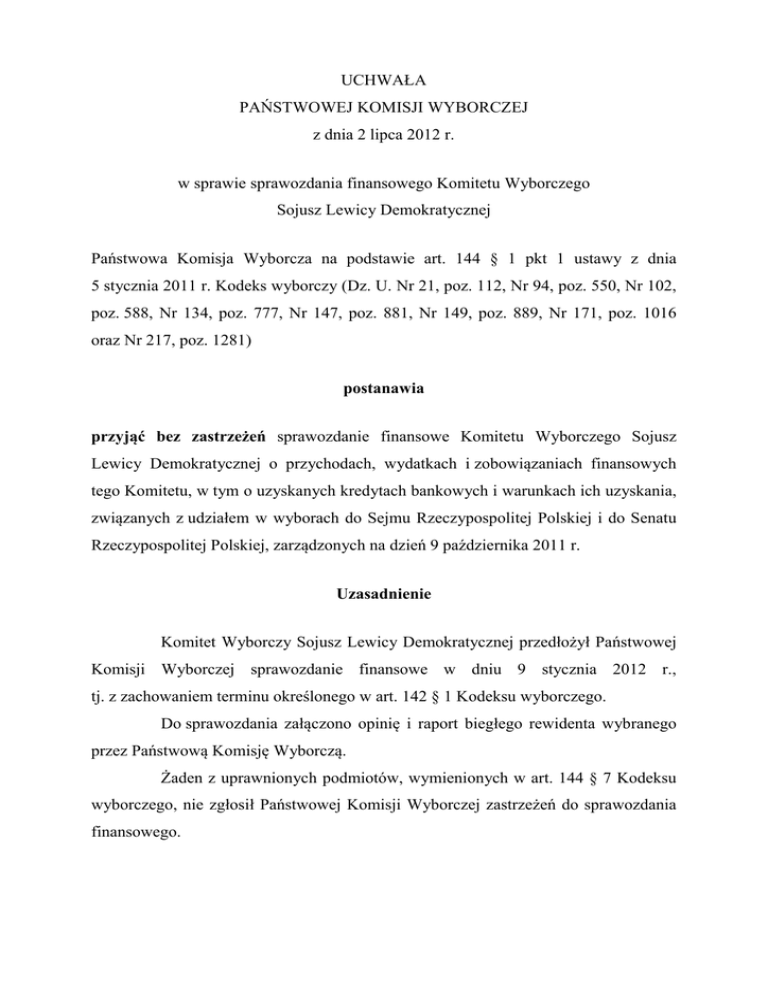 UCHWAŁA PAŃSTWOWEJ KOMISJI WYBORCZEJ z dnia 2 lipca 2012 r. w sprawie sprawozdania finansowego Komitetu Wyborczego Sojusz Lewicy Demokratycznej Państwowa Komisja Wyborcza na podstawie art. 144 § 1 pkt 1 ustawy z dnia 5 stycznia 2011 r. Kodeks wyborczy (Dz. U. Nr 21, poz. 112, Nr 94, poz. 550, Nr 102, poz. 588, Nr 134, poz. 777, Nr 147, poz. 881, Nr 149, poz. 889, Nr 171, poz. 1016 oraz Nr 217, poz. 1281) postanawia przyjąć bez zastrzeżeń sprawozdanie finansowe Komitetu Wyborczego Sojusz Lewicy Demokratycznej o przychodach, wydatkach i zobowiązaniach finansowych tego Komitetu, w tym o uzyskanych kredytach bankowych i warunkach ich uzyskania, związanych z udziałem w wyborach do Sejmu Rzeczypospolitej Polskiej i do Senatu Rzeczypospolitej Polskiej, zarządzonych na dzień 9 października 2011 r. Uzasadnienie Komitet Wyborczy Sojusz Lewicy Demokratycznej przedłożył Państwowej Komisji Wyborczej sprawozdanie finansowe w dniu 9 stycznia 2012 r., tj. z zachowaniem terminu określonego w art. 142 § 1 Kodeksu wyborczego. Do sprawozdania załączono opinię i raport biegłego rewidenta wybranego przez Państwową Komisję Wyborczą. Żaden z uprawnionych podmiotów, wymienionych w art. 144 § 7 Kodeksu wyborczego, nie zgłosił Państwowej Komisji Wyborczej zastrzeżeń do sprawozdania finansowego. 2 W wyniku badania sprawozdania, dołączonych do niego dokumentów oraz po zapoznaniu się z opinią i raportem biegłego rewidenta, Państwowa Komisja Wyborcza stwierdziła, co następuje. Komitet Wyborczy Sojusz Lewicy Demokratycznej w okresie sprawozdawczym pozyskał środki finansowe w kwocie 19 460 019,28 zł. Środki te pochodziły z Funduszu Wyborczego partii Sojusz Lewicy Demokratycznej w kwocie 19 460 015,13 zł oraz z odsetek bankowych od środków zgromadzonych na rachunku bankowym Komitetu. Do przychodów Komitetu zaliczono także kwotę 4,15 zł powstałą z różnic kursowych w wyniku rozliczeń z kontrahentem zagranicznym. Pozyskane przez Komitet środki, gromadzone były na rachunku bankowym nr 07 1020 1026 0000 1502 0188 9344, otwartym w banku PKO Bank Polski S.A. Do umowy rachunku bankowego Komitetu wprowadzono zastrzeżenia wymienione w art. 134 § 6 Kodeksu wyborczego. Wpłaty na rzecz Komitetu były dokonywane w formie zgodnej z treścią art. 134 § 5 Kodeksu wyborczego oraz w terminach określonych w art. 129 § 2 Kodeksu wyborczego. Wydatki Komitetu wyniosły 24 163 755,58 zł, zostały przeznaczone na finansowanie kampanii wyborczej i nie przekroczyły limitu określonego na podstawie art. 135 § 1, w związku z art. 199 i art. 259 Kodeksu wyborczego. Wydatki Komitetu na kampanię wyborczą prowadzoną w formach i na zasadach właściwych dla reklamy, w tym w prasie w rozumieniu prawa prasowego, nie przekroczyły limitu wydatków o którym mowa w art. 136 Kodeksu wyborczego. W sprawozdaniu Komitet wykazał należności w wysokości 103 796,66 zł (zał. Nr 9) oraz zobowiązania w kwocie 4 807 532,96 zł (zał. Nr 6). Z tej sumy zobowiązań, jak wynika z opinii i raportu biegłego rewidenta, kwota 4 703 472,48 zł została przed dniem złożenia sprawozdania spłacona ze środków Funduszu Wyborczego Sojuszu Lewicy Demokratycznej. Nieuregulowane na dzień sporządzenia sprawozdania zobowiązania wyniosły 104 060,48 zł. 3 Pełnomocnik Komitetu w dniu 16 sierpnia 2011 r., tj. w terminie zgodnym z art. 102 § 1 Kodeksu wyborczego, zawiadomił Państwową Komisję Wyborczą o adresie strony internetowej Komitetu. Państwowa Komisja Wyborcza, po ustaleniu powyższego na podstawie sprawozdania finansowego Komitetu, dokumentów do niego załączonych oraz opinii i raportu biegłego rewidenta, postanowiła jak w sentencji. Od niniejszego postanowienia nie przysługuje środek prawny. Przewodniczący Państwowej Komisji Wyborczej: Stefan J. Jaworski Zastępcy Przewodniczącego Państwowej Komisji Wyborczej: Andrzej Kisielewicz, Stanisław Kosmal Członkowie Państwowej Komisji Wyborczej: Maria Grzelka, Andrzej Mączyński, Janusz Niemcewicz, Stanisław Zabłocki