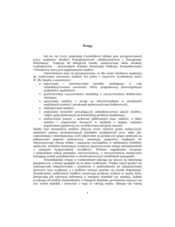 Wstęp JuŜ po raz trzeci proponuję Czytelnikowi lekturę prac przygotowanych przez studentów Studiów Podyplomowych „Medioznawstwo i Zarządzanie Informacją”. Tradycją lat ubiegłych zostały zamieszczone takŜe artykuły wykładowców – pracowników Katedry Ekonomiki Edukacji, Komunikowania i Doradztwa, która jest organizatorem studiów. Uprawnionym staje się przypuszczenie, Ŝe dla części słuchaczy inspiracją do studiowania zawartości mediów był jeden z motywów wymieniany przez D. Mc Quaila, a mianowicie: • opisywanie i porównywanie dorobku medialnego w celu scharakteryzowania zawartości oferty programowej poszczególnych podmiotów medialnych, • porównywanie rzeczywistości medialnej z rzeczywistością obiektywnie istniejącą, • opisywanie mediów z uwagi na odzwierciedlanie w przekazach medialnych wartości i przekonań społecznych oraz kulturowych, • oddziaływanie mediów, • znalezienie kryteriów powalających scharakteryzować jakość mediów, wpływ grup społecznych na konstrukcję przekazu medialnego, • analizowanie postaw i zachowań publiczności mass mediów, a takŜe tekstów i wypowiedzi słownych w mediach z punktu widzenia poprawności językowej czy wydobywania ukrytych znaczeń. Studia nad zawartością mediów dotyczą wielu róŜnych pytań badawczych, natomiast autorzy prezentowanych artykułów podejmowali m.in. takie jak: reprezentacja i stereotypizacja, czyli odpowiedź na pytanie czy grupy społeczne są pokazywane poprzez podstawowe stereotypy pojęciowe, tendencje do stereotypowego obrazu kobiet i męŜczyzn (szczególnie w reklamach), konflikty społeczne, medialna konstrukcja wydarzeń (porównywanie relacji dziennikarskich z relacjami bezpośrednich świadków). Właśnie zagadnienia związane z pokazaniem relacji pomiędzy rzeczywistością, a rzeczywistością obiektywnie istniejącą zostały przedstawione w dwóch pierwszych rozdziałach monografii. Dziennikarskie relacje o wydarzeniach opierają się zawsze na określonej perspektywie, z której spogląda się na dane wydarzenie. Trudno zatem pozbyć się schematyzmu relacjonowania i rytualizmu w podchodzeniu do relacjonowania procesów oraz wydarzeń, a u podstaw narracji ujawnia się zasada dramaturgii. Współcześnie, publiczność środków masowego przekazu wybiera te media, które dostarczają jak najwięcej informacji w kategorii skandalu czy sensacji. Jednak oczekując od mediów komunikatów w kategorii skandalu, powinniśmy nauczyć się Ŝyć wśród skandali i korzystać z tego co oferują media. Dlatego tak waŜną 4 i konieczną staje się edukacja medialna, aby odbiorcy potrafili odnaleźć się w świecie coraz bardziej zdominowanym przez mass media i nowe technologie informacyjno-komunikacyjne, aby stali się świadomymi i dojrzałymi odbiorcami, którzy wybierają to co dla nich najbardziej wartościowe. Jeden z autorów przypomina, Ŝe problematyka ta została podjęta m.in. na międzynarodowej konferencji europejskiej w grudniu 2010 roku zakończonej podpisaniem deklaracji, której sam tytuł jest bardzo znamienny „Deklaracja Brukselska w sprawie edukacji medialnej przez całe Ŝycie”. W opinii prof. Paolo Mancini z Uniwersytetu w Perugi, neutralne dziennikarstwo i neutralne media nie wrócą. Wielkie media słabną, a małych jest coraz więcej. Technologia sprzyja fragmentacji, a fragmentacja sprzyja dziennikarstwu zaangaŜowanemu, wyraŜającemu silne toŜsamości. Dotyczy to zarówno mediów tradycyjnych i nowych. Wśród tradycyjnych mediów – prasy, radia, telewizji – zwycięŜają te, które mają silną toŜsamość. Dlaczego w Ameryce Fox News tak szybko pokonał CNN? Bo CNN starał się być bezstronny, a w ofercie Fox News prezentowane były wyraziste poglądy. W związku z tym trzeba być przygotowanym na dziennikarstwo świadomie, skierowane do odbiorców o sprecyzowanych poglądach czy sympatiach. Dobrze to widać w świecie nowych mediów. W internecie, gdzie jest duŜo więcej podmiotów, trzeba mieć silną toŜsamość, by być zauwaŜonym. Które blogi są najczęściej czytane? – te które czytelnie wyraŜają sympatie duŜych grup odbiorców. Zagadnienia związane z procesami komunikacyjnymi zachodzącymi w internecie były przedmiotem zainteresowania autorów tekstów zamieszczonych w rozdziale trzecim monografii. W nauce o komunikowaniu na medium spogląda się jak na techniczny instrument do przesyłania znaków w przestrzeni i czasie, w aspekcie materializowania się myśli, które przybierają postać wypowiedzi, tekstów bądź innych form oraz w wymiarze społeczno-organizacyjnym, co wyraŜa się w istnieniu organizacji medialnych, zawodów czy kapitałów. Właśnie ten ostatni z wymienionych wymiarów został zauwaŜony w szczególny sposób przez autorów tekstów zamieszczonych w ostatnim rozdziale monografii. Zaprezentowane w publikacji obszary badawcze są kolejnym argumentem za kontynuowaniem rozwaŜań naukowych definiujących pozycje środków społecznego przekazu w społeczeństwie informacyjnym. Prowadzenie analizy zawartości mediów jest konieczne z uwagi na masowy charakter rozpowszechniania przekazów medialnych, popularność mediów oraz ewentualne skutki publiczne. Dziękuję prof. dr hab. Krystynie KrzyŜanowskiej i dr Tadeuszowi Skoczkowi za naukowe zrecenzowanie wszystkich tekstów. Ewa Jaska 5