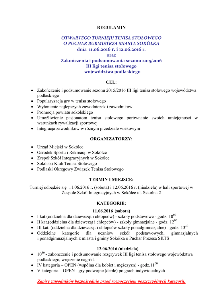 REGULAMIN OTWARTEGO TURNIEJU TENISA STOŁOWEGO O PUCHAR BURMISTRZA MIASTA SOKÓŁKA dnia 11.06.2016 r. i 12.06.2016 r. oraz Zakończenia i podsumowania sezonu 2015/2016 III ligi tenisa stołowego województwa podlaskiego CEL: Zakończenie i podsumowanie sezonu 2015/2016 III ligi tenisa stołowego województwa podlaskiego Popularyzacja gry w tenisa stołowego Wyłonienie najlepszych zawodniczek i zawodników. Promocja powiatu sokólskiego Umożliwienie pasjonatom tenisa stołowego porównanie swoich umiejętności w warunkach rywalizacji sportowej Integracja zawodników w różnym przedziale wiekowym ORGANIZATORZY: Urząd Miejski w Sokółce Ośrodek Sportu i Rekreacji w Sokółce Zespół Szkół Integracyjnych w Sokółce Sokólski Klub Tenisa Stołowego Podlaski Okręgowy Związek Tenisa Stołowego TERMIN I MIEJSCE: Turniej odbędzie się 11.06.2016 r. (sobota) i 12.06.2016 r. (niedziela) w hali sportowej w Zespole Szkół Integracyjnych w Sokółce ul. Szkolna 2 KATEGORIE: 11.06.2016 (sobota) I kat.(oddzielna dla dziewcząt i chłopców) - szkoły podstawowe - godz. 1000 II kat.(oddzielna dla dziewcząt i chłopców) - szkoły gimnazjalne - godz. 1200 III kat. (oddzielna dla dziewcząt i chłopców szkoły ponadgimnazjalne) - godz. 1330 Oddzielne kategorie dla uczniów szkół podstawowych, gimnazjalnych i ponadgimnazjalnych z miasta i gminy Sokółka o Puchar Prezesa SKTS 12.06.2016 (niedziela) 10 - zakończenie i podsumowanie rozgrywek III ligi tenisa stołowego województwa podlaskiego, wręczenie nagród. IV kategoria – OPEN (wspólna dla kobiet i mężczyzn) - godz.1100 V kategoria – OPEN - gry podwójne (deble) po grach indywidualnych 30 Zapisy zawodników bezpośrednio przed rozpoczęciem poszczególnych kategorii. SYSTEM ZAWODÓW: Turniej zostanie rozegrany systemem pucharowym do dwóch przegranych meczy. Po prawej stronie tabeli o miejsce 1, oraz po lewej stronie tabeli o miejsce 2-3. Mecz do trzech wygranych setów. Set do 11. Organizator zastrzega sobie możliwość zmiany systemu rozgrywek. NAGRODY: a) Kategoria OPEN – gry pojedyncze: za zajęcie I – VI miejsca puchary i dyplomy b) Kategoria OPEN Deble za zajęcie I – III miejsca puchary i dyplomy c) Kategorie szkolne w turnieju otwartym: za zajęcie I - III miejsce puchary i dyplomy d) W kategoriach szkolnych z miasta i gminy Sokółka za zajęcie I - miejsca puchar i dyplom za zajęcie II – III miejsca - dyplomy POSTANOWIENIA KOŃCOWE: 1. W kategorii OPEN obowiązuje wpisowe – 10, - zł., w kategorii OPEN Deble – 5 zł od osoby. 2. Wszystkich zawodników obowiązuje strój sportowy oraz obuwie na zmianę. 3. Zawodnicy muszą posiadać własne rakietki. 4. Sprawy sporne wynikłe w czasie trwania turnieju rozstrzyga sędzia główny i organizator. 5. Uczestnicy turnieju są zobowiązani do przestrzegania zasad i regulaminów ustalonych przez gospodarza obiektu i organizatora turnieju. 6. Nagrody ufundowane przez Burmistrza Sokółki i Podlaski Okręgowy Związek Tenisa Stołowego. 7. Organizator nie ponosi odpowiedzialności za rzeczy zagubione lub pozostawione w szatni. 8. Ubezpieczenie oraz dojazd zawodników na koszt własny. 9. Organizator nie ponosi odpowiedzialności za kontuzje, wypadki, problemy zdrowotne uczestników podczas trwania zawodów. Zawodnik startuje na własną odpowiedzialność. 10. Zawodnicy w kategoriach szkolnych startują zgodnie ze swoim przedziałem wiekowym. Zawodnik / Zawodniczka nie ma możliwości startu w innych kategoriach szkolnych – nie dotyczy kategorii OPEN. 11. Start w kategorii OPEN mają wszyscy zawodnicy niezależnie od przedziału wiekowego i płci. Więcej informacji pod numerem 508-056-162- Anna Kurczewska