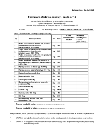 Załącznik nr 1a do SIWZ Formularz ofertowo-cenowy - część nr 15 na zamówienia publiczne przetarg nieograniczony ogłoszony przez Zamawiającego Internat Międzyszkolny w Starym Sączu, ul. Daszyńskiego 19 w dniu …………………….. na dostawę towaru – MĄKA, KASZE I PRODUKTY ZBOŻOWE cena oferty wynika z następującej kalkulacji: Lp Nazwa produktu Jm Płatki czekoladowe Nestle lub produkt o równoważnych walorach Kg jakościowych 0,25-1,0kg Płatki kukurydziane Nestle lub produkt o równoważnych walorach kg jakościowych 0,25-1,0kg Płatki cynamonowe Nestle lub produkt o równoważnych walorach kg jakościowych 0,25-1,0kg Płatki miodowe Nestle lub produkt o równoważnych walorach jakościowych kg 0,25-1,0kg 1. 2. 3. 4. Ilość Cena jednostkowa brutto Wartość brutto(ilość x cena jedn.brutto) 200 200 200 200 5. Mąka pszenna tortowa typ 450 1kg Kg 250 6 Mąka pszenna poznańska typ 500 1kg Kg 450 7 Mąka ziemniaczana 0,5kg Kg 60 8 Kasza wiejska 1kg Kg 200 9 Kasza gryczana 1kg Kg 80 10 Ryż gruboziarnisty, ziarno całe, nie połamane 1kg Kg 400 11 Kasza manna 1kg Kg 40 12 Cukier 1 kg Kg 1400 13 Cukier puder 0,5-1kg Kg 40 14 Sól 1kg Kg 200 15 Ryż brązowy, ziarno całe, nie połamane 1 kg Kg 100 Razem wartość netto: …………………..………………… Razem wartość brutto: …………………..………………… ………………………………………………………………………………………………………… Miejscowość, data, pieczęć i podpis osoby upoważnionej do składania ofert w imieniu Wykonawcy * UWAGA! ceny jednostkowe brutto i wartość brutto należy podać do drugiego miejsca po przecinku ** UWAGA! w przypadku omyłek rachunkowych zamawiający uzna za prawidłowo podane; ilość i cenę jednostkową brutto.