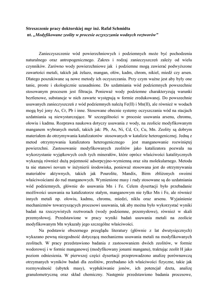 Streszczenie pracy doktorskiej mgr inż. Rafał Schmidta nt. „Modyfikowane zeolity w procesie oczyszczania wodnych roztworów” Zanieczyszczenie wód powierzchniowych i podziemnych może być pochodzenia naturalnego oraz antropogenicznego. Zakres i rodzaj zanieczyszczeń zależy od wielu czynników. Zarówno wody powierzchniowe jak i podziemne mogą zawierać podwyższone zawartości metali, takich jak żelazo, mangan, ołów, kadm, chrom, nikiel, miedź czy arsen. Dlatego poszukiwane są nowe metody ich oczyszczania. Przy czym ważne jest aby były one tanie, proste i ekologicznie uzasadnione. Do uzdatniania wód podziemnych powszechnie stosowanym procesem jest filtracja. Ponieważ wody podziemne charakteryzują warunki beztlenowe, substancje w nich zawarte występują w formie zredukowanej. Do powszechnie usuwanych zanieczyszczeń z wód podziemnych należą Fe(II) i Mn(II), ale również w wodach mogą być jony As, Cr, Pb i inne. Stosowane obecnie systemy oczyszczania wód na stacjach uzdatniania są niewystarczające. W szczególności w procesie usuwania arsenu, chromu, ołowiu i kadmu. Rozprawa naukowa dotyczy usuwania z wody, na zeolicie modyfikowanym manganem wybranych metali, takich jak: Pb, As, Ni, Cd, Cr, Cu, Mn. Zeolity są dobrym materiałem do otrzymywania katalizatorów stosowanych w katalizie heterogenicznej. Jedną z metod otrzymywania katalizatora heterogenicznego jest manganowanie rozwiniętej powierzchni. Zastosowanie modyfikowanych zeolitów jako katalizatora pozwala na wykorzystanie wyjątkowych cech tych minerałów, które oprócz właściwości katalitycznych wykazują również dużą pojemność adsorpcyjno-wymienną oraz sita molekularnego. Metoda ta nie stanowi novum w inżynierii środowiska, ponieważ stosowana jest do otrzymywania materiałów aktywnych, takich jak Pourolite, Mandix, Birm zbliżonych swoimi właściwościami do rud manganowych. Wymienione masy i rudy stosowane są do uzdatniania wód podziemnych, głównie do usuwania Mn i Fe. Celem dysertacji było przebadanie możliwości usuwania na katalizatorze stałym, manganowym nie tylko Mn i Fe, ale również innych metali np. ołowiu, kadmu, chromu, miedzi, niklu oraz arsenu. Wyjaśnienie mechanizmów towarzyszących procesowi usuwania, tak aby można było wykorzystać wyniki badań na rzeczywistych roztworach (wody podziemne, przemysłowe), również w skali przemysłowej. Przedstawione w pracy wyniki badań usuwania metali na zeolicie modyfikowanym Mn wykazały jego szczególne właściwości. Na podstawie obszernego przeglądu literatury (głównie z lat dwutysięcznych) wykazano pewną niezgodność dotyczącą mechanizmu usuwania metali na modyfikowanych zeolitach. W pracy przedstawiono badania z zastosowaniem dwóch zeolitów, w formie wodorowej i w formie manganowej (modyfikowany jonami manganu), traktując zeolit H jako poziom odniesienia. W pierwszej części dysertacji przeprowadzono analizę porównawczą otrzymanych wyników badań dla zeolitów, przebadano ich właściwości fizyczne, takie jak rozmywalność (ubytek masy), wypłukiwanie jonów, ich potencjał dzeta, analizę granulometryczną oraz skład chemiczny. Następnie przedstawiono badania procesowe, w których czynnikami niezależnymi były: pH roztworu (cały zakres zmian wartości pH), czas adsorpcji (od 0 do 1400 min), dawka zeolitu (od 0 do 400 g/L), stężenie roztworu (od 5 do 100 mg/L), skład roztworu (roztwór jedno- lub wieloskładnikowy), rodzaj metalu (Pb, As, Ni, Cd, Cr, Cu, Mn). Czynnikami wynikowymi było stężenie usuwanego (roztwór monoskładnikowy) lub usuwanych (roztwór wieloskładnikowy) metali w próbkach sączonych i nie sączonych. W celu zinterpretowania zachodzących zmian adsorpcji przebadano wartości potencjału dzeta i wielkości cząsteczek hydroksokompleksów metali oraz za pomocą specjalistycznego oprogramowania określono rodzaje i ilości występujących hydroksokompleksów badanych metali przy określonym ich stężeniu w funkcji pH roztworu (przy założeniu występowania równowagi jonowej). Na podstawie otrzymanych zależności przedstawiono analizę statystyczną otrzymanych wyników badań metodą analizy wariancji jednoczynnikowej Anova i analizy podobieństwa (twarze Chernoffa i analiza skupień). Na podstawie uzyskanych wyników badań przedstawiono dla zeolitów szeregi powinowactwa do usuwanych jonów wg intensywności adsorpcji, pojemności sorpcyjnej, powinowactwa do adsorbatu. Badania wykazały, że równolegle z procesem adsorpcji zachodzi chemiczne strącanie, co było możliwe do wyjaśnienia tylko w warunkach statycznych. Wykazano również, że wyznaczona wartość potencjału dzeta powstających hydroksokompleksów i akwakompleksów w dużym stopniu umożliwia opisanie procesu adsorpcji. Na podstawie badań stwierdzono, że ważnym czynnikiem w usuwaniu As i Cr są właściwości katalityczne zeolitu Mn oraz pH roztworu. Wpływ odczynu jest związany z rodzajem powstających hydroksokompleksów metali. Interpretacja wyników badań jest poparta licznymi reakcjami chemicznymi. W pracy przedstawiono również wzajemny wpływ metali na ich proces adsorpcji z roztworu wieloskładnikowego. Przedstawione w dysertacji badania mogą być wykorzystane w praktyce do projektowania złóż filtracyjnych z masami aktywnymi stosowanymi w procesie oczyszczania wody podziemnej o podwyższonej zawartości metali. Zeolit modyfikowany Mn może być wykorzystany do usuwania metali również w przypadku oczyszczania ścieków o charakterze chemicznym o podwyższonej zawartości metali, nawet do 100 mg/L. Wyniki badań wykazały, że w zależności od rodzaju usuwanego kationu, zachodzi adsorpcja fizyczna, kataliza heterogeniczna lub strącanie osadu.