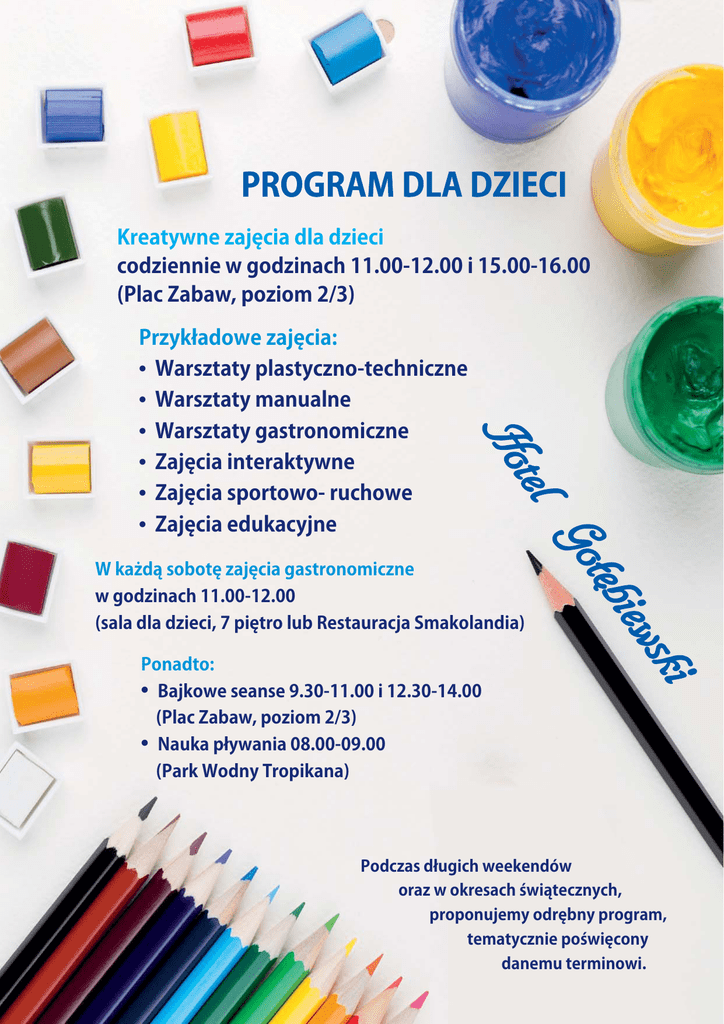 PROGRAM DLA DZIECI Kreatywne zajęcia dla dzieci codziennie w godzinach 11.00-12.00 i 15.00-16.00 (Plac Zabaw, poziom 2/3) Przykładowe zajęcia: • Warsztaty plastyczno-techniczne • Warsztaty manualne • Warsztaty gastronomiczne • Zajęcia interaktywne • Zajęcia sportowo- ruchowe • Zajęcia edukacyjne W każdą sobotę zajęcia gastronomiczne w godzinach 11.00-12.00 (sala dla dzieci, 7 piętro lub Restauracja Smakolandia) Ponadto: • Bajkowe seanse 9.30-11.00 i 12.30-14.00 (Plac Zabaw, poziom 2/3) • Nauka pływania 08.00-09.00 (Park Wodny Tropikana) Podczas długich weekendów oraz w okresach świątecznych, proponujemy odrębny program, tematycznie poświęcony danemu terminowi.
