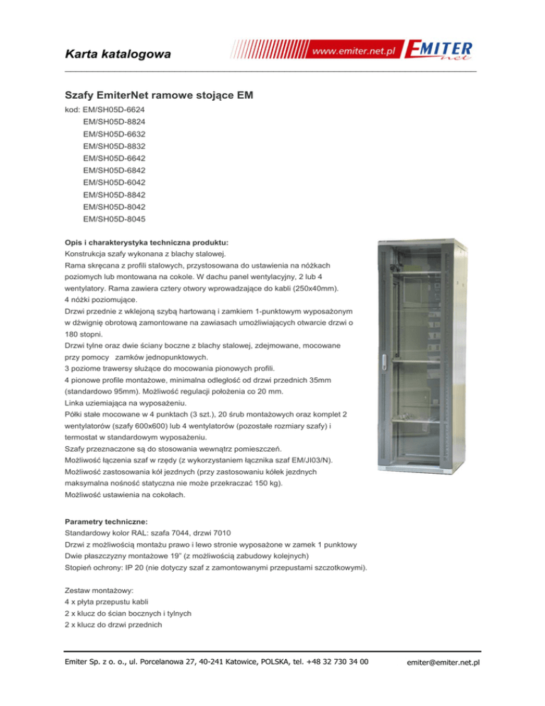 Karta katalogowa ___________________________________________________________________________ Szafy EmiterNet ramowe stojące EM kod: EM/SH05D-6624 EM/SH05D-8824 EM/SH05D-6632 EM/SH05D-8832 EM/SH05D-6642 EM/SH05D-6842 EM/SH05D-6042 EM/SH05D-8842 EM/SH05D-8042 EM/SH05D-8045 Opis i charakterystyka techniczna produktu: Konstrukcja szafy wykonana z blachy stalowej. Rama skręcana z profili stalowych, przystosowana do ustawienia na nóżkach poziomych lub montowana na cokole. W dachu panel wentylacyjny, 2 lub 4 wentylatory. Rama zawiera cztery otwory wprowadzające do kabli (250x40mm). 4 nóżki poziomujące. Drzwi przednie z wklejoną szybą hartowaną i zamkiem 1-punktowym wyposażonym w dźwignię obrotową zamontowane na zawiasach umożliwiających otwarcie drzwi o 180 stopni. Drzwi tylne oraz dwie ściany boczne z blachy stalowej, zdejmowane, mocowane przy pomocy zamków jednopunktowych. 3 poziome trawersy służące do mocowania pionowych profili. 4 pionowe profile montażowe, minimalna odległość od drzwi przednich 35mm (standardowo 95mm). Możliwość regulacji położenia co 20 mm. Linka uziemiająca na wyposażeniu. Półki stałe mocowane w 4 punktach (3 szt.), 20 śrub montażowych oraz komplet 2 wentylatorów (szafy 600x600) lub 4 wentylatorów (pozostałe rozmiary szafy) i termostat w standardowym wyposażeniu. Szafy przeznaczone są do stosowania wewnątrz pomieszczeń. Możliwość łączenia szaf w rzędy (z wykorzystaniem łącznika szaf EM/JI03/N). Możliwość zastosowania kół jezdnych (przy zastosowaniu kółek jezdnych maksymalna nośność statyczna nie może przekraczać 150 kg). Możliwość ustawienia na cokołach. Parametry techniczne: Standardowy kolor RAL: szafa 7044, drzwi 7010 Drzwi z możliwością montażu prawo i lewo stronie wyposażone w zamek 1 punktowy Dwie płaszczyzny montażowe 19” (z możliwością zabudowy kolejnych) Stopień ochrony: IP 20 (nie dotyczy szaf z zamontowanymi przepustami szczotkowymi). Zestaw montażowy: 4 x płyta przepustu kabli 2 x klucz do ścian bocznych i tylnych 2 x klucz do drzwi przednich Emiter Sp. z o. o., ul. Porcelanowa 27, 40-241 Katowice, POLSKA, tel. +48 32 730 34 00 [email protected] Karta katalogowa ___________________________________________________________________________ Oznaczenia: kod nośność szerokość głębokość wysokość masa U/mm EM/SH05D-6624 500 kg 600 600 24/1180 59 kg EM/SH05D-8824 500 kg 800 800 24/1180 70 kg EM/SH05D-8832 500 kg 600 600 32/1540 76 kg EM/SH05D-8832 500 kg 800 800 32/1540 97 kg EM/SH05D-6642 500 kg 600 600 42/1980 88 kg EM/SH05D-6842 500 kg 600 800 42/1980 105 kg EM/SH05D-6042 500 kg 600 1000 42/1980 126 kg EM/SH05D-8842 500 kg 800 800 42/1980 121 kg EM/SH05D-8042 500 kg 800 1000 42/1980 135 kg EM/SH05D-8045 500 kg 800 1000 45/2090 144 kg Uwaga 1: wymiary podane są w milimetrach! Uwaga 2: Maksymalna nośność statyczna (500kg), przy ustawieniach profili montażowych w położeniu fabrycznym i symetrycznym obciążeniu na odpowiedniej ilości półkach mocowanych w czterech punktach. Przy innych warunkach nośność szafy może ulec zmniejszeniu. Dobra oferta: 2 półki GRATIS (szafy 24U), 3 półki GRATIS (szafy 42U oraz 45U) komplet 20 śrub GRATIS wentylator 2 szt. + termostat GRATIS (szafy 24U oraz 42U 600x600) wentylator 4 szt. + termostat GRATIS (szafy 42U 600x800, 600x1000, 800x800, 800x1000 i 45U) Dołożyliśmy wszelkich starań, aby przedstawione informacje były rzetelne i kompletne. Jednak nie ponosimy odpowiedzialności za dokładność i kompletność danych oraz w szczególności nie możemy zagwarantować, że niniejsza specyfikacja nie zawiera błędów lub pomyłek. Informacje zawarte w niniejszej specyfikacji mogą zostać zmienione w każdej chwili bez powiadomienia. Emiter Sp. z o. o., ul. Porcelanowa 27, 40-241 Katowice, POLSKA, tel. +48 32 730 34 00 [email protected]