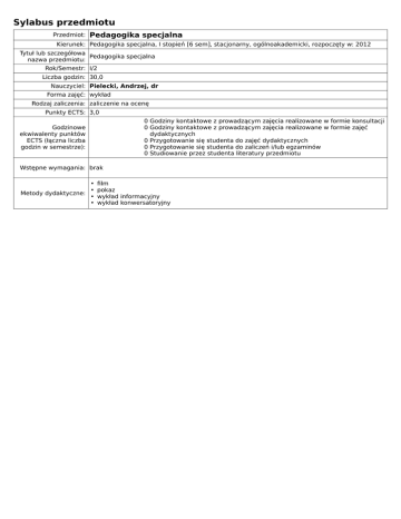 Sylabus przedmiotu Przedmiot: Pedagogika specjalna Kierunek: Pedagogika specjalna, I stopień [6 sem], stacjonarny, ogólnoakademicki, rozpoczęty w: 2012 Tytuł lub szczegółowa Pedagogika specjalna nazwa przedmiotu: Rok/Semestr: I/2 Liczba godzin: 30,0 Nauczyciel: Pielecki, Andrzej, dr Forma zajęć: wykład Rodzaj zaliczenia: zaliczenie na ocenę Punkty ECTS: 3,0 0 Godziny kontaktowe z prowadzącym zajęcia realizowane w formie konsultacji 0 Godziny kontaktowe z prowadzącym zajęcia realizowane w formie zajęć dydaktycznych 0 Przygotowanie się studenta do zajęć dydaktycznych 0 Przygotowanie się studenta do zaliczeń i/lub egzaminów 0 Studiowanie przez studenta literatury przedmiotu Godzinowe ekwiwalenty punktów ECTS (łączna liczba godzin w semestrze): Wstępne wymagania: brak • • Metody dydaktyczne: • • film pokaz wykład informacyjny wykład konwersatoryjny SurdopedagogikaPojęcie uszkodzenia słuchu. Czynniki ryzyka wg. M.P. Downs. Metody badania stopnia utraty słuchu. Klasyfikacje uszkodzeń słuchu. Wczesne wykrywanie uszkodzenia słuchu i zaopatrywanie w aparat słuchowy, jako czynniki decydujące o efektywności terapii. Rodzaje aparatów słuchowych. Specjalne potrzeby dzieci z uszkodzeniem słuchu. Głuchota a sfera poznawcza, emocjonalna i społeczna. Systemy językowe w komunikowaniu się osób z wadą słuchu. Wychowanie dzieci głuchych i niedosłyszących w przedszkolu i szkole. Czynniki warunkujące powodzenie dziecka z wadą słuchu w szkole powszechnej.Pedagogika zdolnych i uzdolnionych.Definicje i terminologia zdolności. Modele zdolności. Rozwój zdolności. Definicje pojęcia „uczeń zdolny". Cechy charakteryzujące uczniów zdolnych.Identyfikacja dzieci zdolnych. Metody wykorzystywane w celu rozpoznawania zdolnych uczniów (nominacja przyznana przez nauczycieli, wyniki sprawdzianów wiadomości, iloraz inteligencji, zwycięstwo w konkursach, nominacja przyznana przez eksperta z danej dziedziny, nominacja przyznana przez rodziców, nominacja przyznana przez grupę rówieśników. Kształcenie uczniów zdolnych;Indywidualny program lub tok nauki. Konkursy i olimpiady. Edukacja ucznia zdolnego w szkole. Praca z uczniem zdolnym na zajęciach pozalekcyjnych i pozaszkolnych.Pedagogika resocjalizacyjna. Przedmiot i zakres pedagogiki resocjalizacyjnej. Pojecie, objawy niedostosowania społecznego – klasyfikacje i ich porównanie. Objawy wykolejenia społecznego. Niedostosowanie społeczne we współczesnych teoriach psychologicznych i socjologicznych. Współczesne kierunki rozwijania działalności rewalidacyjnej. Bariery społeczne i fizyczne. Pedagogika specjalna a proces rewalidacji. Wspólne i swoiste zagadnienia w rewalidacji różnych grup osób niepełnosprawnych. Poglądy na cechy i właściwości osób niepełnosprawnych oparte na przesłankach biologicznych. Współczesne poglądy na zmianę cech osobowości u osób niepełnosprawnych. Postawy wobec niepełnosprawnych: Definicje postaw. Struktura, cechy i podział postaw. Czynniki wpływające na kształtowanie się postaw. Postrzeganie niepełnosprawności. Klasyfikacja postaw wobec osób chorych lub niepełnosprawnych. Zakres tematów: Wsparcie społeczne osób z niepełnosprawnością. Istota i zakres pojęcia "wsparcie społeczne". Modele teoretyczne wsparcia społecznego. Rodzaje i funkcje wsparcia społecznego. Systemy wsparcia społecznego. Instytucjonalne i poza instytucjonalne systemy wsparcia społecznego osób z niepełnosprawnością. Autonomia osób niepełnosprawnych. Integracyjny system, kształcenia dzieci niepełnosprawnych -założenia teoretyczne: • • • • • • współczesne rozumienie pojęcia niepełnosprawność rozumienie potrzeb dziecka jako podstawa wychowania i nauczania dzieci niepełnosprawnych dynamiczny aspekt relacji między rzeczywistymi ograniczeniami a środowiskiem dziecka niepełnosprawnego ekosystem dziecko - szkoła nauczanie otwarte a integracja społeczna Warunki tworzenia grup integracyjnych.. Rozwiązania organizacyjne. Przygotowanie nauczycieli. Współpraca z rodzicami. Problematyka specjalnych potrzeb edukacyjnych - definiowanie potrzeb edukacyjnych - zadania szkoły w zakresie potrzeb specjalnych - sposoby włączenia do klasy, szkoły dzieci niepełnosprawnych - różne rodzaje niepełnosprawności a nauczanie. Nauczanie w klasie integracyjnej. Forma oceniania: • egzamin pisemny • obecność na zajęciach Literatura podstawowa: 1. Badegruber Bernd (1997)- Nauczanie otwarte w dwudziestu ośmiu krokach. Warszawa 2. Bogucka Jadwiga, Kościelska Małgorzata (1994) - Wychowanie i nauczanie integracyjne. Warszawa 1. Bogucka Jadwiga, Kościelska Małgorzata(1996) - Wychowanie i nauczanie integracyjne. Nowe doświadczenia. Warszawa 2. Chodkowska M. (2002) -Wielowymiarowość integracji w teorii i praktyce edukacyjnej. Lublin. UMCS 3. Deutsch Smith D. (2008) – Pedagogika specjalna. APS, PWN Warszawa. 4. Fairbairn G., Fairbairn S. (2000), Integracja dzieci o specjalnych potrzebach. Warszawa 5. Gałkowski T.(,!988) Psychologia dziecka głuchego, PWN,Warszawa 6. Maciarz A.,(1992) Uczniowie niepełnosprawni w szkole powszechnej. WSiP Warszawa 7. Kirenko J. (2002) - Wsparcie społeczne osób z niepełnosprawnością. Ryki. 8. Krauze A. (2000) - Integracyjne złudzenia ponowoczesności. Kraków 9. Müller Rene Jacob (1997) - Słyszę ale nie wszystko. Warszawa 10. Nosal C. S. (1990), Psychologiczne modele umysłu. Warszawa, PWN. 11. Palak Z. (2001) Integracyjny system kształcenia.Materiały tyflologiczne 13 s.10-20 12. Palak Z.(2000) Pedagogika specjalna w reformowanym ustroju edukacyjnym. UMCS .Lublin 13. .Palak Z. BartkowiczZ. (2004)– Wsparcie społeczne w rehabilitacji i resocjalizacji. UMCS Lublin 14. Palak Z (2006)– Jakość życia osób niepełnosprawnych i nieprzystosowanych społecznie.UMCS Lublin Literatura: 15. Palak Z(2008) – Pedagog specjalny w procesie edukacji, rehabilitacji i resocjalizacji. UMCS Lublin 16. Partyka M. 