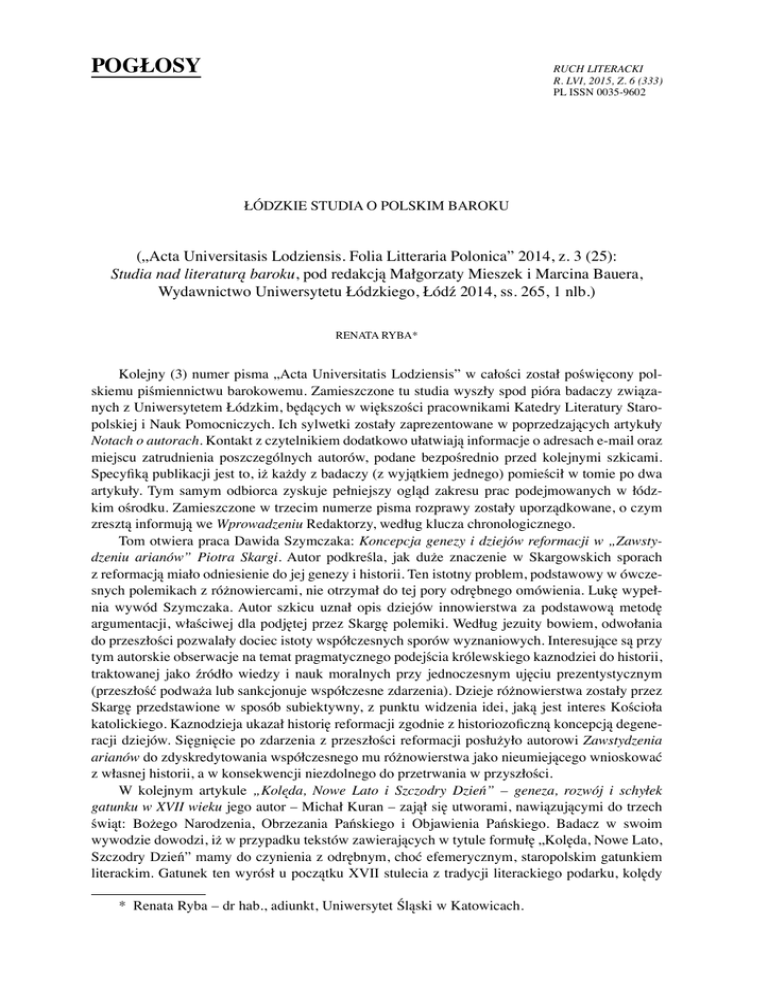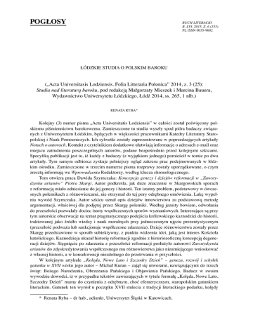 POGŁOSY RUCH LITERACKI R. LVI, 2015, Z. 6 (333) PL ISSN 0035-9602 ŁÓDZKIE STUDIA O POLSKIM BAROKU („Acta Universitasis Lodziensis. Folia Litteraria Polonica” 2014, z. 3 (25): Studia nad literaturą baroku, pod redakcją Małgorzaty Mieszek i Marcina Bauera, Wydawnictwo Uniwersytetu Łódzkiego, Łódź 2014, ss. 265, 1 nlb.) RENATA RYBA* Kolejny (3) numer pisma „Acta Universitatis Lodziensis” w całości został poświęcony polskiemu piśmiennictwu barokowemu. Zamieszczone tu studia wyszły spod pióra badaczy związanych z Uniwersytetem Łódzkim, będących w większości pracownikami Katedry Literatury Staropolskiej i Nauk Pomocniczych. Ich sylwetki zostały zaprezentowane w poprzedzających artykuły Notach o autorach. Kontakt z czytelnikiem dodatkowo ułatwiają informacje o adresach e-mail oraz miejscu zatrudnienia poszczególnych autorów, podane bezpośrednio przed kolejnymi szkicami. Specyfiką publikacji jest to, iż każdy z badaczy (z wyjątkiem jednego) pomieścił w tomie po dwa artykuły. Tym samym odbiorca zyskuje pełniejszy ogląd zakresu prac podejmowanych w łódzkim ośrodku. Zamieszczone w trzecim numerze pisma rozprawy zostały uporządkowane, o czym zresztą informują we Wprowadzeniu Redaktorzy, według klucza chronologicznego. Tom otwiera praca Dawida Szymczaka: Koncepcja genezy i dziejów reformacji w „Zawstydzeniu arianów” Piotra Skargi. Autor podkreśla, jak duże znaczenie w Skargowskich sporach z reformacją miało odniesienie do jej genezy i historii. Ten istotny problem, podstawowy w ówczesnych polemikach z różnowiercami, nie otrzymał do tej pory odrębnego omówienia. Lukę wypełnia wywód Szymczaka. Autor szkicu uznał opis dziejów innowierstwa za podstawową metodę argumentacji, właściwej dla podjętej przez Skargę polemiki. Według jezuity bowiem, odwołania do przeszłości pozwalały dociec istoty współczesnych sporów wyznaniowych. Interesujące są przy tym autorskie obserwacje na temat pragmatycznego podejścia królewskiego kaznodziei do historii, traktowanej jako źródło wiedzy i nauk moralnych przy jednoczesnym ujęciu prezentystycznym (przeszłość podważa lub sankcjonuje współczesne zdarzenia). Dzieje różnowierstwa zostały przez Skargę przedstawione w sposób subiektywny, z punktu widzenia idei, jaką jest interes Kościoła katolickiego. Kaznodzieja ukazał historię reformacji zgodnie z historiozoficzną koncepcją degeneracji dziejów. Sięgnięcie po zdarzenia z przeszłości reformacji posłużyło autorowi Zawstydzenia arianów do zdyskredytowania współczesnego mu różnowierstwa jako nieumiejącego wnioskować z własnej historii, a w konsekwencji niezdolnego do przetrwania w przyszłości. W kolejnym artykule „Kolęda, Nowe Lato i Szczodry Dzień” – geneza, rozwój i schyłek gatunku w XVII wieku jego autor – Michał Kuran – zajął się utworami, nawiązującymi do trzech świąt: Bożego Narodzenia, Obrzezania Pańskiego i Objawienia Pańskiego. Badacz w swoim wywodzie dowodzi, iż w przypadku tekstów zawierających w tytule formułę „Kolęda, Nowe Lato, Szczodry Dzień” mamy do czynienia z odrębnym, choć efemerycznym, staropolskim gatunkiem literackim. Gatunek ten wyrósł u początku XVII stulecia z tradycji literackiego podarku, kolędy * Renata Ryba – dr hab., adiunkt, Uniwersytet Śląski w Katowicach. 626 Pogłosy życzącej, i funkcjonował do połowy wieku, występując w dwóch odmianach: cyklicznej i niecyklicznej (w postaci pojedynczego wiersza). W swoich rozważaniach Kuran rozpatrzył wyznaczniki gatunku. Przeanalizował strukturę jedenastu reprezentantów tego gatunku, zarówno twórców uznanych (Kasper Twardowski, Stanisław Grochowski), jak i tych mało znanych współcześnie (Stanisław Miączyński, Piotr Żarski, Bartłomiej Ryjeński) oraz anonimowych. Godne uwagi jest zwłaszcza odkrywanie przez Kurana zapoznanych pisarzy minorum gentium. Chociaż z kolei w gronie czołowych poetów dawnych, uprawiających rozpoznany przez autora artykułu gatunek „Kolęda, Nowe Lato, Szczodry Dzień”, zabrakło Sebastiana Grabowieckiego, w twórczości którego wskazany gatunek w odmianie cyklicznej (jak chce Kuran) wyróżniła Mirosława Hanusiewicz (Świat podzielony. O poezji Sebastiana Grabowieckiego, Lublin 1994). Niewątpliwie artykuł Kurana przynosi interesującą propozycję badawczą. Drugie ze studiów tego samego autora dotyczy pisarstwa Wawrzyńca Chlebowskiego: Prolegomena do twórczości Wawrzyńca Chlebowskiego. Stan badań i kierunki dalszych prac. Kuran przybliża sylwetkę twórcy mało znanego, zapowiadając jednocześnie cały cykl rozpraw jemu poświęconych. Od początku swoich prac nad dorobkiem Chlebowskiego Kuran deklaruje konieczność rehabilitacji poety, postrzeganego w dotychczasowych opracowaniach jako plagiatora, co według łódzkiego badacza, w świetle współczesnego rozumienia dawnych praktyk imitacyjnych i kompilacyjnych, stanowi uproszczenie. W rozprawie, obok wnikliwie i żywo opisanego stanu badań, została także z rozmachem nakreślona perspektywa badawcza nad dorobkiem Chlebowskiego. Jako następny znalazł się w tomie artykuł Katarzyny Kaczor-Scheitler: „Kto skosztuje, wie, co to za smaki duchowne są”. Obrazowanie o charakterze sensualnym w podręczniku medytacji na przykładzie „Elementarzyka ćwiczenia duchownego” Mikołaja z Mościsk. Autorka przybliża postać dominikanina, teologa – Mikołaja z Mościsk – spod którego pióra wyszły dzieła o charakterze teologiczno-moralnym oraz ascetyczno-mistycznym, a wśród nich, będący przedmiotem analizy, Elementarzyk ćwiczenia duchownego (1626), przeznaczony do użytku krakowskich norbertanek zwierzynieckich – w celu doskonalenia wewnętrznego. Autorka szkicu pokazuje, jak za pomocą obrazowania sensualnego dominikanin, w sposób charakterystyczny dla estetyki swoich czasów, starał się wyrazić treści metafizyczne. W Elementarzyku… teolog 