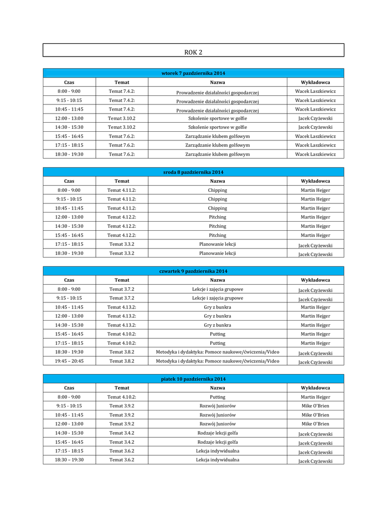 ROK 2 wtorek 7 pazdziernika 2014 Czas Temat Nazwa Wykładowca 8:00 - 9:00 Temat 7.4.2: Prowadzenie działalności gospodarczej Wacek Laszkiewicz 9:15 - 10:15 Temat 7.4.2: Prowadzenie działalności gospodarczej Wacek Laszkiewicz 10:45 - 11:45 Temat 7.4.2: Prowadzenie działalności gospodarczej Wacek Laszkiewicz 12:00 - 13:00 Temat 3.10.2 Szkolenie sportowe w golfie Jacek Czyżewski 14:30 - 15:30 Temat 3.10.2 Szkolenie sportowe w golfie Jacek Czyżewski 15:45 - 16:45 Temat 7.6.2: Zarządzanie klubem golfowym Wacek Laszkiewicz 17:15 - 18:15 Temat 7.6.2: Zarządzanie klubem golfowym Wacek Laszkiewicz 18:30 - 19:30 Temat 7.6.2: Zarządzanie klubem golfowym Wacek Laszkiewicz sroda 8 pazdziernika 2014 Czas Temat Nazwa Wykładowca 8:00 - 9:00 Temat 4.11.2: Chipping Martin Hejger 9:15 - 10:15 Temat 4.11.2: Chipping Martin Hejger 10:45 - 11:45 Temat 4.11.2: Chipping Martin Hejger 12:00 - 13:00 Temat 4.12.2: Pitching Martin Hejger 14:30 - 15:30 Temat 4.12.2: Pitching Martin Hejger 15:45 - 16:45 Temat 4.12.2: Pitching Martin Hejger 17:15 - 18:15 Temat 3.3.2 Planowanie lekcji Jacek Czyżewski 18:30 - 19:30 Temat 3.3.2 Planowanie lekcji Jacek Czyżewski Czas Temat Nazwa Wykładowca 8:00 - 9:00 Temat 3.7.2 Lekcje i zajęcia grupowe Jacek Czyżewski czwartek 9 pazdziernika 2014 9:15 - 10:15 Temat 3.7.2 Lekcje i zajęcia grupowe Jacek Czyżewski 10:45 - 11:45 Temat 4.13.2: Gry z bunkra Martin Hejger 12:00 - 13:00 Temat 4.13.2: Gry z bunkra Martin Hejger 14:30 - 15:30 Temat 4.13.2: Gry z bunkra Martin Hejger 15:45 - 16:45 Temat 4.10.2: Putting Martin Hejger 17:15 - 18:15 Temat 4.10.2: Putting Martin Hejger 18:30 - 19:30 Temat 3.8.2 Metodyka i dydaktyka: Pomoce naukowe/ćwiczenia/Video Jacek Czyżewski 19:45 – 20:45 Temat 3.8.2 Metodyka i dydaktyka: Pomoce naukowe/ćwiczenia/Video Jacek Czyżewski Czas Temat Nazwa Wykładowca 8:00 - 9:00 Temat 4.10.2: Putting Martin Hejger piatek 10 pazdziernika 2014 9:15 - 10:15 Temat 3.9.2 Rozwój Juniorów Mike O'Brien 10:45 - 11:45 Temat 3.9.2 Rozwój Juniorów Mike O'Brien 12:00 - 13:00 Temat 3.9.2 Rozwój Juniorów Mike O'Brien 14:30 - 15:30 Temat 3.4.2 Rodzaje lekcji golfa Jacek Czyżewski 15:45 - 16:45 Temat 3.4.2 Rodzaje lekcji golfa Jacek Czyżewski 17:15 - 18:15 Temat 3.6.2 Lekcja indywidualna Jacek Czyżewski 18:30 – 19:30 Temat 3.6.2 Lekcja indywidualna Jacek Czyżewski
