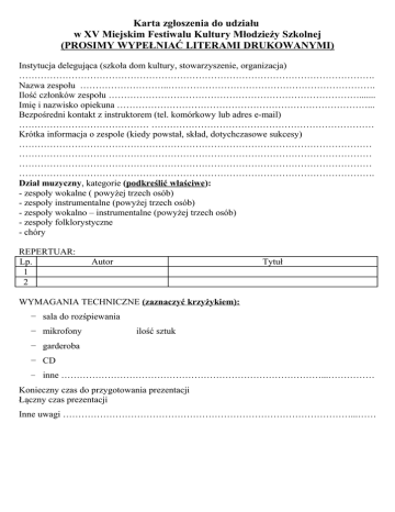 Karta zgłoszenia do udziału w XV Miejskim Festiwalu Kultury