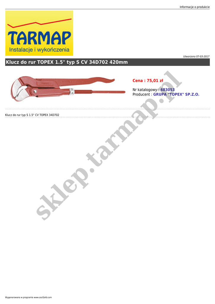 Informacje o produkcie Utworzono 07-03-2017 Klucz do rur TOPEX 1.5" typ S CV 34D702 420mm .p l Cena : 75,01 zł ap Nr katalogowy : 683053 Producent : GRUPA "TOPEX" SP.Z.O. sk le p .t a rm Klucz do rur typ S 1.5" CV TOPEX 34D702 Wygenerowano w programie www.oscGold.com