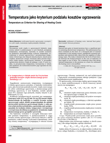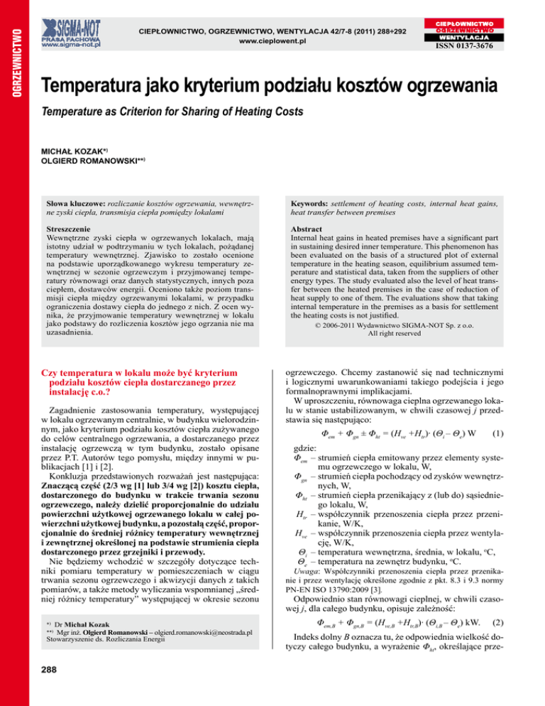 OGRZEWNICTWO Ciepłownictwo, Ogrzewnictwo, Wentylacja 42/7-8 (2011) 288÷292 www.cieplowent.pl ISSN 0137-3676 Temperatura jako kryterium podziału kosztów ogrzewania Temperature as Criterion for Sharing of Heating Costs MICHAŁ KOZAK*) OLGIERD ROMANOWSKI**) Słowa kluczowe: rozliczanie kosztów ogrzewania, wewnętrzne zyski ciepła, transmisja ciepła pomiędzy lokalami Keywords: settlement of heating costs, internal heat gains, heat transfer between premises Streszczenie Wewnętrzne zyski ciepła w ogrzewanych lokalach, mają istotny udział w podtrzymaniu w tych lokalach, pożądanej temperatury wewnętrznej. Zjawisko to zostało ocenione na podstawie uporządkowanego wykresu temperatury zewnętrznej w sezonie ogrzewczym i przyjmowanej temperatury równowagi oraz danych statystycznych, innych poza ciepłem, dostawców energii. Oceniono także poziom transmisji ciepła między ogrzewanymi lokalami, w przypadku ograniczenia dostawy ciepła do jednego z nich. Z ocen wynika, że przyjmowanie temperatury wewnętrznej w lokalu jako podstawy do rozliczenia kosztów jego ogrzania nie ma uzasadnienia. Abstract Internal heat gains in heated premises have a significant part in sustaining desired inner temperature. This phenomenon has been evaluated on the basis of a structured plot of external temperature in the heating season, equilibrium assumed temperature and statistical data, taken from the suppliers of other energy types. The study evaluated also the level of heat transfer between the heated premises in the case of reduction of heat supply to one of them. The evaluations show that taking internal temperature in the premises as a basis for settlement the heating costs is not justified. Czy temperatura w lokalu może być kryterium podziału kosztów ciepła dostarczanego przez instalację c.o.? Zagadnienie zastosowania temperatury, występującej w lokalu ogrzewanym centralnie, w budynku wielorodzinnym, jako kryterium podziału kosztów ciepła zużywanego do celów centralnego ogrzewania, a dostarczanego przez instalację ogrzewczą w tym budynku, zostało opisane przez P.T. Autorów tego pomysłu, między innymi w publikacjach [1] i [2]. Konkluzja przedstawionych rozważań jest następująca: Znaczącą część (2/3 wg [1] lub 3/4 wg [2]) kosztu ciepła, dostarczonego do budynku w trakcie trwania sezonu ogrzewczego, należy dzielić proporcjonalnie do udziału powierzchni użytkowej ogrzewanego lokalu w całej powierzchni użytkowej budynku, a pozostałą część, proporcjonalnie do średniej różnicy temperatury wewnętrznej i zewnętrznej określonej na podstawie strumienia ciepła dostarczonego przez grzejniki i przewody. Nie będziemy wchodzić w szczegóły dotyczące techniki pomiaru temperatury w pomieszczeniach w ciągu trwania sezonu ogrzewczego i akwizycji danych z takich pomiarów, a także metody wyliczania wspomnianej „średniej różnicy temperatury” występującej w okresie sezonu *) Dr Michał Kozak **) Mgr inż. Olgierd Romanowski – [email protected] Stowarzyszenie ds. Rozliczania Energii 288 © 2006-2011 Wydawnictwo SIGMA-NOT Sp. z o.o. All right reserved ogrzewczego. Chcemy zastanowić się nad technicznymi i logicznymi uwarunkowaniami takiego podejścia i jego formalnoprawnymi implikacjami. W uproszczeniu, równowaga cieplna ogrzewanego lokalu w stanie ustabilizowanym, w chwili czasowej j przedstawia się następująco: Φem + Φgn ± Φht = (Hve +Htr)· (Θi – Θe) W (1) gdzie: Φem – strumień ciepła emitowany przez elementy systemu ogrzewczego w lokalu, W, Φgn – strumień ciepła pochodzący od zysków wewnętrznych, W, Φht – strumień ciepła przenikający z (lub do) sąsiedniego lokalu, W, Htr – współczynnik przenoszenia ciepła przez przenikanie, W/K, Hve – współczynnik przenoszenia ciepła przez wentylację, W/K, Θi – temperatura wewnętrzna, średnia, w lokalu, oC, Θe – temperatura na zewnętrz budynku, oC. Uwaga: Współczynniki przenoszenia ciepła przez przenikanie i przez wentylację określone zgodnie z pkt. 8.3 i 9.3 normy PN-EN ISO 13790:2009 [3]. Odpowiednio stan równowagi cieplnej, w chwili czasowej j, dla całego budynku, opisuje zależność: Φem,B + Φgn,B = (Hve,B +Htr,B)· (Θi,B – Θe) kW. (2) Indeks dolny B oznacza tu, że odpowiednia wielkość dotyczy całego budynku, a wyrażenie Φht, określające prze- niknie ciepła pomiędzy lokalami o różnej temperaturze, znika, bo zyski i straty poszczególnych, wymieniających ciepło lokali, wzajemnie się redukują. Jeśli założyć, że strumienie powietrza wentylacyjnego w budynku są ustabilizowane (a takie założenie funkcjonuje w opracowaniu [1]), to suma współczynników przenoszenia ciepła we wzorze (2) jest „constans”. Mamy więc do czynienia z zależnością pomiędzy średnią temperaturą w budynku Θi,B, a strumieniami dostarczanego ciepła Φem,B i Φgn,B, które są, w tym wypadku, parametrami wymuszającymi. Nie dysponujemy precyzyjnymi danymi odnośnie „siły” każdego z tych dwóch parametrów, dla dowolnej chwili czasowej w trakcie trwania sezonu ogrzewczego, ale dysponujemy dobrym narzędziem do takiej oceny, w skali całego sezonu. Łączne zużycie ciepła w sezonie ogrzewczym można zapisać jako: Qem,B + Qgn,B = (Hve,B +Htr,B)·∫ΔΘdt kWh (3) gdzie: Qem,B – ilość ciepła dostarczona do budynku przez system grzewczy, kWh, Qgn,B – ilość ciepła pochodząca z zysków wewnętrznych, kWh, ΔΘ – (Θi – Θe); chwilowa, godzinowa, różnica temperatury wewnętrznej i temperatury na zewnątrz budynku, K, t – czas trwania sezonu ogrzewczego, godz.. Oczywiście, aby równość (3), była spełniona, musi być znana zależność: ΔΘ = f (t) – czyli wartość różnicy temperatury w budynku i na zewnątrz, w funkcji czasu trwania sezonu ogrzewczego. Zależność taka jest znana w postaci uporządkowanego wykresu temperatury zewnętrznej przedstawionego na rys. 1. Wykres na rysunku 1 sporządzany jest na podstawie wi